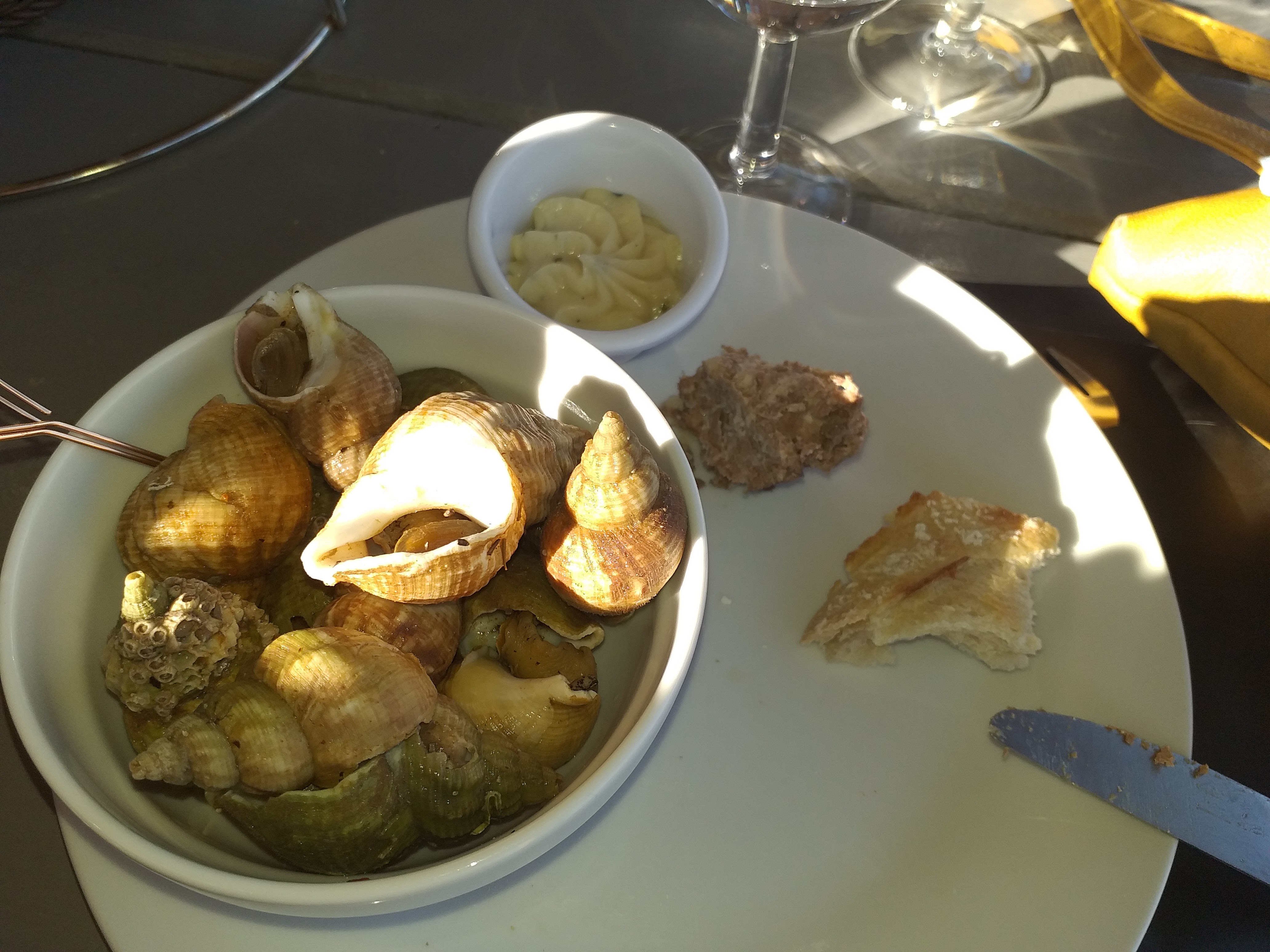 Tout est merveilleux, les huîtres, les crevettes, les bigorneaux et le vin!