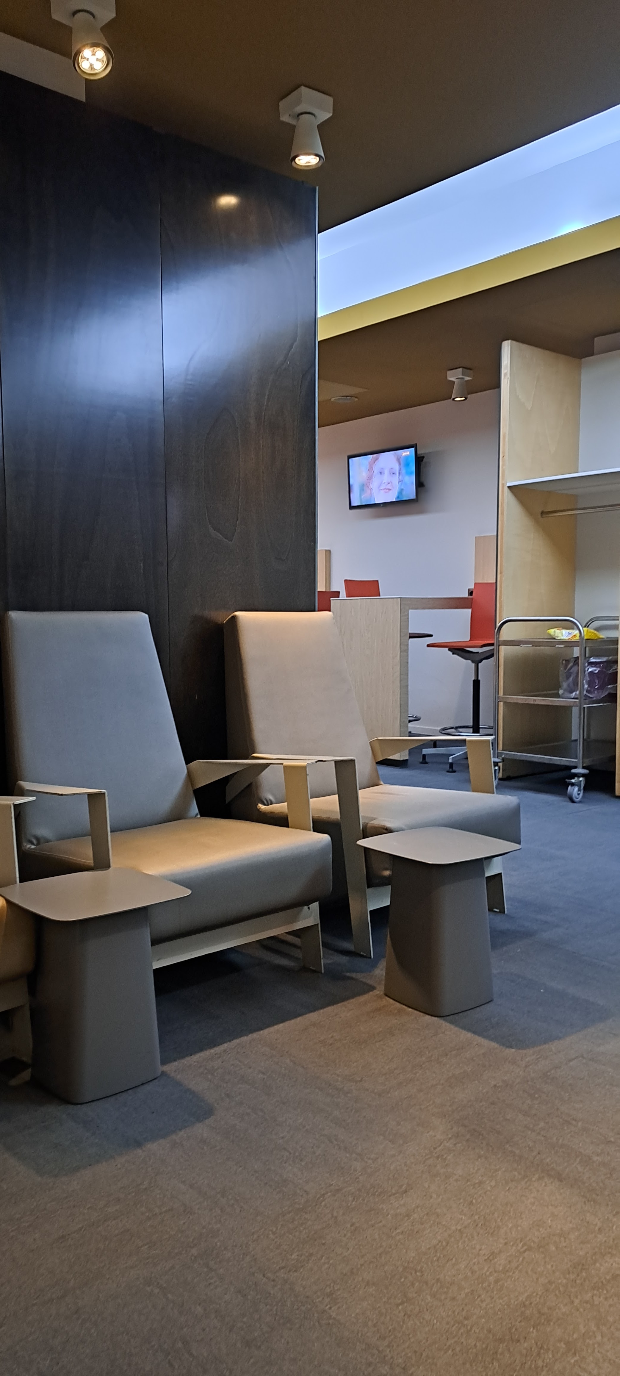 Beau salon moderne. L'étage supérieur offre des sièges confortables et 2 « buffets ». Dans la partie inférieure se trouvent les toilettes et un autre coin salon. Le personnel était sympathique et le salon était propre et bien rangé. L'offre était très modeste, il n'y avait en fait rien d'autre que des collations préemballées. Je ne recommanderais à personne de payer pour le salon. Idéal pour un café rapide avant le vol.