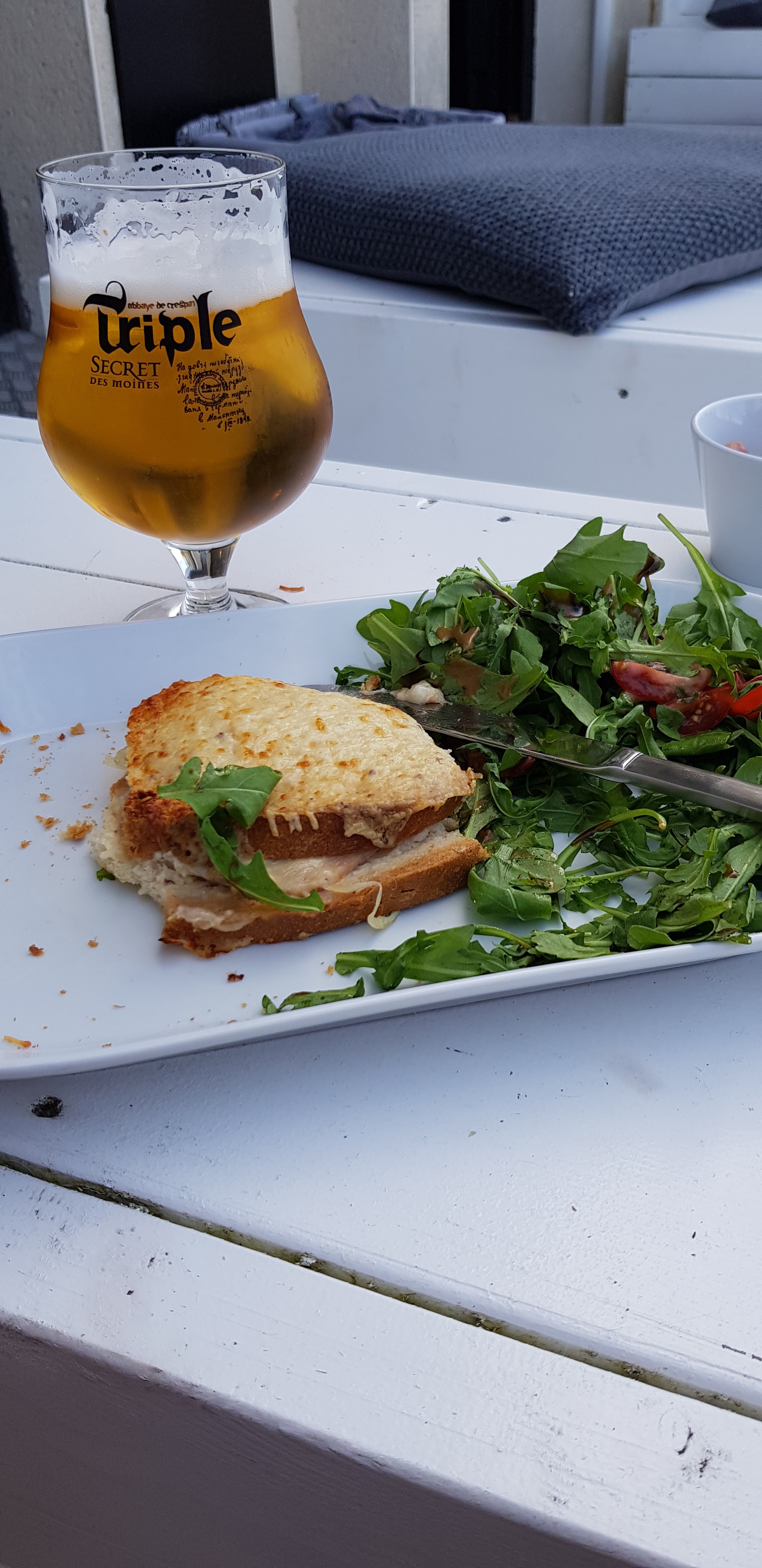 Bel intérieur, service sympathique, notre gros chien était le bienvenu et on lui a même offert un bon bol d'eau fraîche. Soupe de poisson savoureuse et joliment présentée. Nous apporterons les verres à bière Westmalle avec nous lors de notre prochaine visite 😉 👍