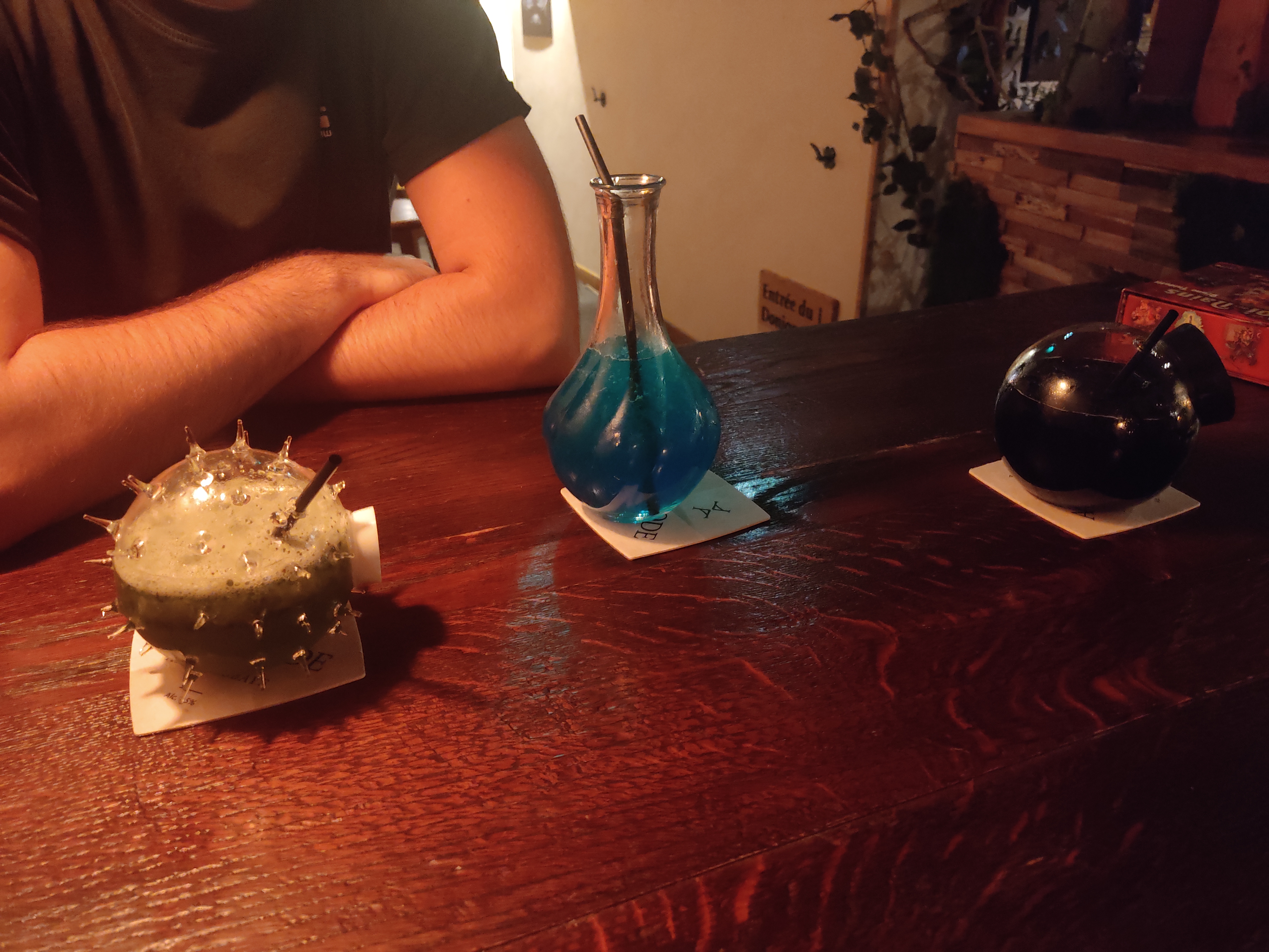 Dès le franchissement de la porte j'ai été plongé dans cet univers de jeux et de fantaisie . Le décor est sublime et l'ambiance qui se dégage du lieu est incroyable . Les noms des boissons proposées sont très bien trouvé et rajoute un côté assez sympathique à la chose . Nous voilà plonger dans le monde du jeu avec ses potion de soin. Le concept m'a tout de suite séduite et je compte devenir une habituée fidèle des lieux . Je le conseille à tous ceux qui voudraient s'échapper de leur vie monotone pour se plonger dans un univers rempli de créature fantastique et de monstres en tout genre .