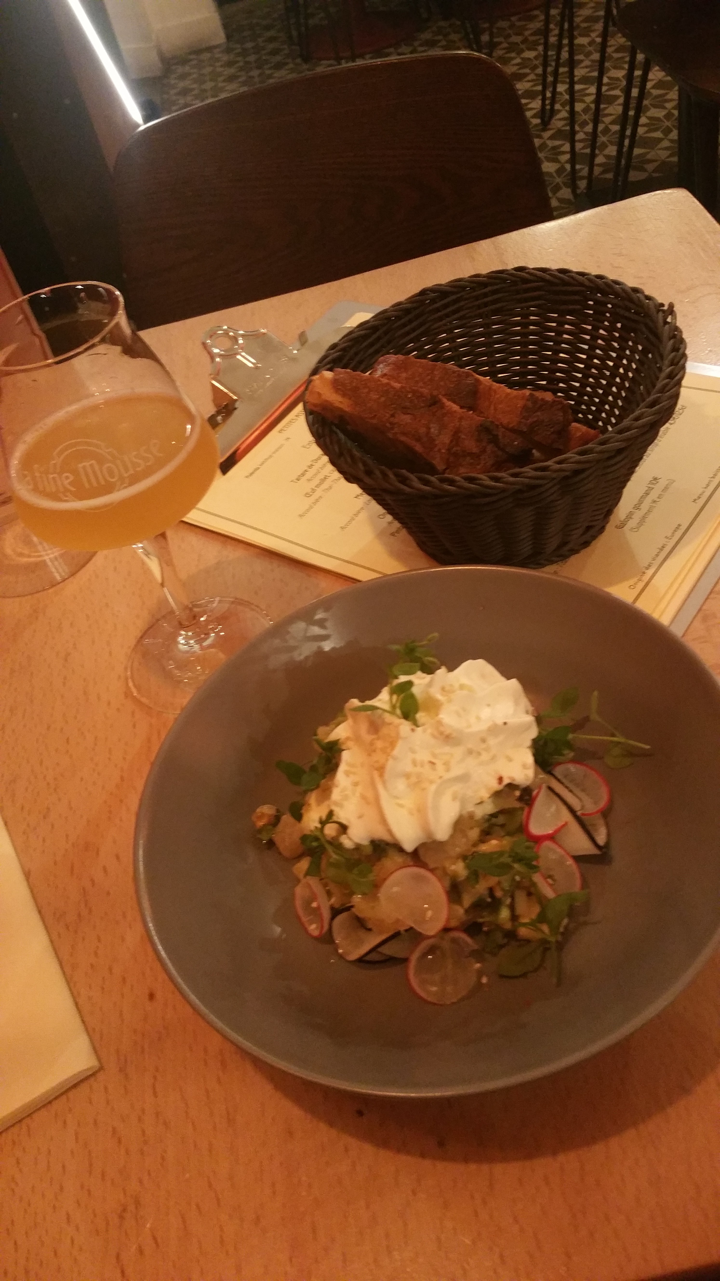 Initialement j’étais venu pour dîner mais finalement je me suis ravisé car la carte proposée ne me convenait pas. Les plats certainement très bons mais trop élaborés pour moi, il n’y a rien qui me donnait envie. C’était trop « bobo » à mon goût, je m’attendais plus à avoir des mets de type brasserie avec une dégustation de bières. Du coup et à contrecœur j’ai cédé ma place à 2 chanceux qui n’avaient pas réservé. Je me suis donc rendu en face côté bar, où la barmaid super sympa, nous a conseillé une très bonne bière ambrée et nous avons pris une planche à partager pour commencer la soirée. Dommage que nous devions quitter la terrasse à 22h par obligation préfectorale.