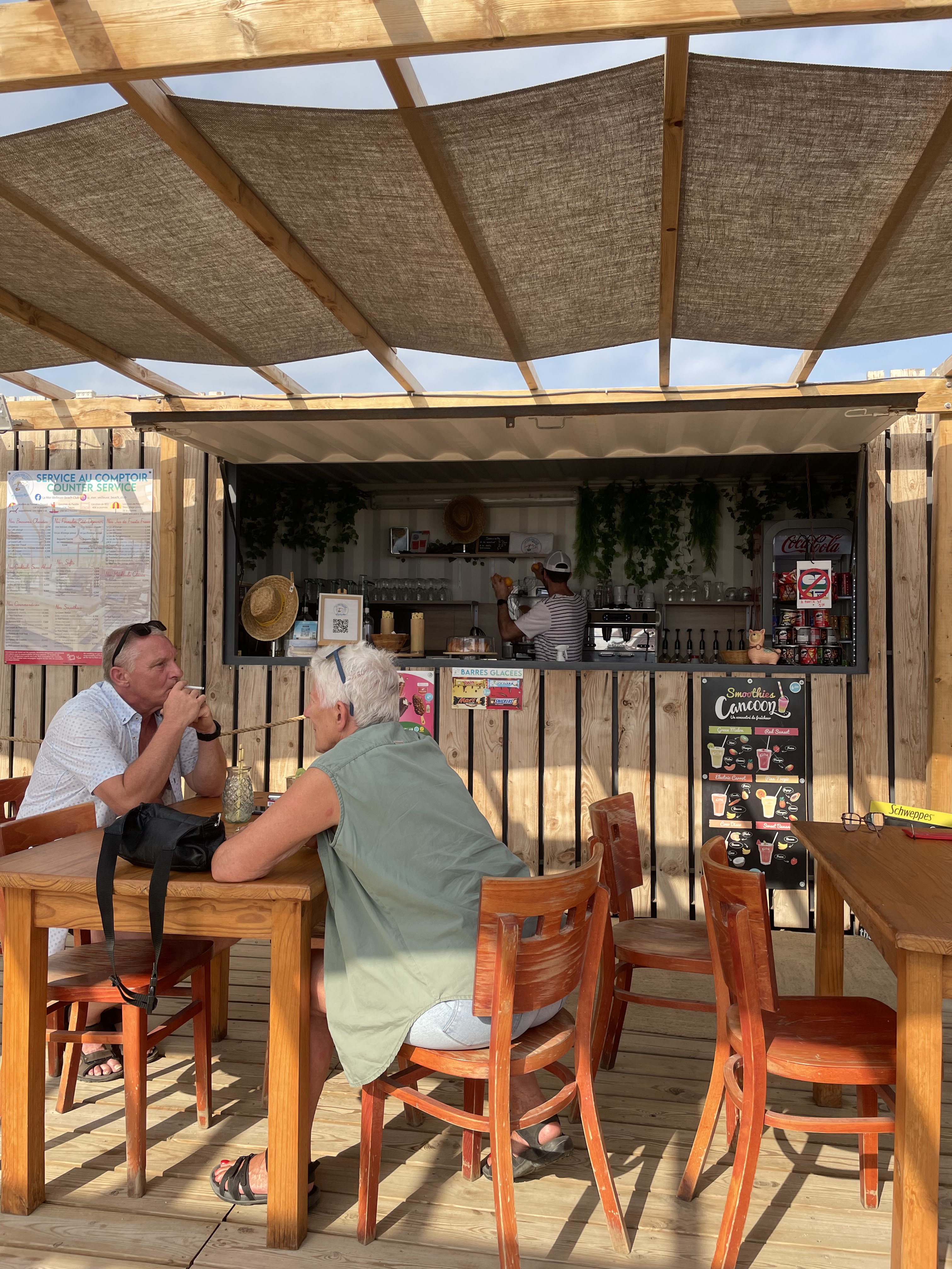 Nous avons essayé de boire un verre sur ce joli bar de plage le 30 juin au midi. Après 30 mn d attente nous sommes partis boire un verre ailleurs. Le serveur très sympathique cependant était seul et une table avec petit déjeuner lui a pris tout son temps ....dommage .