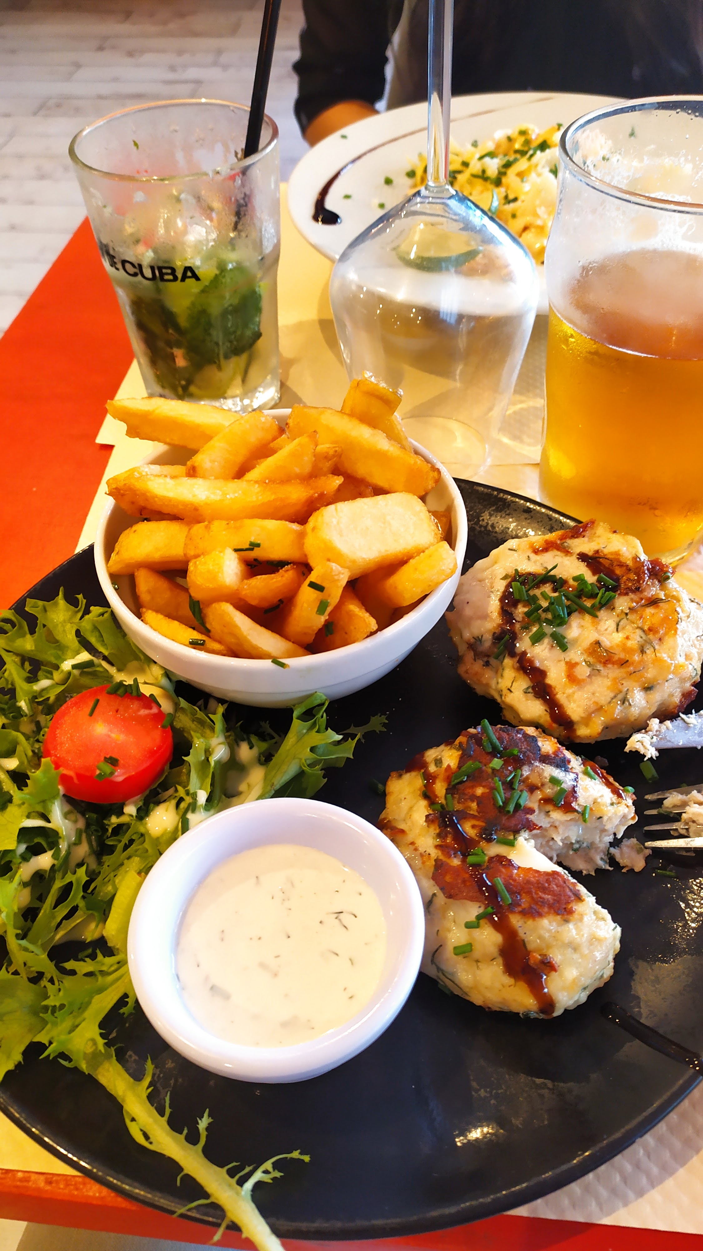 Restaurant pour touristes le plat du jour est moyen poulet sauce normande fade frites congelées le poke bawl au saumon bcp de salade mais très peu de saumon