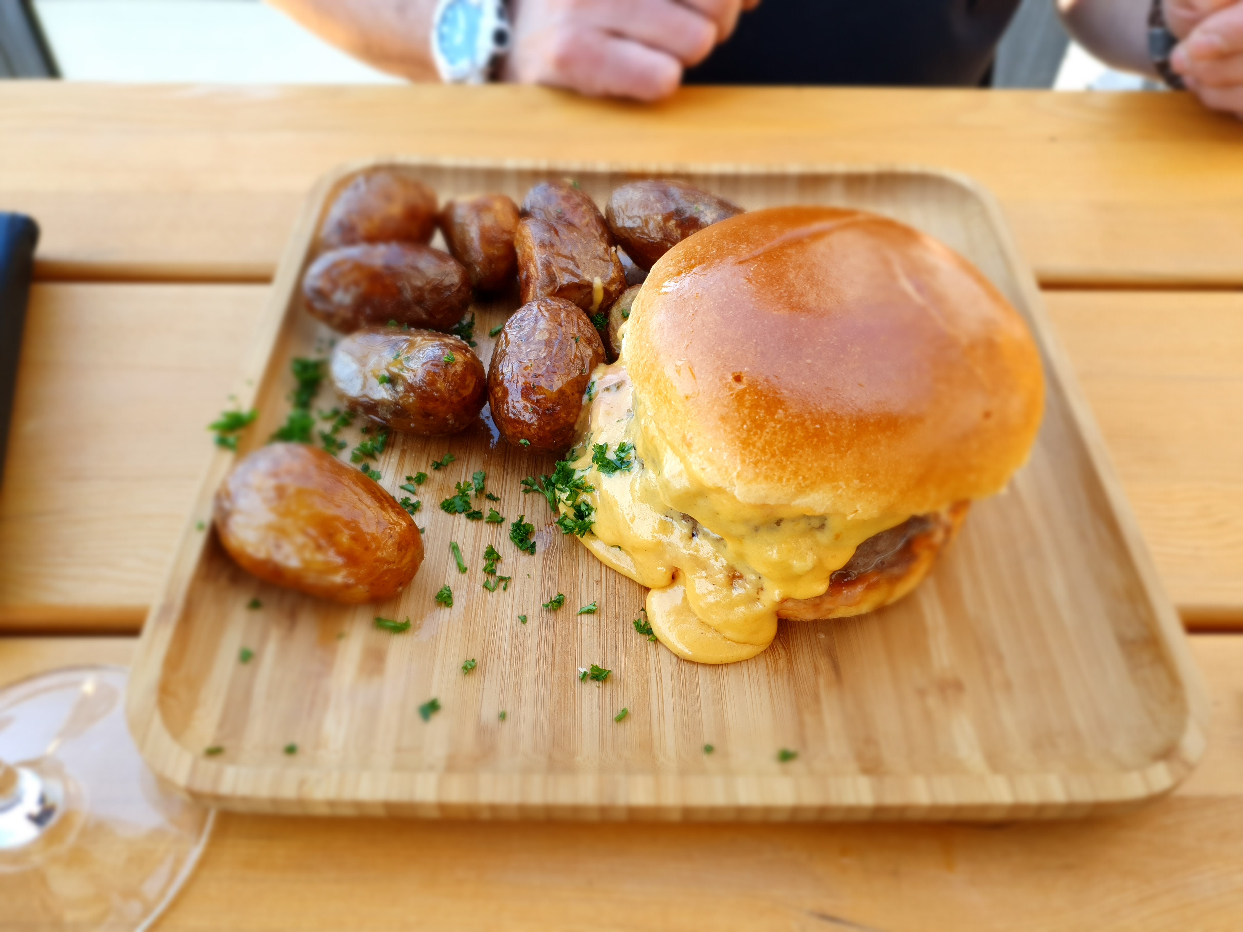 Arrivé pour 12h15 installation en terrasse un jeune serveur et une petite jeune serveuse un petit peu perdu et débordé par l'arrêt de la limonade et la mise en place de la partie resto... Service de l'apéritif puis 40 minutes d'attente pour la prise de commande du plat on nous avait oublié alors qu'ils sont passés je ne sais pas combien de fois devant nous. Pour suivre le porte-monnaie extérieur fixé sur un mur ne correspond pas du tout à ce qui est proposé sur la carte à l'intérieur nous nous attendions à pouvoir manger des moules frites / salade (et nous ne sommes pas les seuls parce que d'autres gens se sont fait avoir également à côté de nous) sauf que la carte proposée ne fait que du snacking ou planche à partager. C'est plutôt un bar à tapas. Concernant la cuisine le bagel saumon n'était pas du tout en bagel voir photos ci-jointe c'était plutôt un burger froid au saumon. Ceci dit il était très bon, mais il va falloir revoir l'appellation du bagel. Nous sommes un peu déçu de cet établissement qui pourtant à pignons sur rue. Dommage...