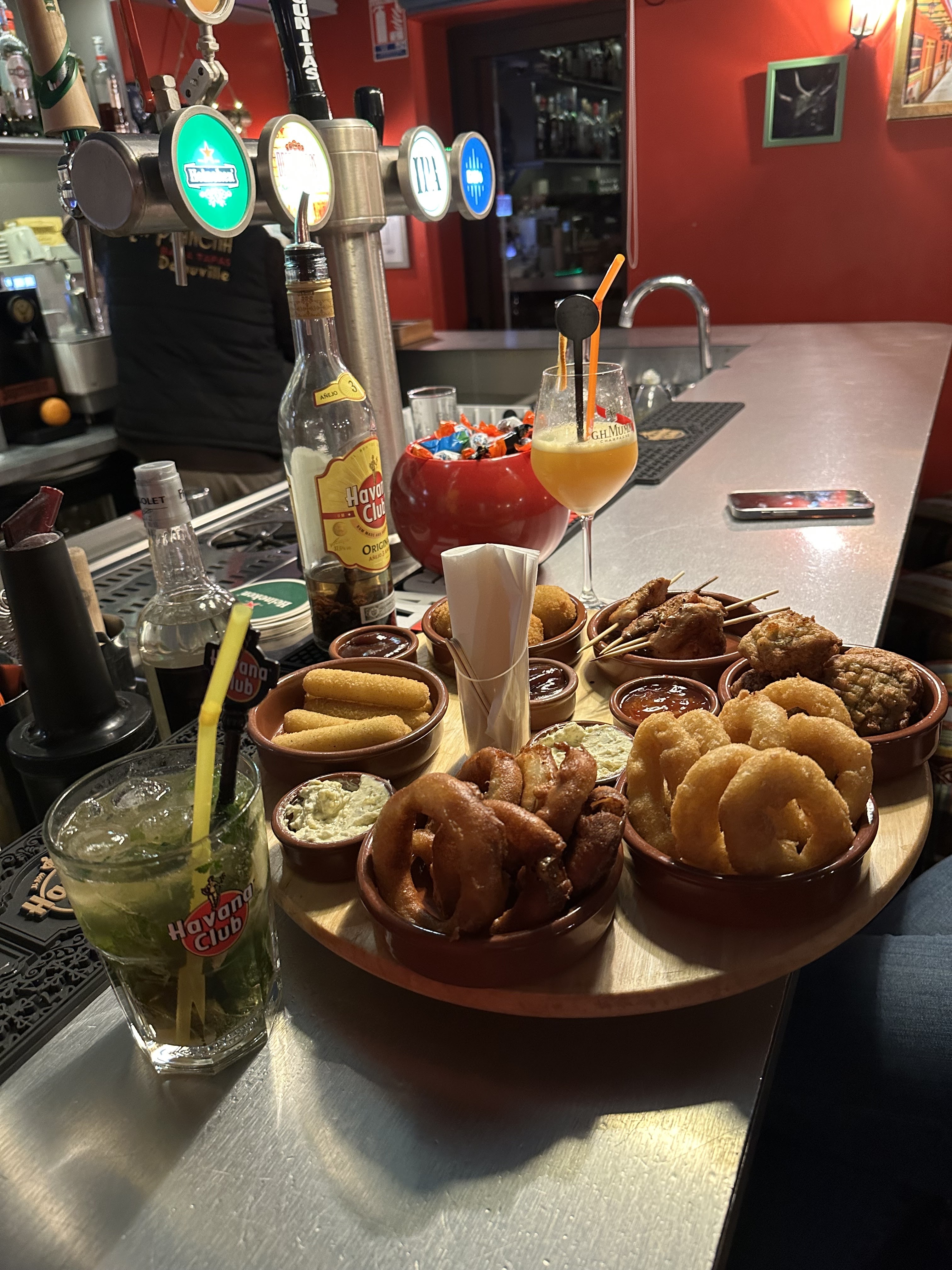 Bar tapas à l'ambiance et déco très sympa. Cocktails délicieux et beaucoup de choix niveau tapas, malheureusement certaines tapas n'ont pas l'air d'être faite maison ( je recommande les brochettes et les boulettes de bœuf). Le serveur ou vigile ?, pas très pro, habillé avec une doudoune gilet qui frôle les tapas lors du service et qui a l'air plus préoccupé par le match à la télé que pas son service. A faire entre amis pour l'ambiance et les cocktails. Peux s'améliorer sur le service et la qualité des tapas surtout pour un bar tapas !