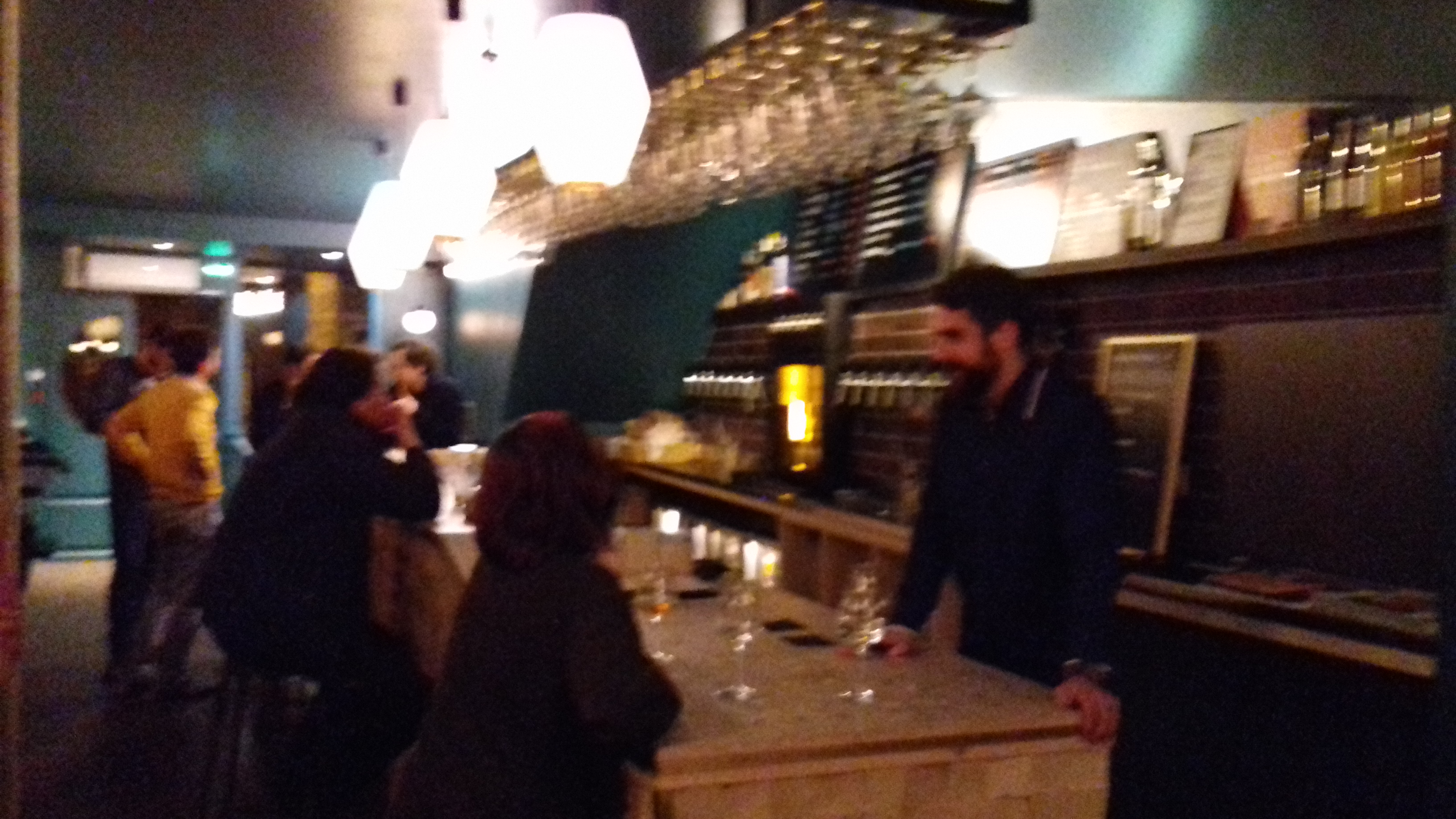 Très grand choix de bières et de vins à des prix raisonnables (la nourriture, en revanche, n'est pas donnée et vient en petites portions). Les personnes dernières le bar sont vraiment top et à l'écoute, à l'exception d'un type assez antipathique, pas très causeur et qui rechigne à vous donner le moindre conseil sur la pinte de bière ou le verre de vin à choisir. La déco est particulièrement réussie (mention spéciale au sous-sol) mais l'agencement est mal pensé. Le bar est très beau mais prend beaucoup plus de place que nécessaire, ce qui fait qu'il y a très peu de places assises. C'est d'autant plus vrai que la grande banquette au fond de la salle fait que les gens laissent naturellement pas mal d'espace entre eux limitant grandement le nombre de personnes qui peuvent s'asseoir. Je ne parle même pas des demi-sièges qu'on trouve tout le long du mur et qui sont les plus inconfortables au monde.