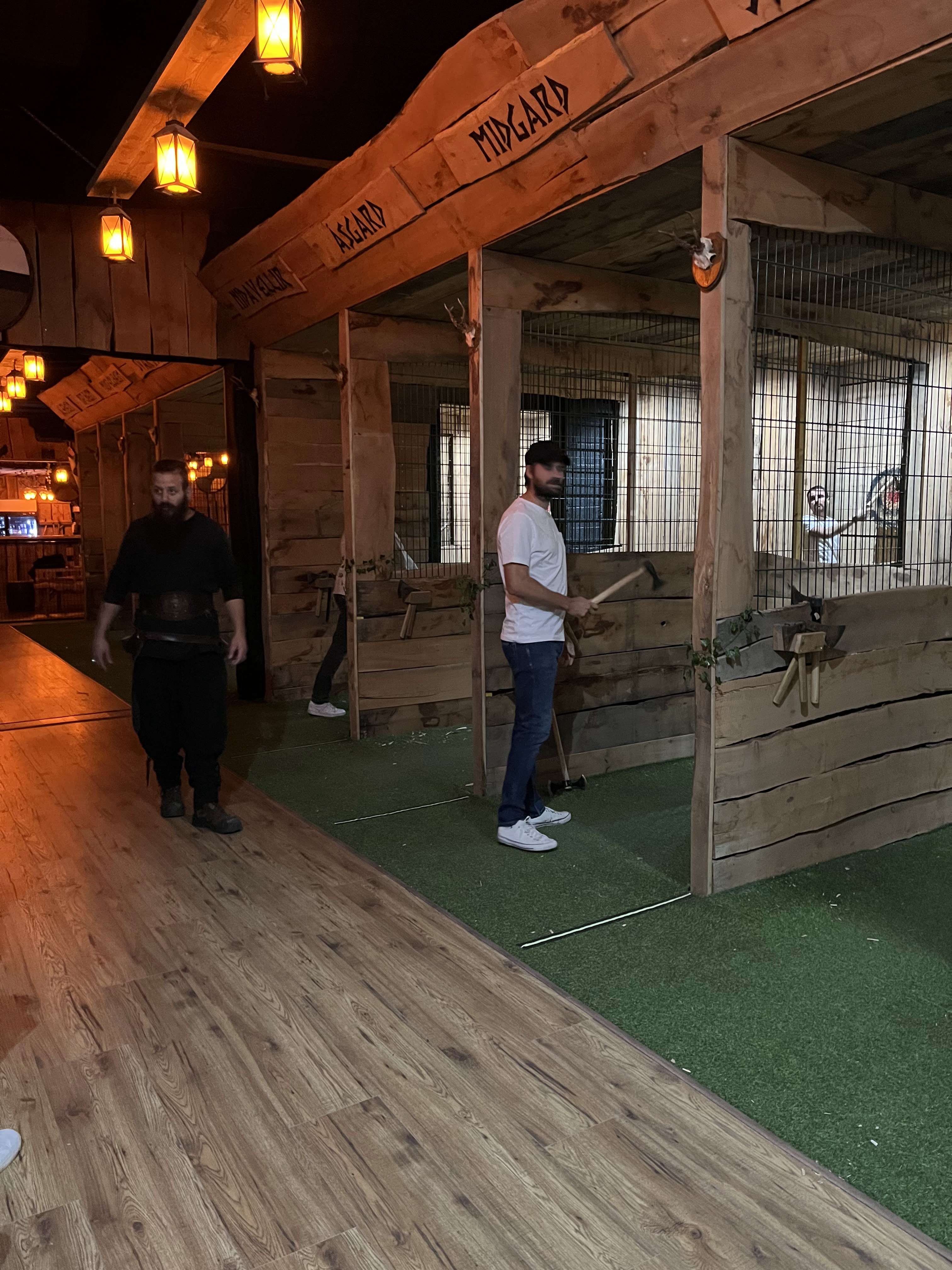 Endroit hyper chaleureux avec tous ce bois, ambiance viking au rendez-vous bien évidemment ! Première fois que je lance des haches donc j'ai eu de bonnes explications pour lancé et explications de différents jeu, comme on peux aussi y boire c'est plutôt parfait ! La zone est de plus calme je recommande pour passer de bonne soirée entre potes ou avec sa moitié !