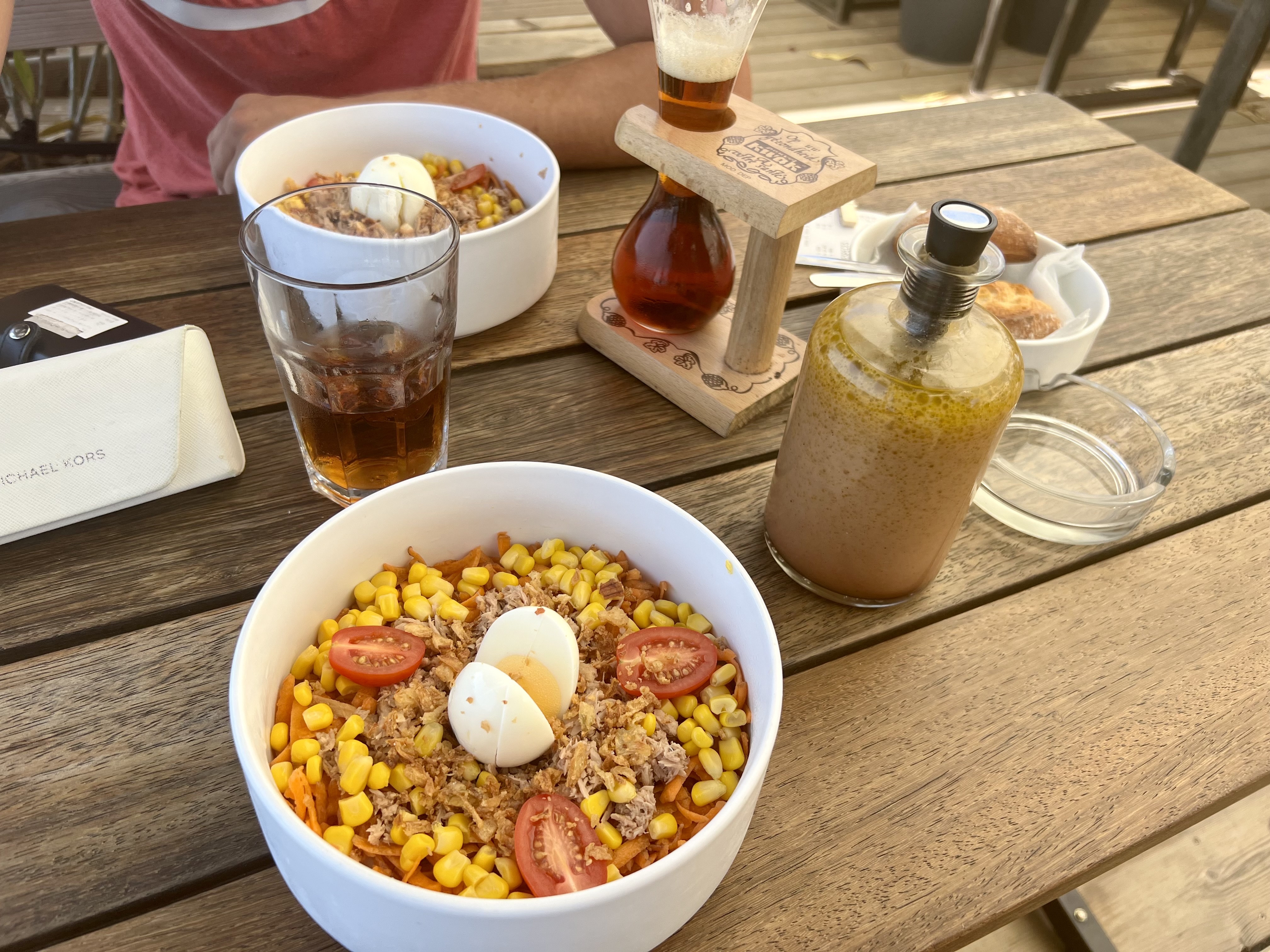 C est peut être bien pour y boire une bière mais pas pour y manger. La salade est vraiment simpliste, si on ne réclame pas on a pas de carafe d eau (il faisait plus de 30 °). La plancha de charcuterie et de fromage est très simple également et servie seulement avec un couteau.