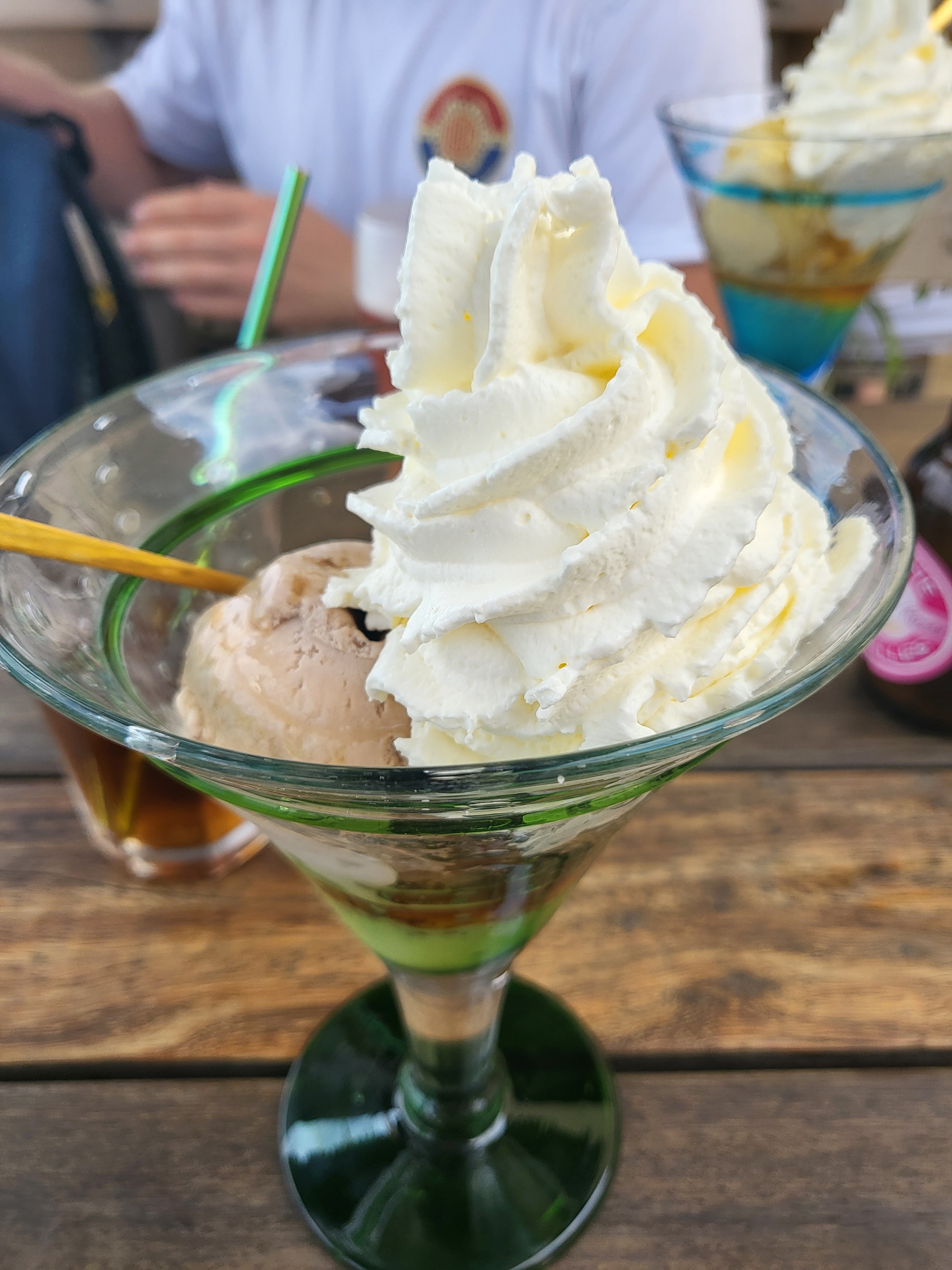 une vue au top, des glaces délicieuses avec une bonne crème chantilly bien épaisse. un porte clef sympa en décoration de chaque coupe.