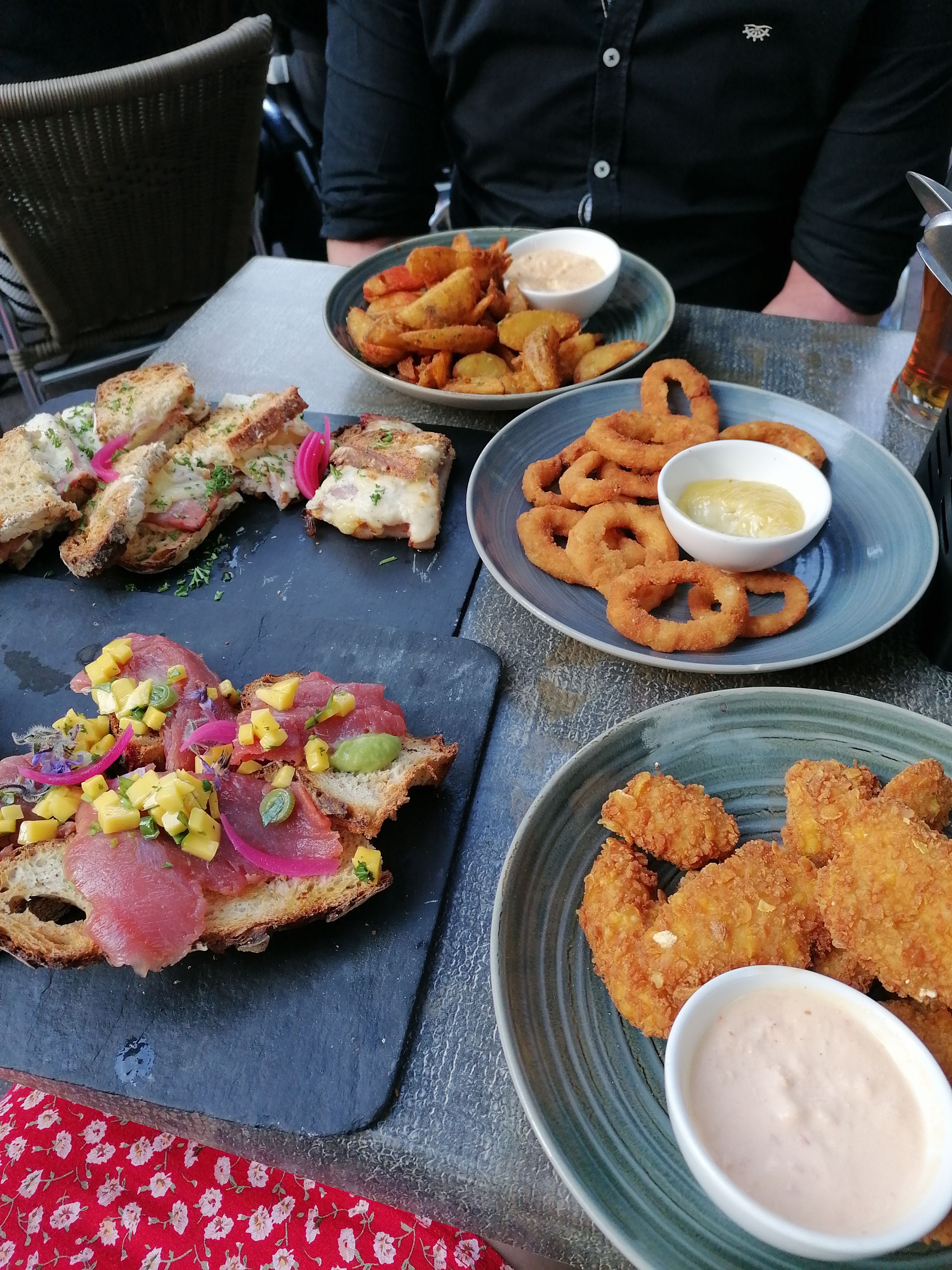 Honnêtement, un peu confus par les notes élevées accordées à cet endroit. Nous sommes venus ici pour dîner en nous attendant à un restaurant de tapas de style espagnol, ce qui n'était vraiment pas le cas à mon humble avis. Tout d'abord, j'ai été un peu déçu par le serveur car j'ai demandé si 4 plats seraient OK pour deux personnes, puis il a répondu que bien sûr, cela dépend de ce que nous commandons mais que ça devrait aller. Très bien, j'ai commandé 4 plats et quand ils sont arrivés, il est apparu que nous pourrions probablement nourrir une famille de 4 personnes. 3 aurait été un maximum absolu, je dirais, des commentaires faciles à donner. Ce qui a aggravé la situation, c'est que la nourriture n'était pas terrible ! D'accord, le thon frais sur du pain grillé était bon - mais peut-être un peu excessif avec 6 morceaux, dont certains étaient empilés avec du thon. Les quartiers de pommes de terre étaient de bonne saveur mais assez gras. Le poulet frit était bien croustillant mais totalement sans saveur. Les sauces qui accompagnaient manquaient de « punch » ! Quelques points positifs pour le champagne à un prix raisonnable dans des verres et un seau à vin de la même marque. Peut-être que le personnel était distrait car il y avait évidemment une grande fête d'anniversaire pour un membre du personnel plus tard dans la soirée. Pas question que ce soit un établissement 4,5 si tel est le niveau de qualité, il y a tellement de meilleurs endroits parmi lesquels choisir !