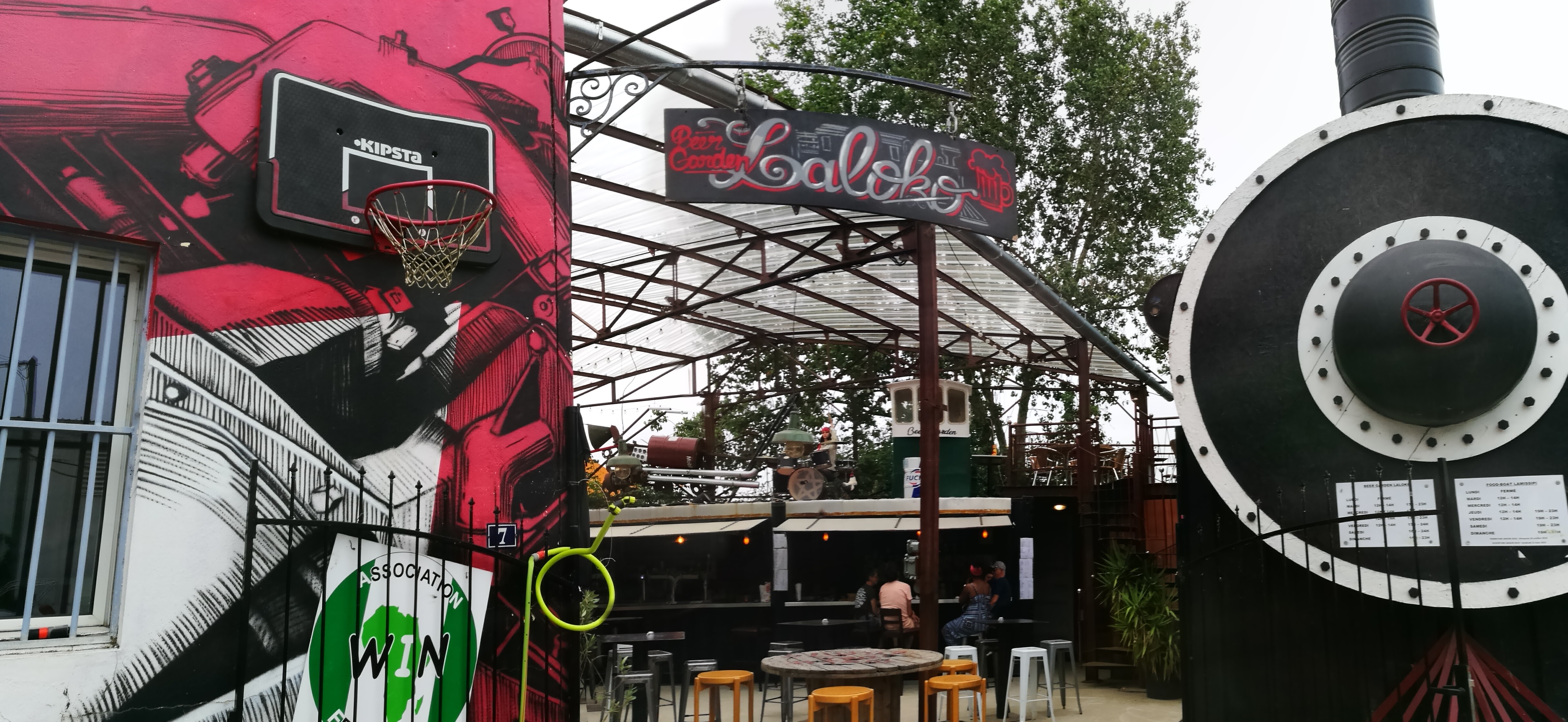 Cadre très original fait d'une loco, de bateaux, d'un avion, de belles œuvres de street art. Beau choix de bières pression et bouteilles