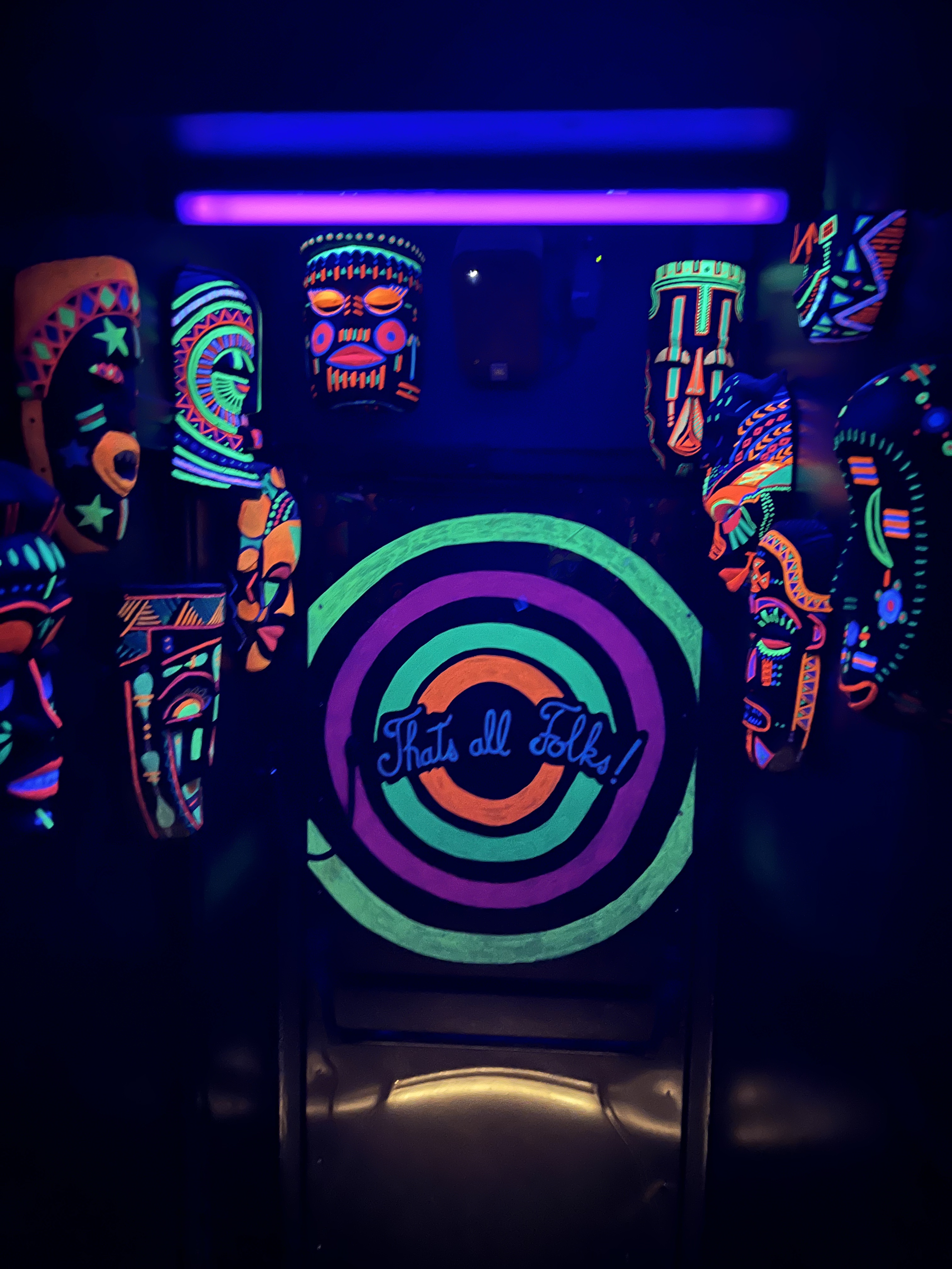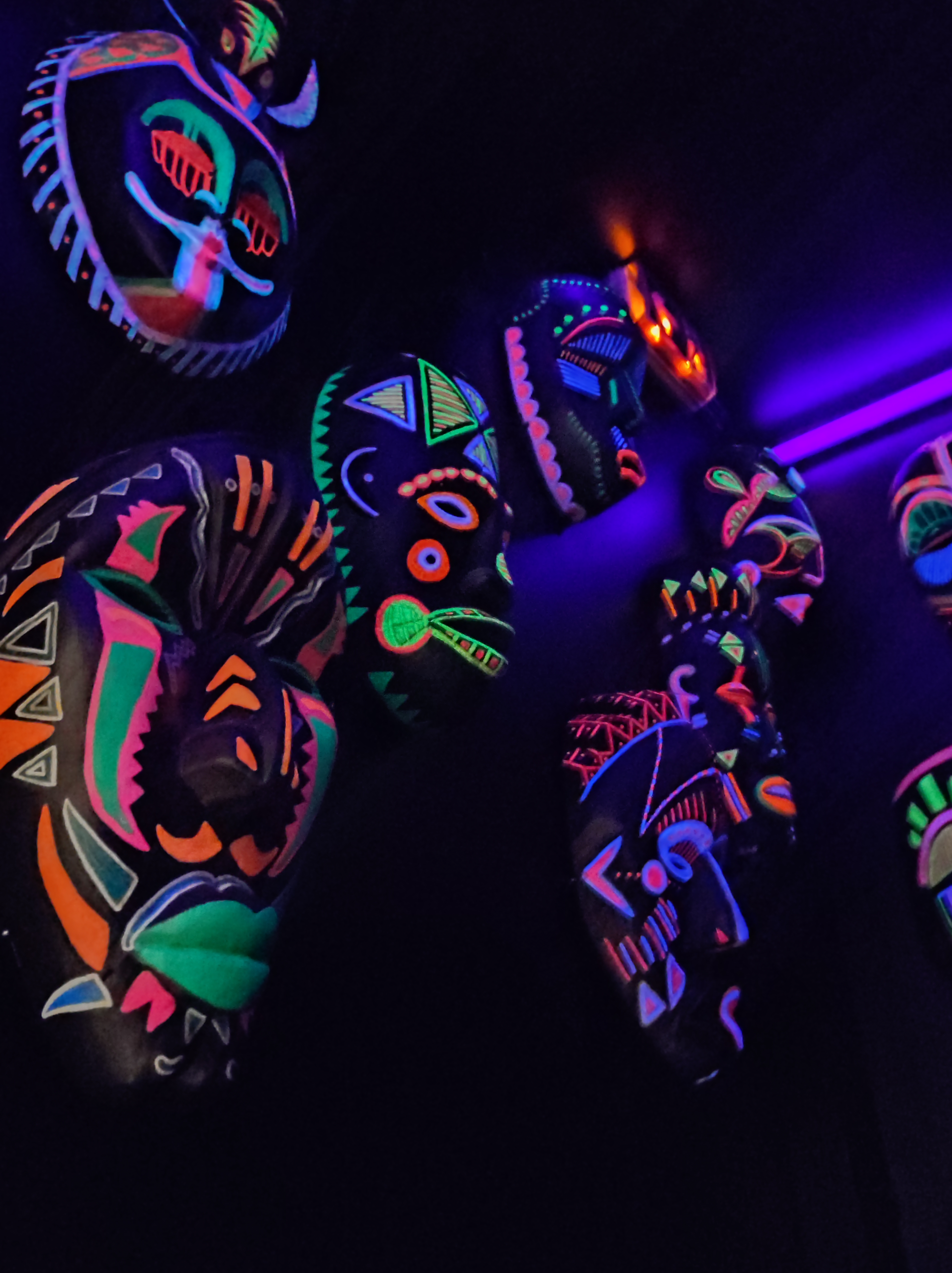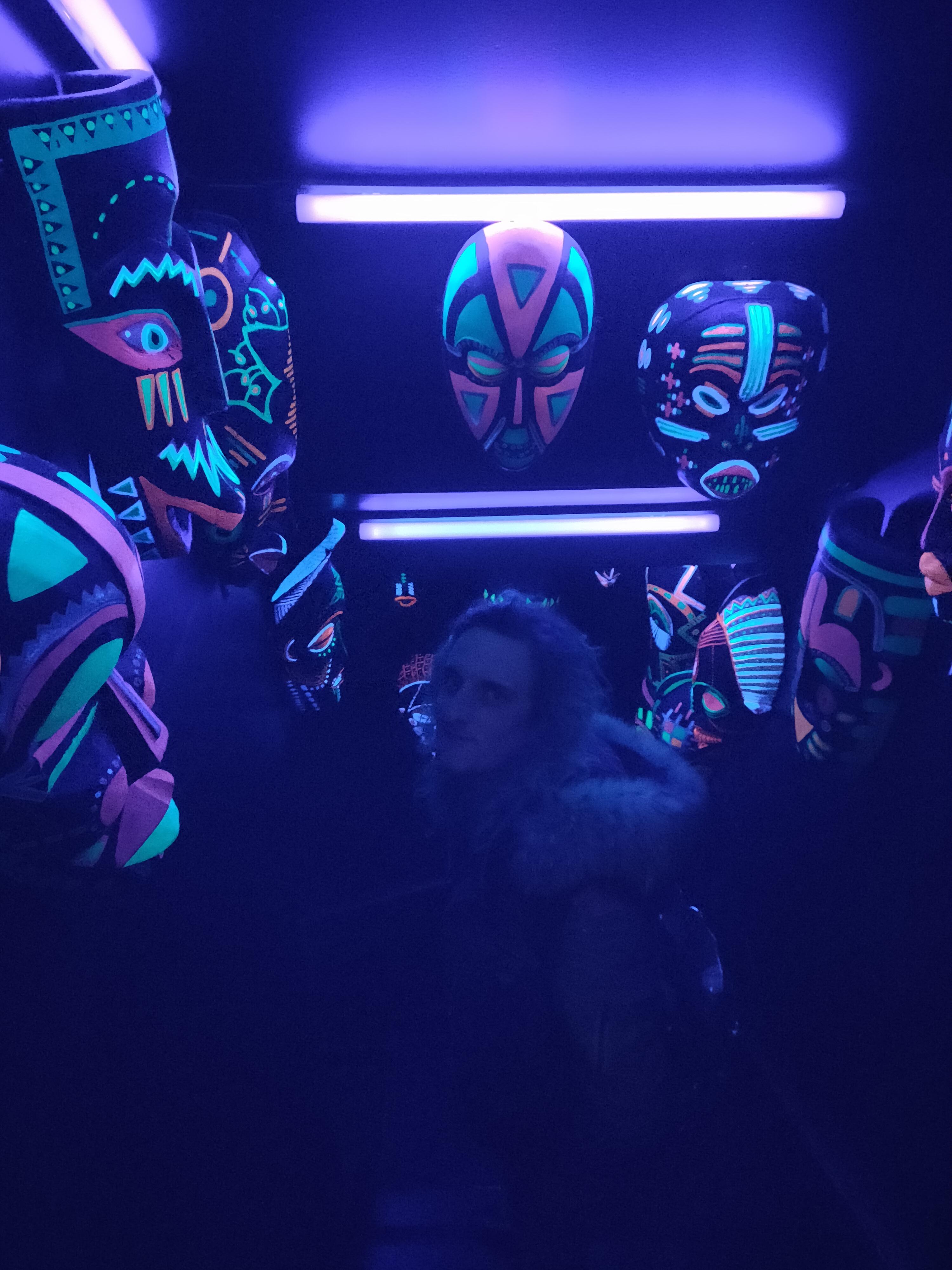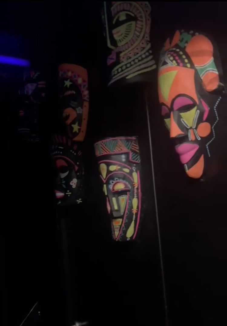 On fait la queue pour rentrer. L'entrée est sympa. On monte (en fait c'est a l'étage !) Escalier éclairé par les masques peint fluo donc on voit pas grand chose. Petit bar vite rempli (d'ou la queue dehors), on nous met a une table debout en attendant qu une table assise se libère. 11 a 14€ des cocktails de taille très standard. Et 7€ les 33cl de coca. On était tous fatigué et pas dans l'envie de payer 11€ pour rester debout indéfiniment. On est parti ailleurs, pour manger, assis.