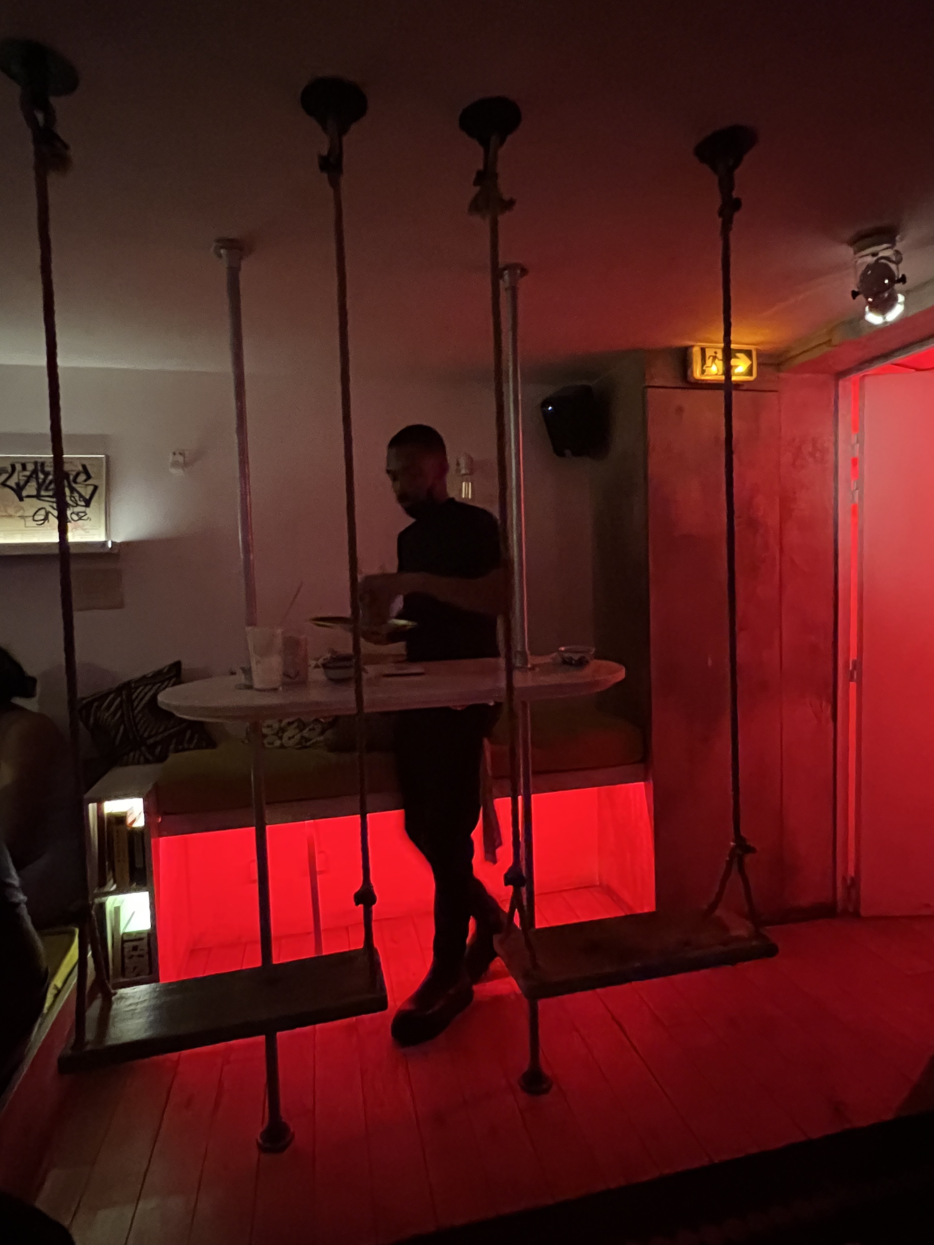 Lieu atypique, avec cette entrée surprenante ! Le cocktail drink me est top. Musique un peu forte mais ça donne le ton pour donner l'envie de poursuivre dans la soirée ! La salle est exiguë et pas toujours confortable en fonction du placement (cf les balançoires pas très pratiques quand on fait 1m65...). Une expérience à part entière et un must do parisien.
