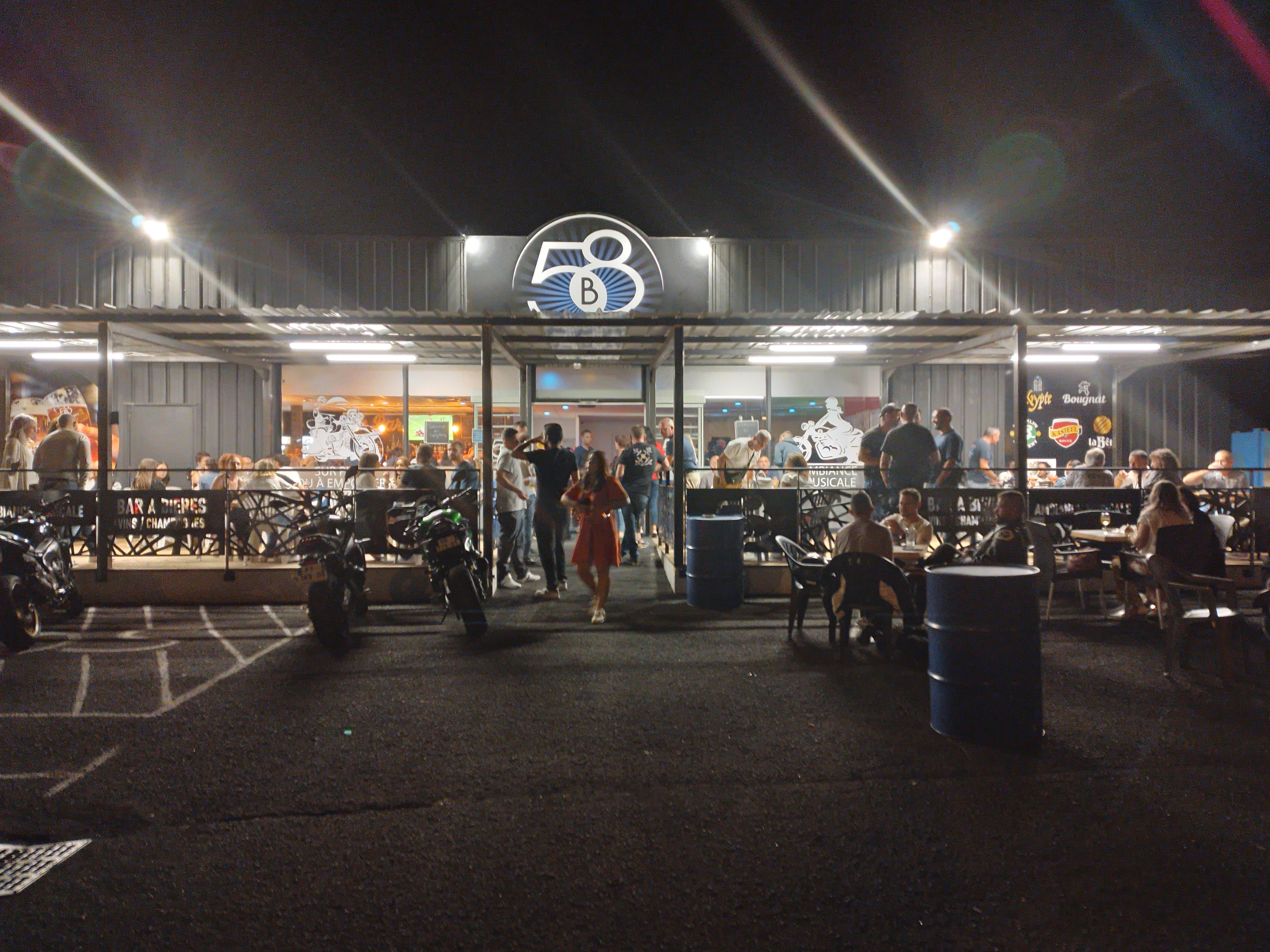 J ai découvert cet endroit par hasard, c est magique. On peut manger dedans ou dehors grâce à une marchande ambulante installée sur le parking avec un rapport qualité prix exceptionnel. A l intérieur du 58b ambiance assurée, on peut danser boire...faire la fête quoi avec une clientèle variée au niveau de l âge. Très bonne soirée à refaire.