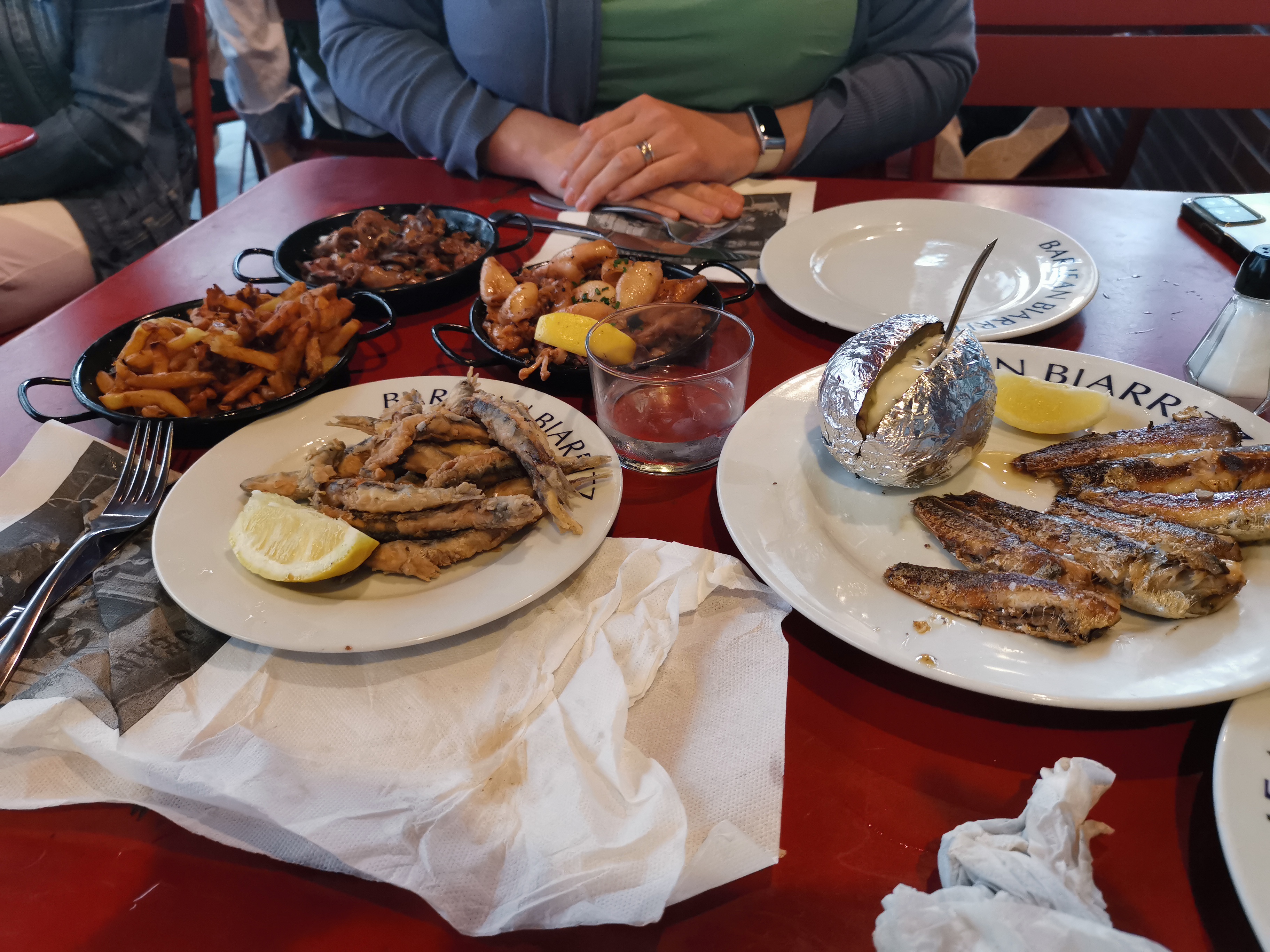 Meh serait ma première et dernière impression. Je n'ai pas été impressionné par la nourriture ni par le service. Je suis pescatarien, donc j'apprécie les fruits de mer comme jamais demain. Être à Biarritz, sur la côte, permettrait à chacun d'être ouvert à la dégustation des fruits de mer de la ville. Nous avons commandé des Gambas (crevettes), des patatas bravas (pommes de terre avec leur sauce maison), un plateau de fromages (mélangé avec des fromages, de la salade et leur baguette en accompagnement) et leurs calamars (probablement la meilleure chose du menu). Tout, mais les calamars étaient 2 étoiles. Ils ont eu une étoile supplémentaire à cause des calamars mdr. Est-ce que je reviendrais ici ? Définitivement pas. Cependant, il y a une super ambiance à l’intérieur avec de la musique et de la danse le week-end. D’après notre serveur, c’est l’endroit où sortir.