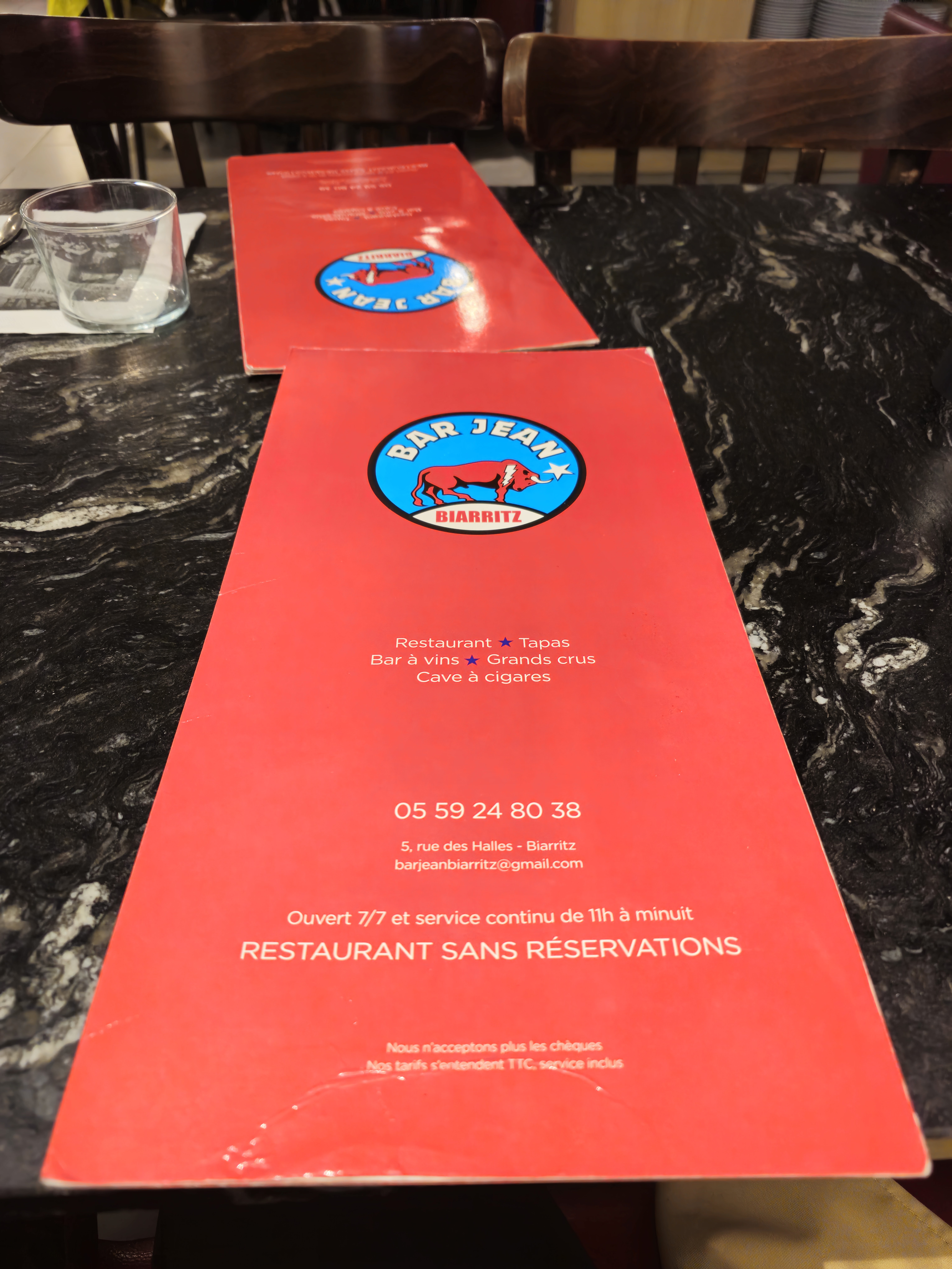 Bonne expérience de dîner au célèbre Bar Jean de Biarritz. J’avais gardé de bons souvenirs de mon dernier séjour et de mon dîner. Équipe sportive pour un service assez expéditif. Dans l’assiette, des spécialités de poissons. Très satisfait de la rapidité du service et de l’ambiance brasserie.