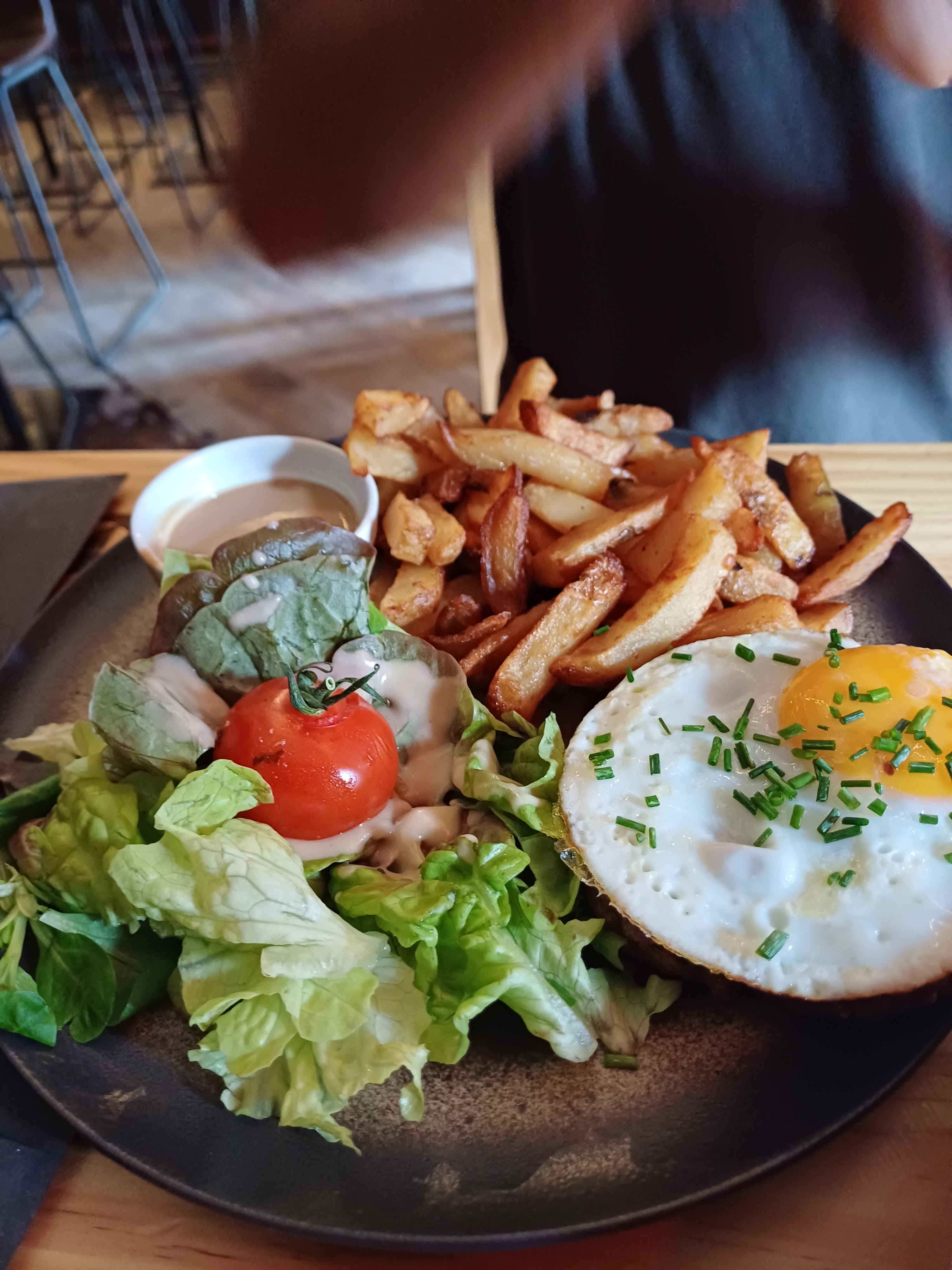 Nous avons trouvé ce petit restaurant qui se trouve dans une vieille bâtisse qui date du XVIe siècle, et toute biscornue, originalité géniale. Service du midi sympa et rapide. Carte originale présentée sur des grandes ardoises, claires et à des prix correct. Cuisine excellente, sauce avec beaucoup de goût. Viande fraîche pour le burger avec de vrai cornichon :-) un regal, l'ensemble etait bien equilibre Malheureusement nous avons été importuné avec insistance par une cliente ivre, nous avons donc été mangé notre dessert dans un autre établissement