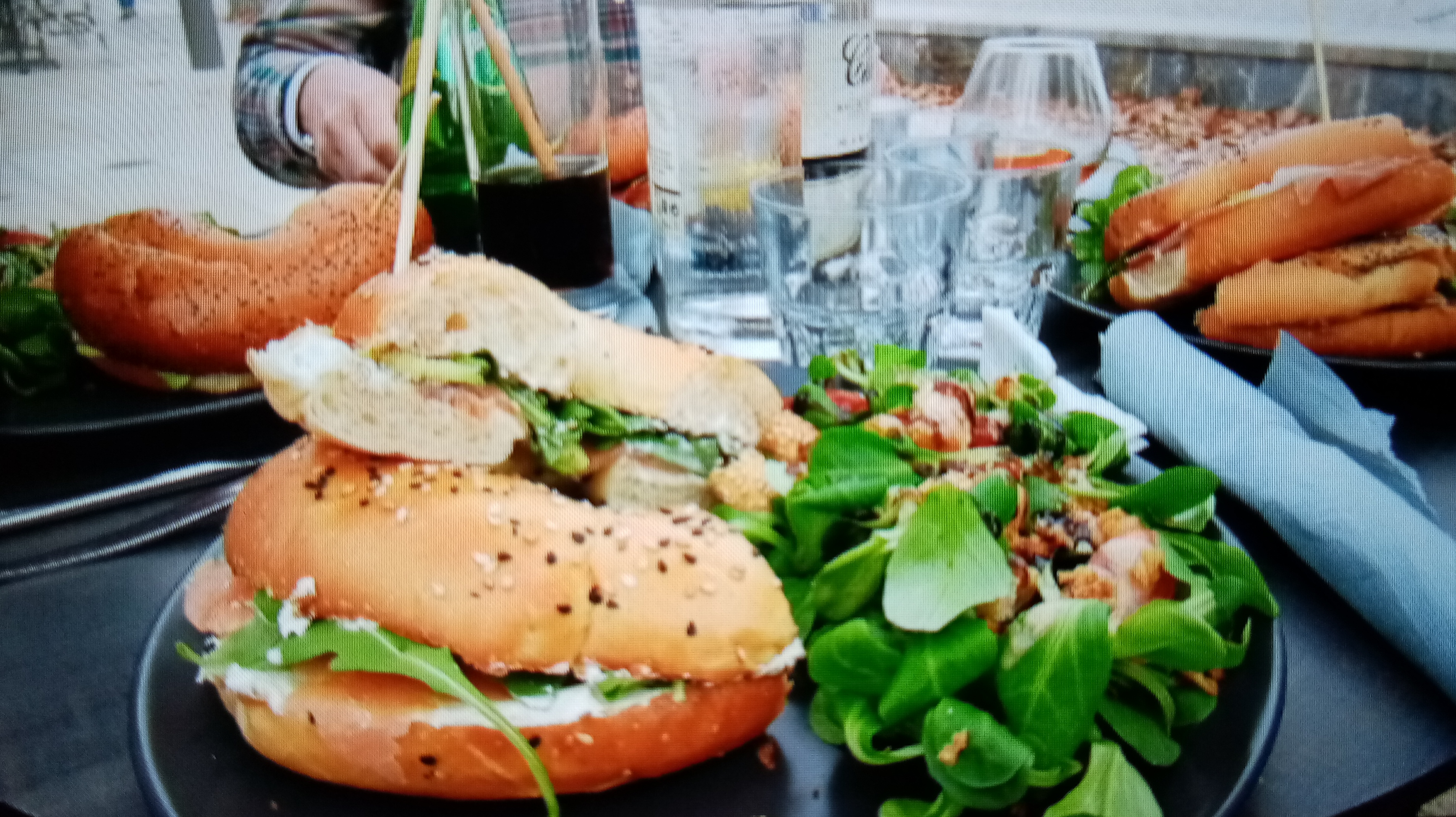 Énormes bagels 🥯 avec une salade 🥗 !!! Délicieux !! Et vin rouge au verre servi frais 👍🍷 Parfait pour le déjeuner 😊