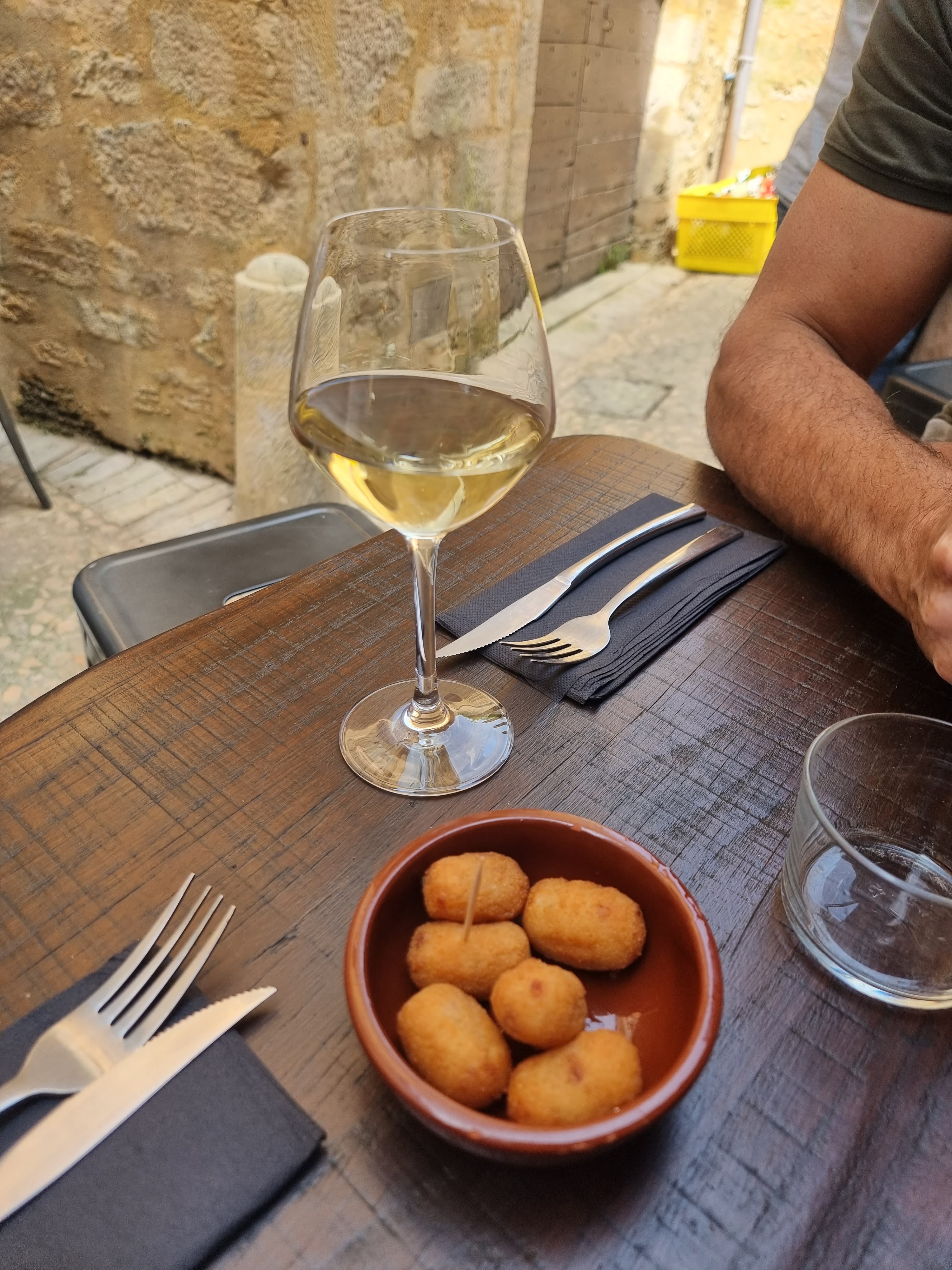 Convaincus par les nombreux avis positifs, nous avons décidé d'y passer la soirée. Vraiment ravis, le cadre est très joli (petite ruelle historique charmante), les tapas et le vin sont excellents, service rapide et prix très raisonnable pour la qualité des produits 56€ pour une copieuse planche de charcuterie/fromage, deux tapas aussi très copieux (camembert rôti au miel et thym 🤌🏻🤌🏻), et quatre verres de vins. Nous reviendrons avec plaisir !