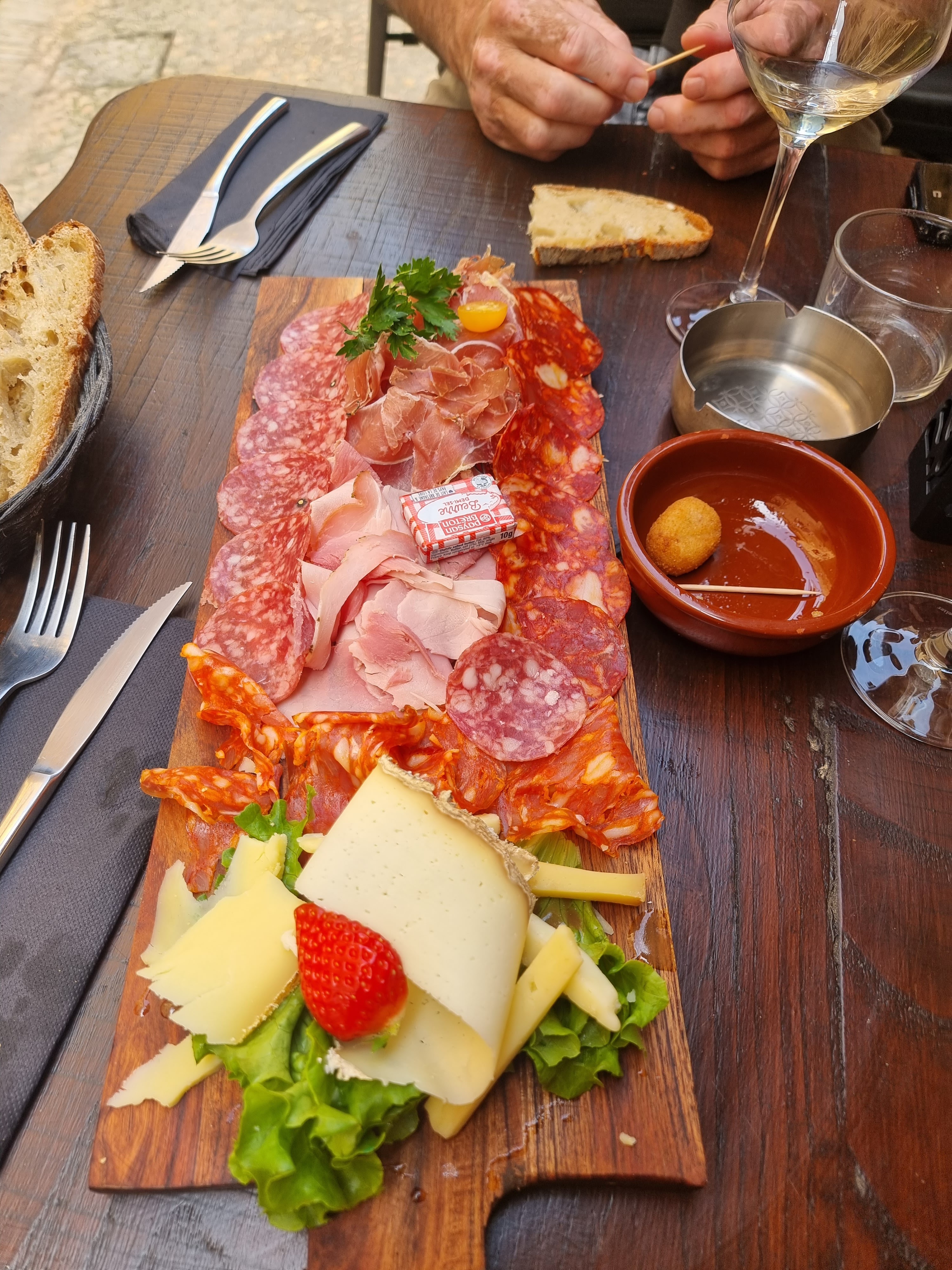 Dernier jour de vacances , après avoir quitté le Lot On a fait un détour par Sarlat Ce midi la, on avait pas envie de manger dans un restaurant classique et surtour l'envie d'être loin de la foule Au hasard de la ballade on est tombé sur ce bar/tapas situé dans une petite ruelle assez calme On a prit une assiette de charcuterie et fromages + des tapas au chorizo Service rapide, c'était bon, servit sur un morceaux de tronc d'arbres, ça change des classiques assiettes les tapas sont un peu cher au vu de la quantité Par contre, l'assiette de charcuteries était suffisante pour nous 2