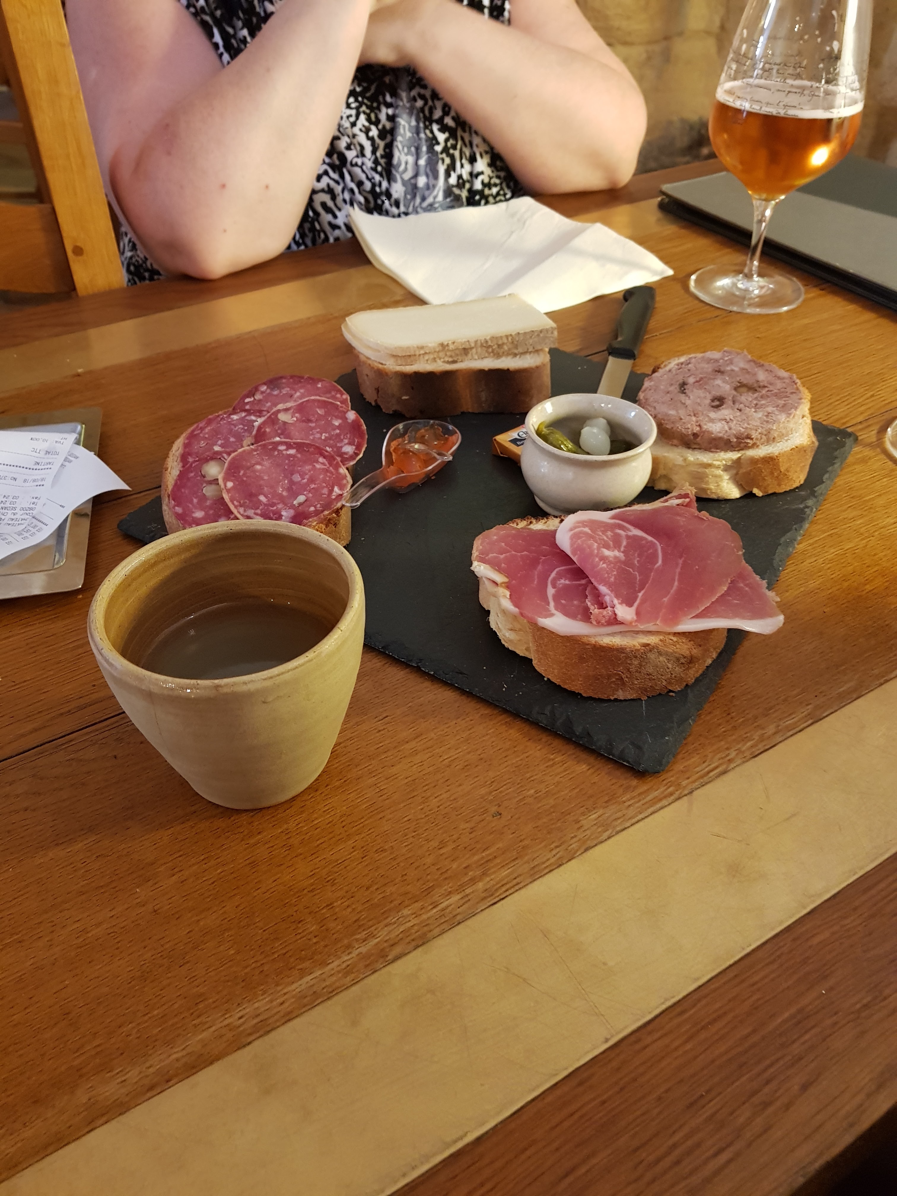 Le menu est ici assez basique avec du jambon, du fromage, du salami ou de la pattée sur une tranche de boule. L’assiette normale d’un adulte composée des quatre représente beaucoup pour une seule personne. Ils ont un bon choix de bières.