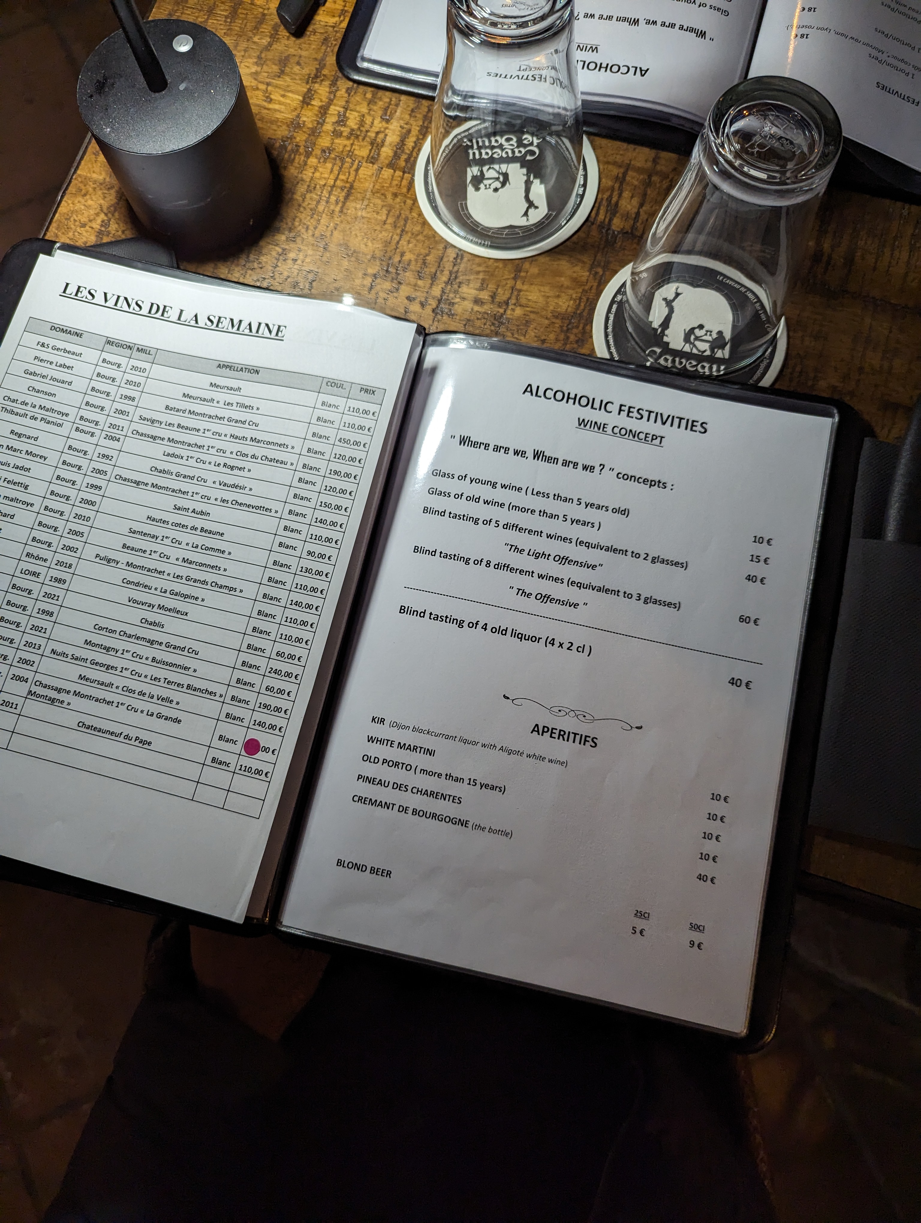 Cadre super.planches à partager très bonnes.Un concept de dégustation à l'aveugle surprenant en effet le caveau propose tout type de vins y compris espagnol là où l'on s'attendrait à ne goûter que des Bourgognes ! Si cela s'adresse à des connaisseurs ou à des néophytes le concept me semble inadapté, d'autant que la serveuse ,qui n'a pas reçu la moindre formation en œnologie ,ne peut décrire le vin que par son nom et son âge, encore qu'elle doit souvent partir le vérifier auprès du patron !