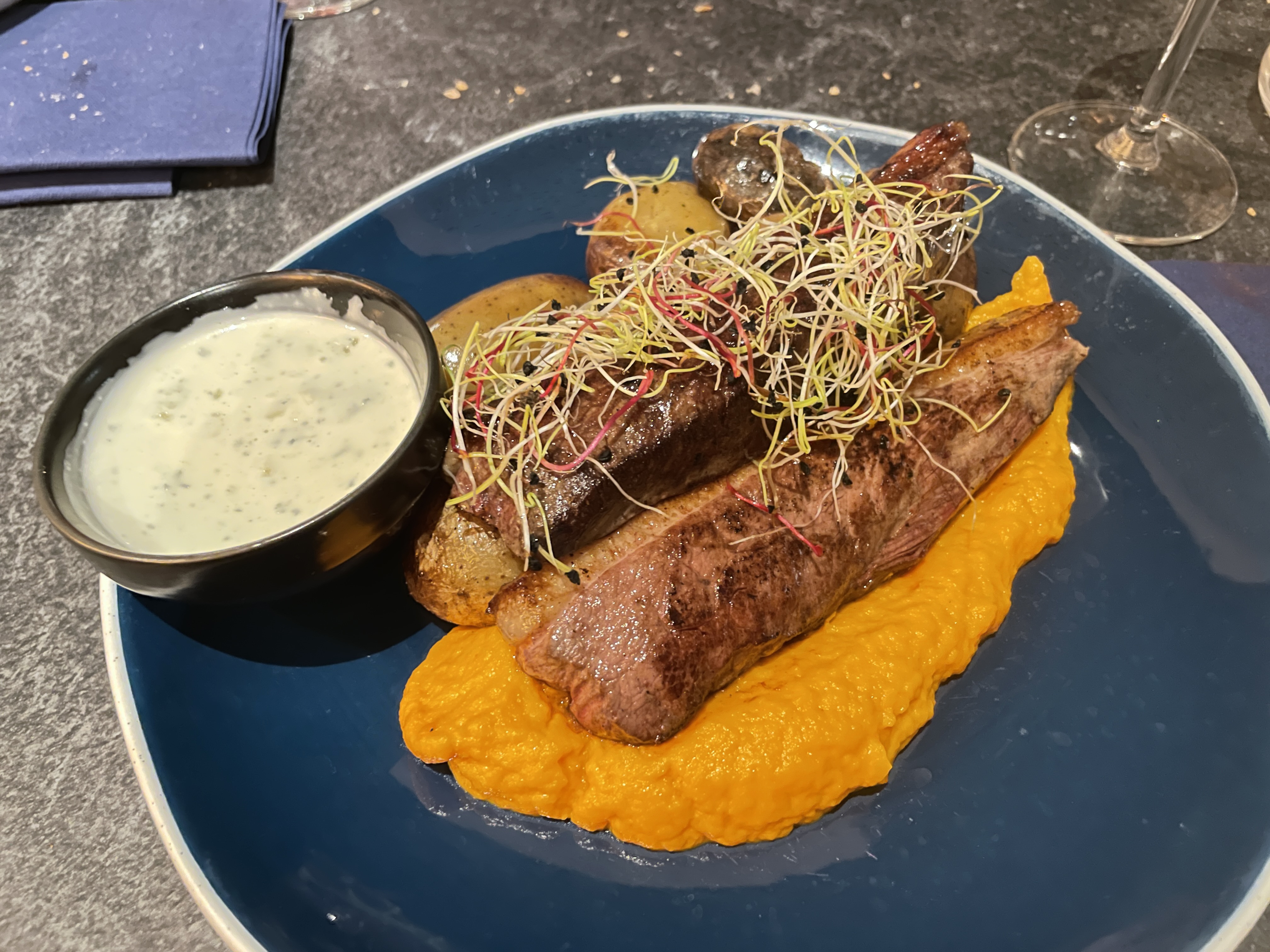 Nous avons été surpris en arrivant : la salle du RDC est un bar avec quelques tables hautes, nous avons cru nous être trompés d'adresse, avant de découvrir la salle du restaurant au premier. Nous avons commencé avec des St Marcellin à la truffe : les St Marcellin étaient très bons, il y avait bien de la truffe râpée mais elle n'avait que peu de goût. Les viandes étaient bonnes, ainsi que les accompagnements même si les pommes de terre grenailles nous ont déçues.