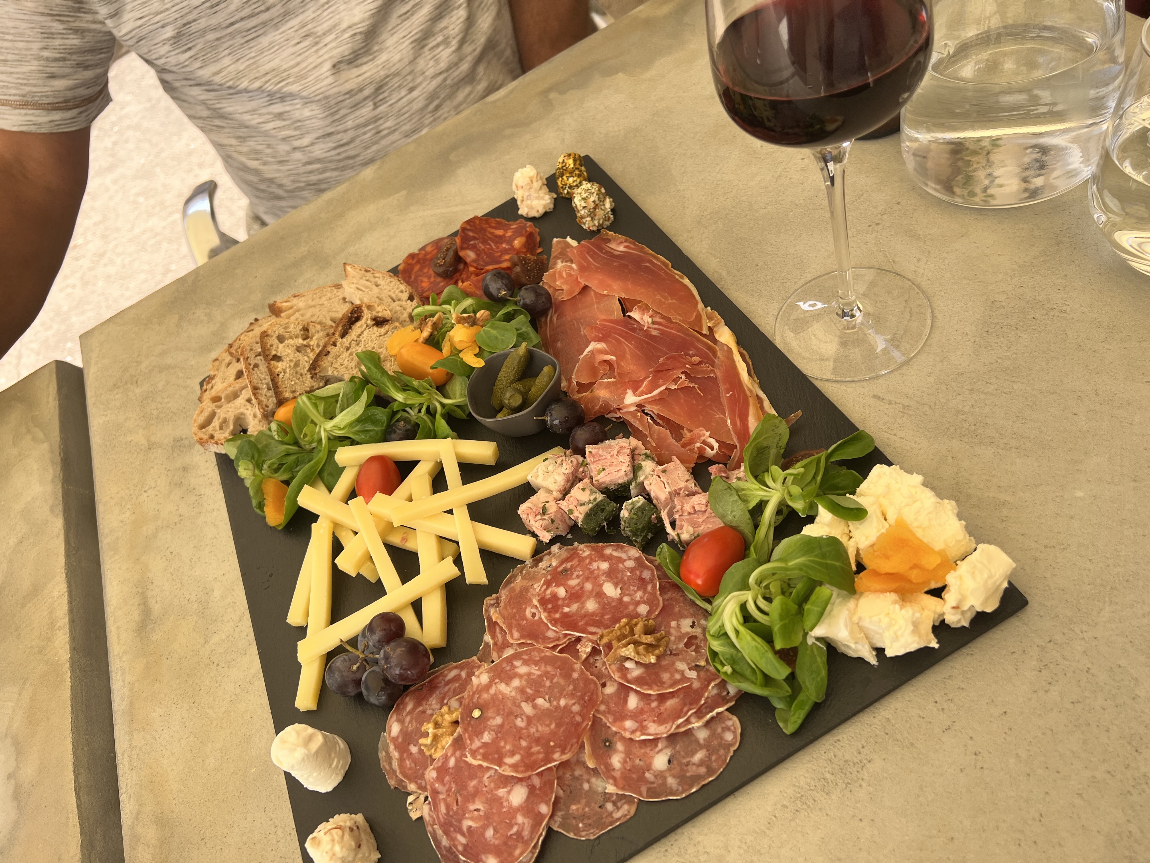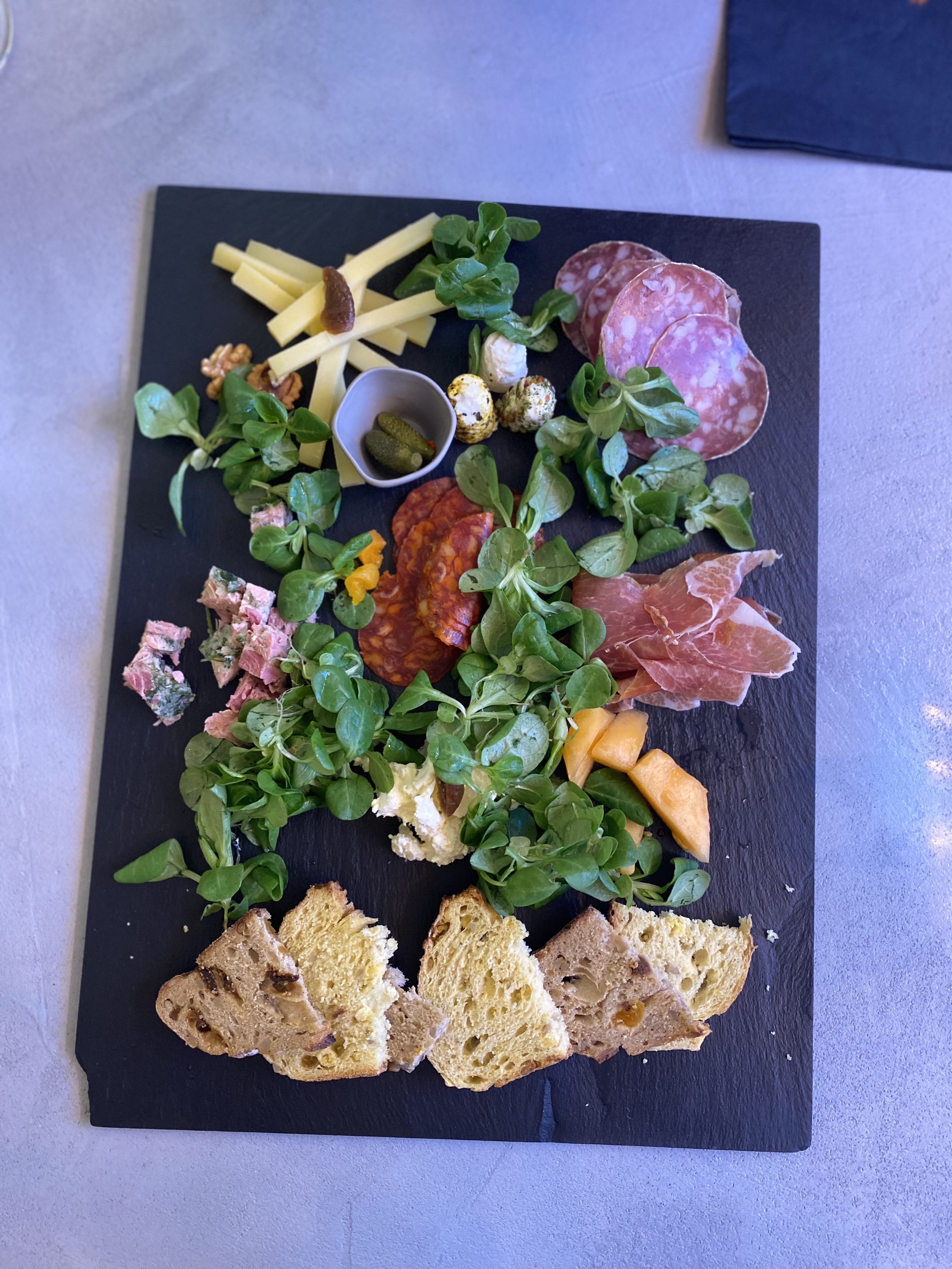 Environnement super Le serveur très sympathique Le vin excellent Mais pour le prix pas grand chose à manger heureusement qu'il y avait du pain à volonté