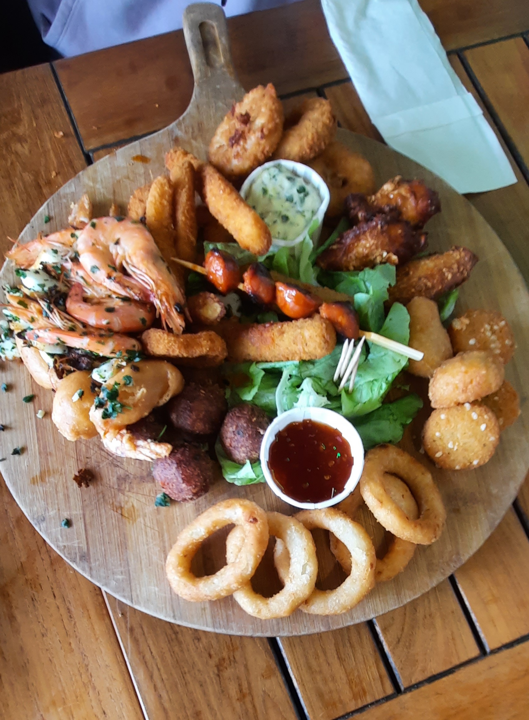 Planche apéro bien fournis, avec du choix: crevettes à l’ail, oignons rings, camemberts en croquettes, Mozza sticks ect C’était très bon ! Un énorme plus pour les frites maisons à tomber ! Nous avons été bien accueillis et servis. Merci ! Petit bémol pour les toilettes un peu vétuste et pas super propre.