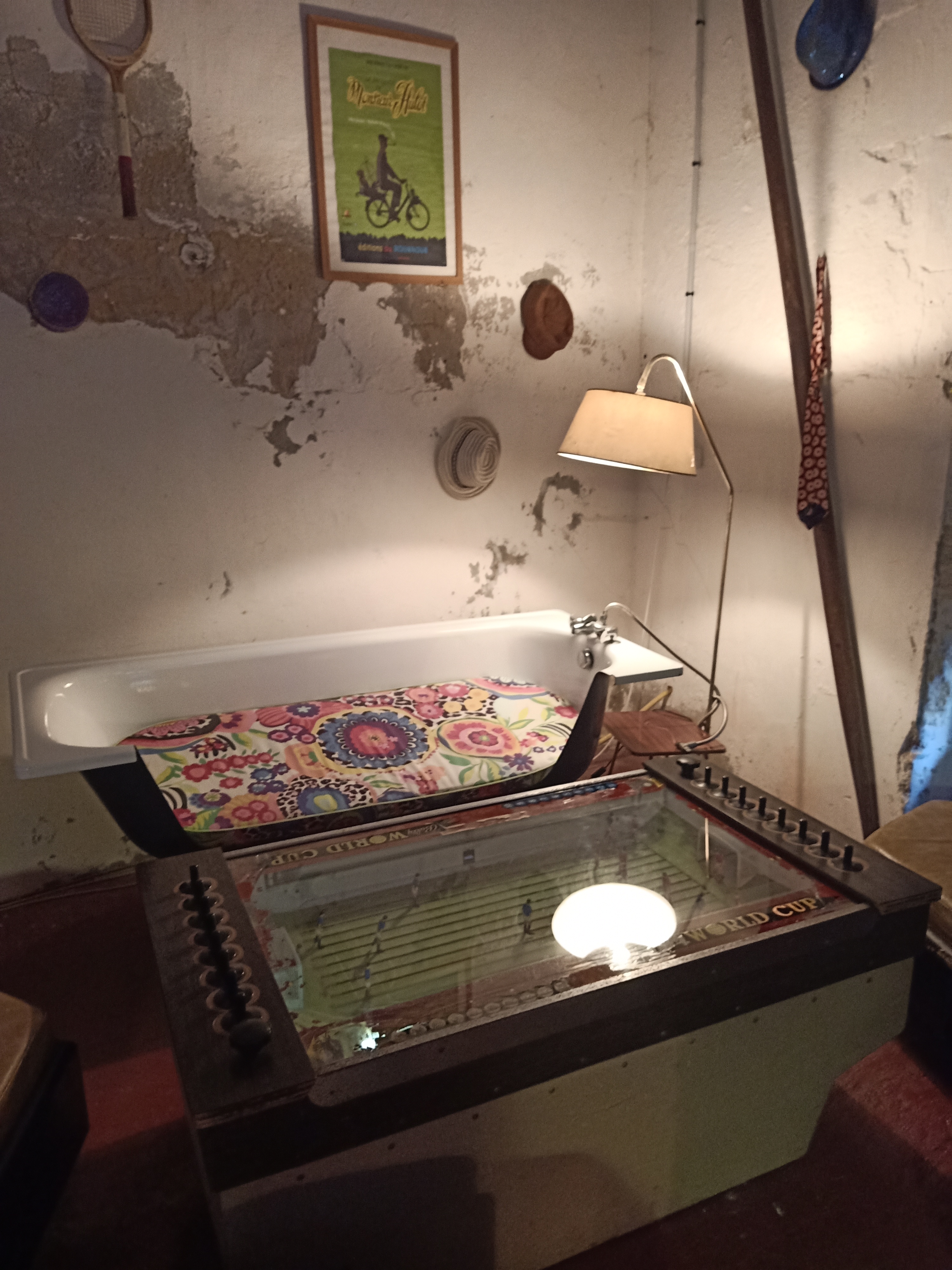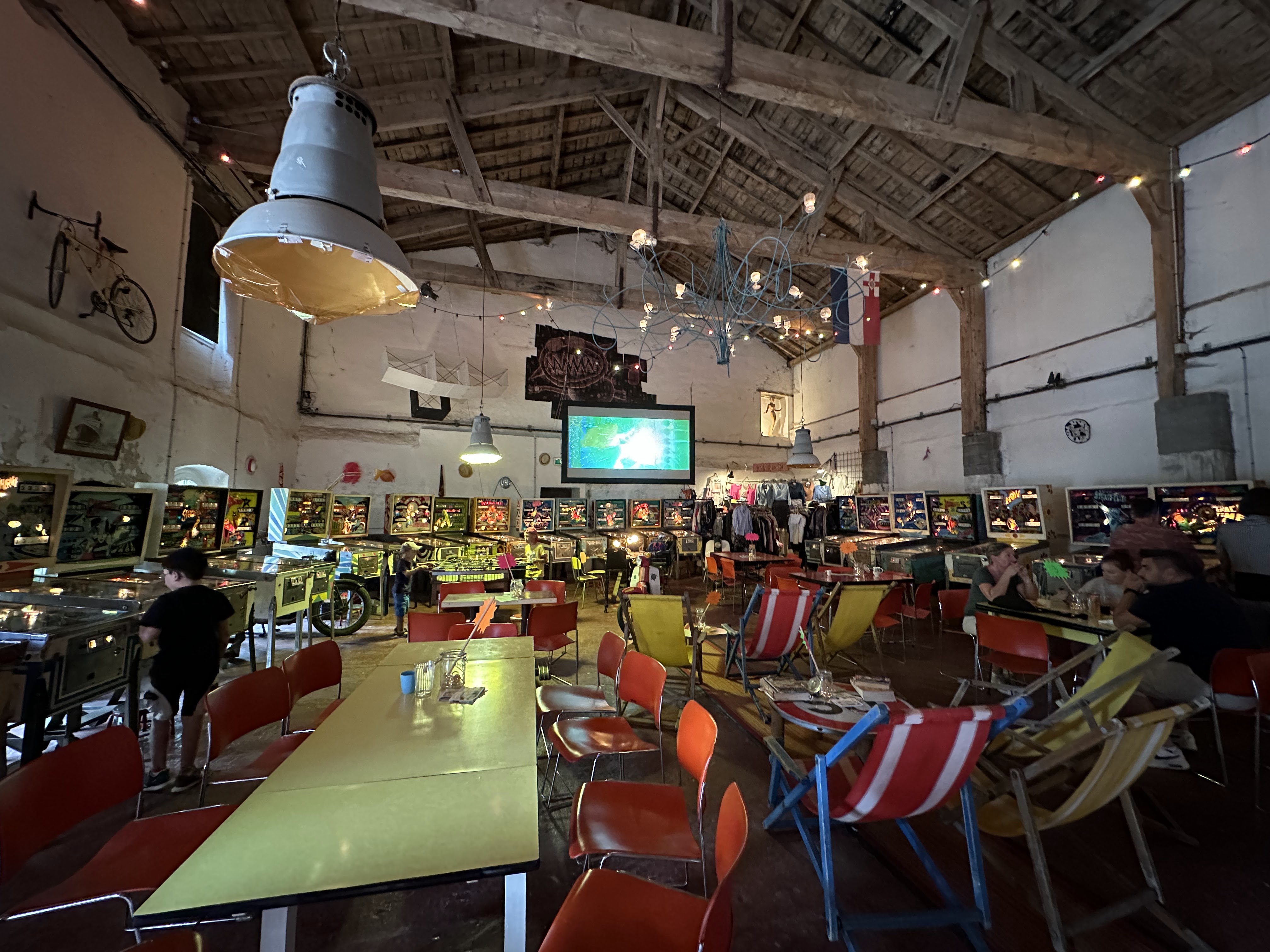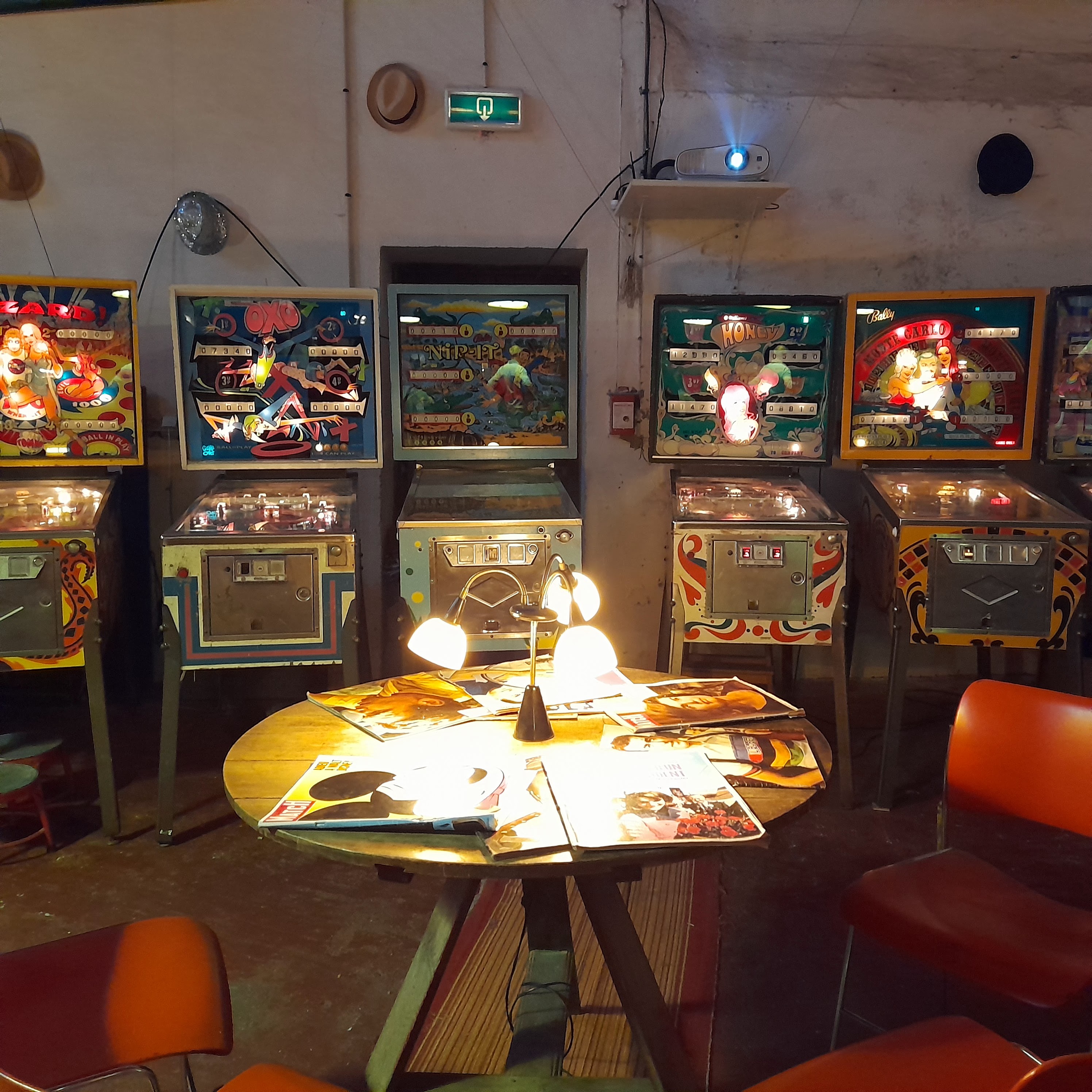 Superbe endroit vintage, Parfait pour se poser , et profiter des flippers, Que du rétro déco , Une fabuleuse idée ce hangar!!