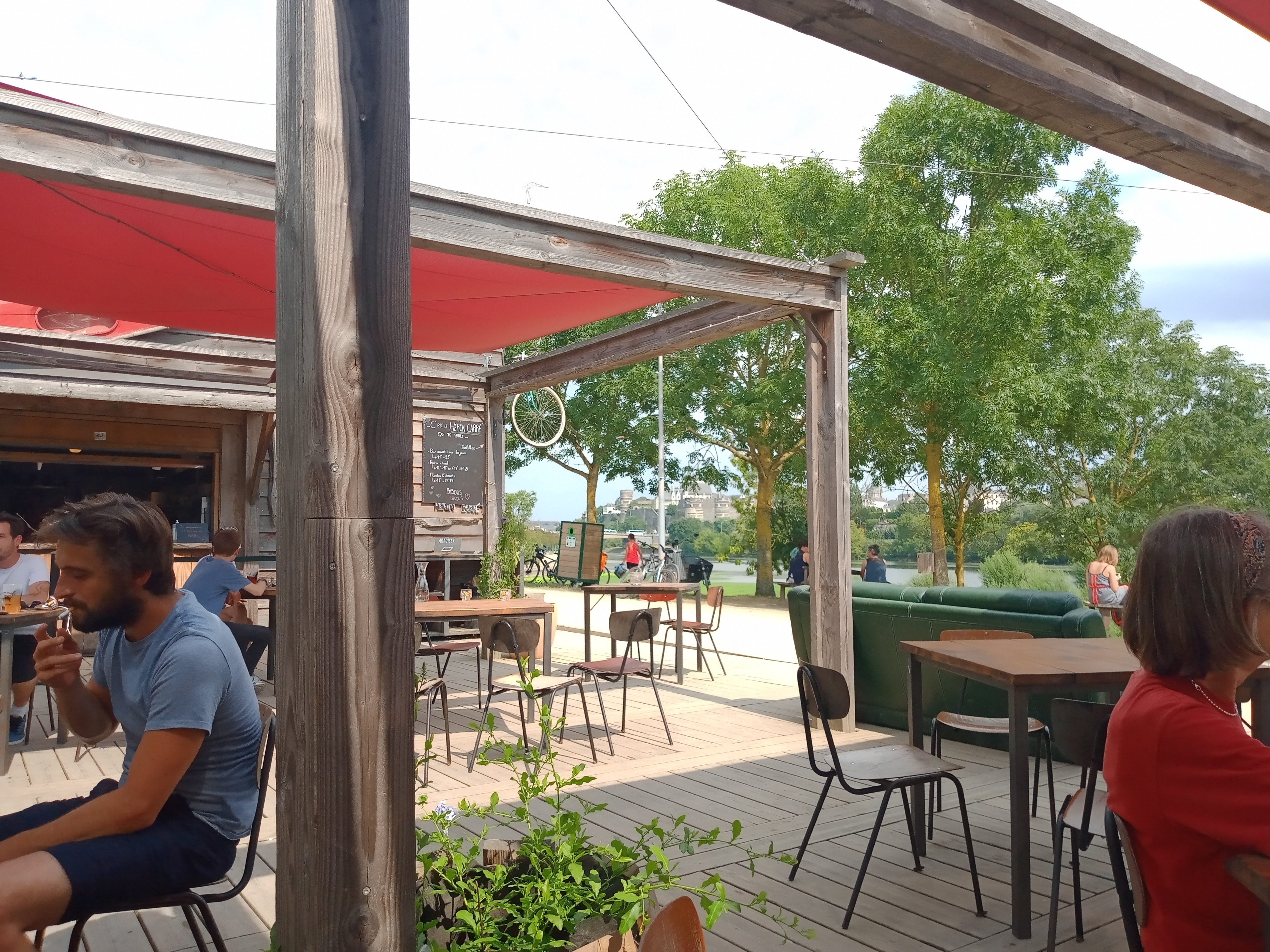 Lieu agréable, les canapés avec vue sur la Maine et le château d'Angers c'est top! Les boissons sont à un prix correct, la restauration un peu élevé mais c'est vraiment bon. Enfants bienvenus même si pas de jouets à disposition ni de chaise haute. Une table à langer dans les toilettes c'est déjà bien. Attention au jus de pommes, les enfants l'adorent mais les guêpes aussi!! Nous avons été un peu envahis, ce qui me fait retirer une étoile parce que ça a failli gâcher notre déjeuner.