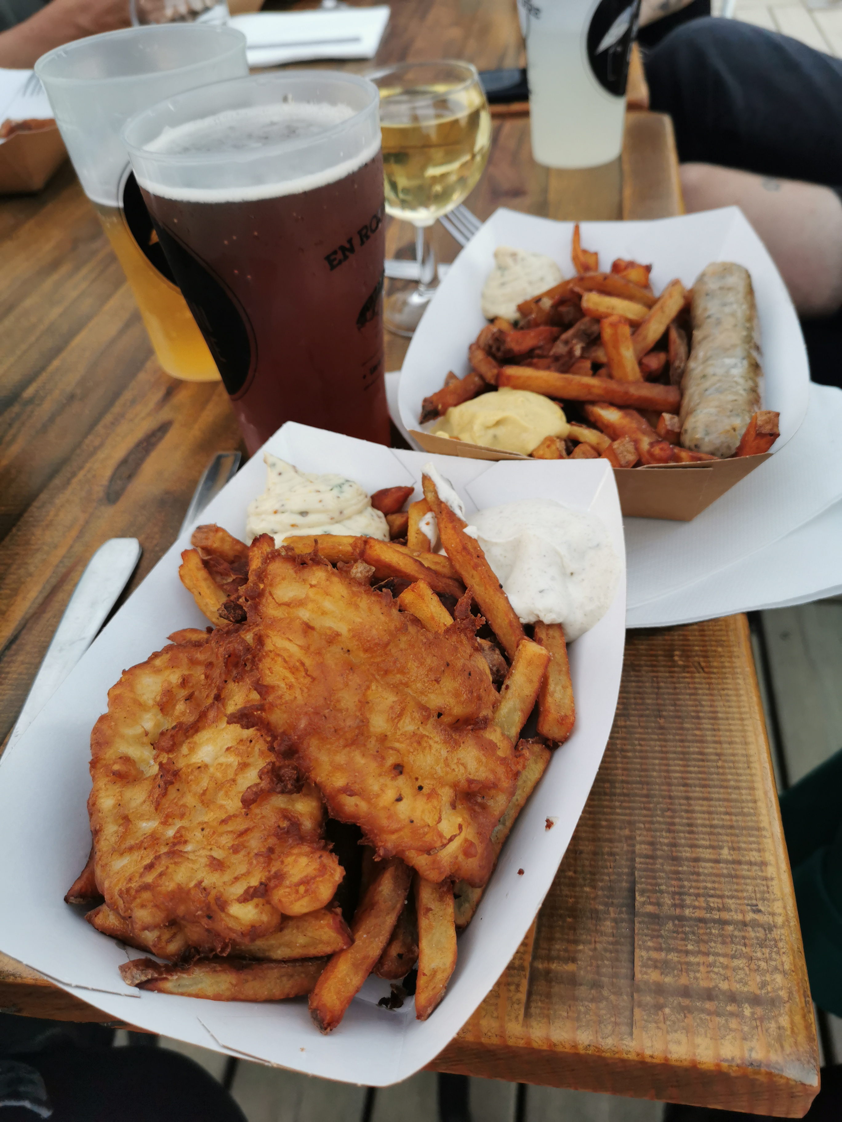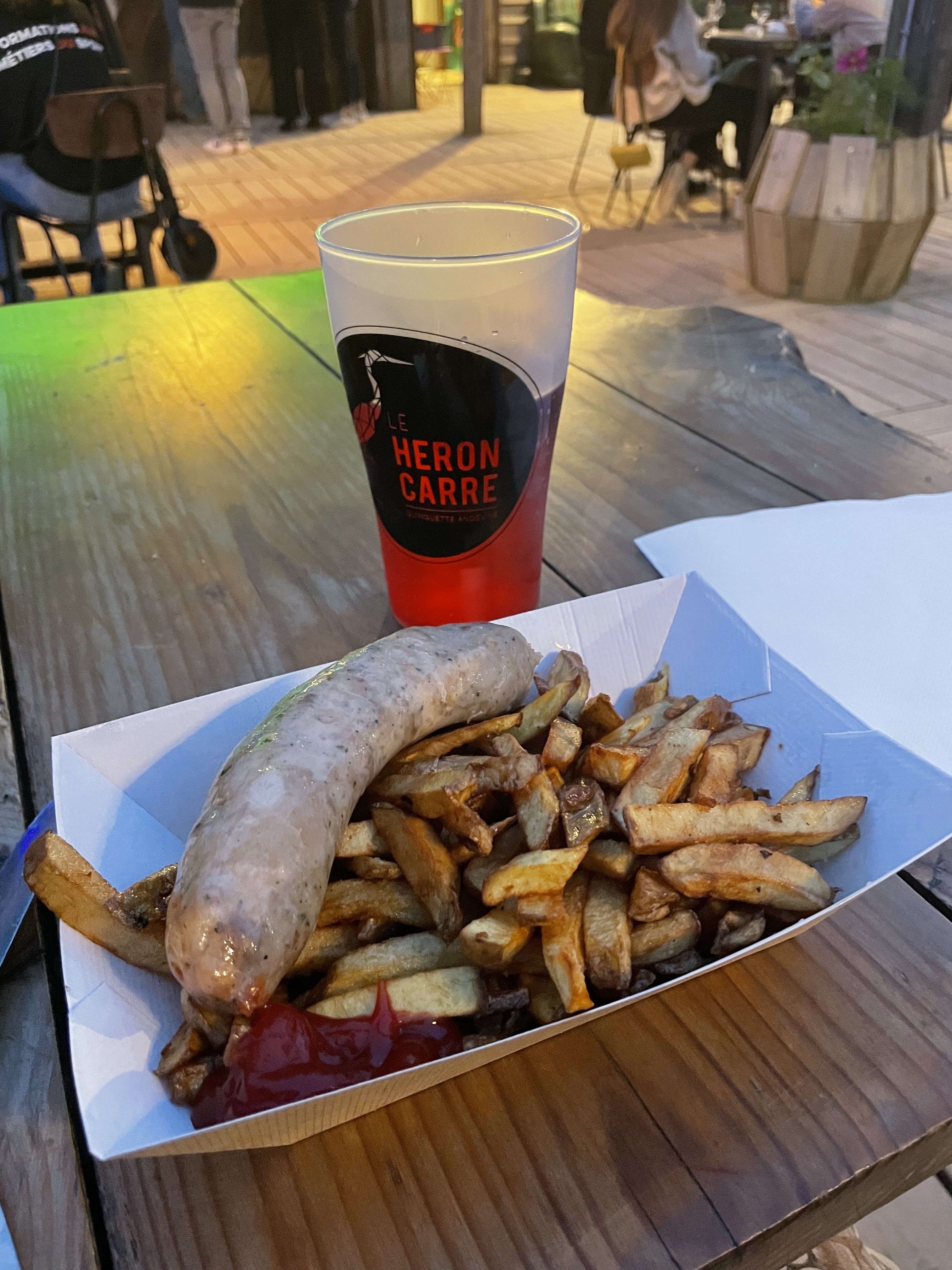 Endroit très prisé le soir beaucoup de monde penez vous y a l avance pour commander soit boisson pour apéritif qui va de la bière au layon en passant par d autres succulente rafraîchissement accueil super sympa également pour manger seul bémol..trop d attente pour avoir ses plats en revanche leur saucisses frites sont tout simplement une tuerie excellent et vraiment délicieux encore une fois quel dommage de refaire une file d attente d au moins 15 mn a deux reprises l une pour commander la boisson et encore 15 mn pour récupérer parfois 20mn ...
