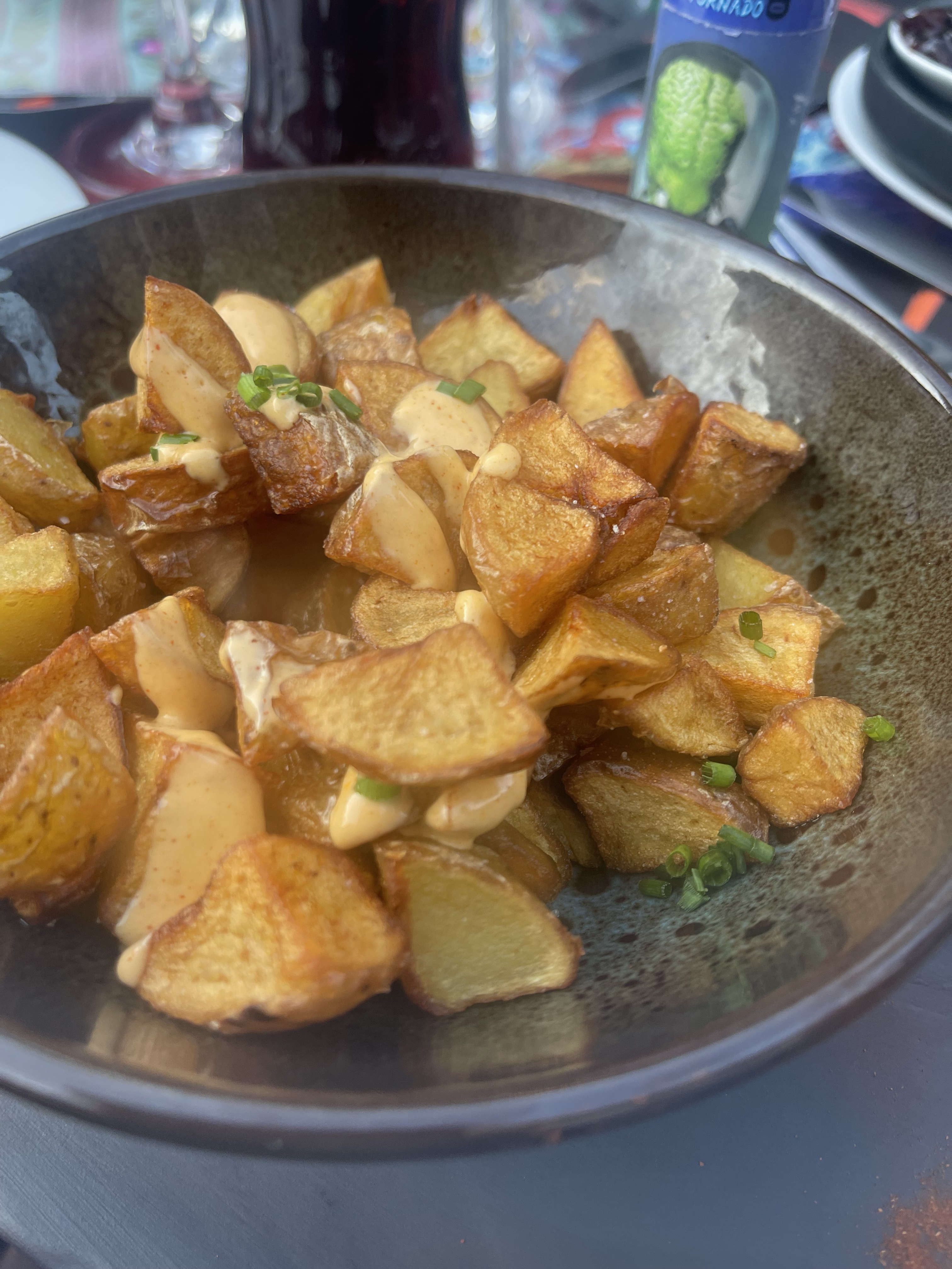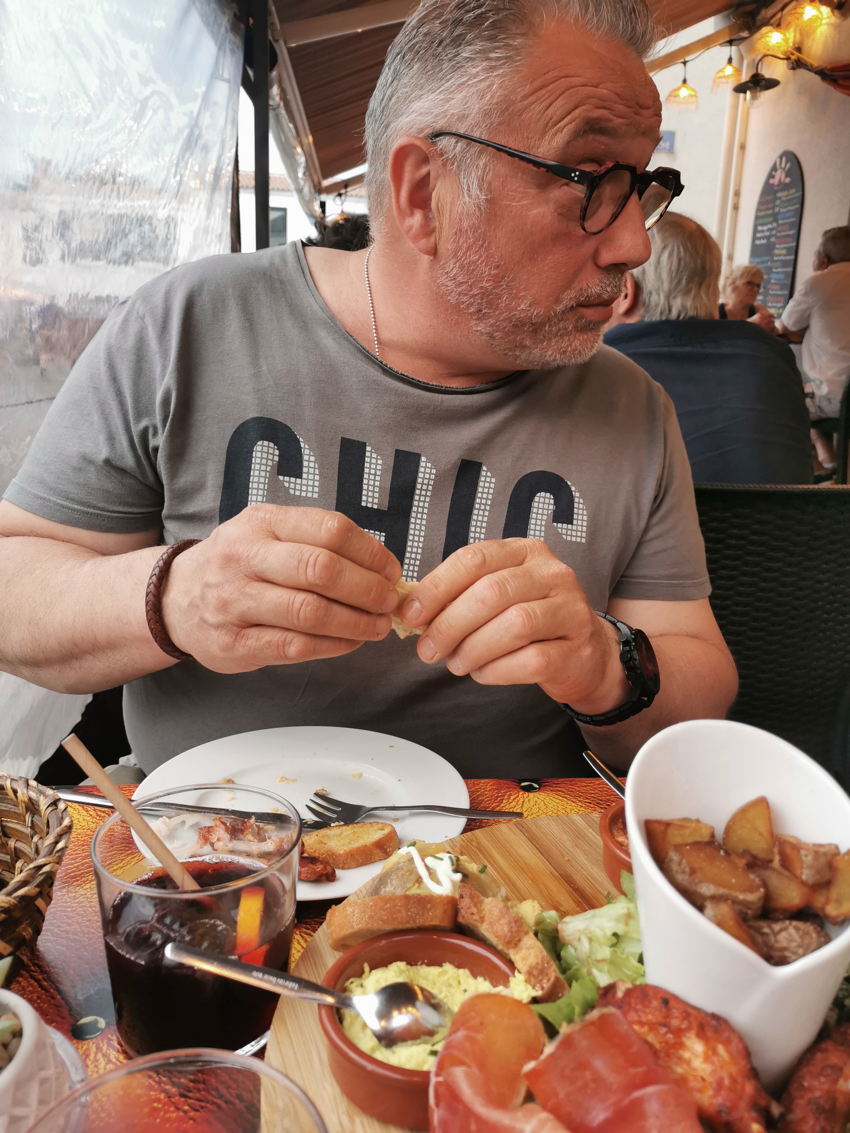 Carte de tapas classique mais bonnes. Le cadre en terrasse était très agréable le soir où nous y sommes allés car la rue est piétonne (bye bye le bruit des voitures) et il y avait un petit marché nocturne sympathiques. Les 2 seuls bémols furent le temps d’attente et le manque d’amabilité d’une jeune serveuse en terrasse. On sentait que l’équipe en salle était un peu « sous pression » voire agacée en cette fin de saision mais bon, il n’en ai pas normal qu’une serveuse vous parle comme si vous l’embêtiez ... mais heureusement lors du règlement de l’addition, nous avons été accueilli au bar par une femme dynamique et attentionnée.