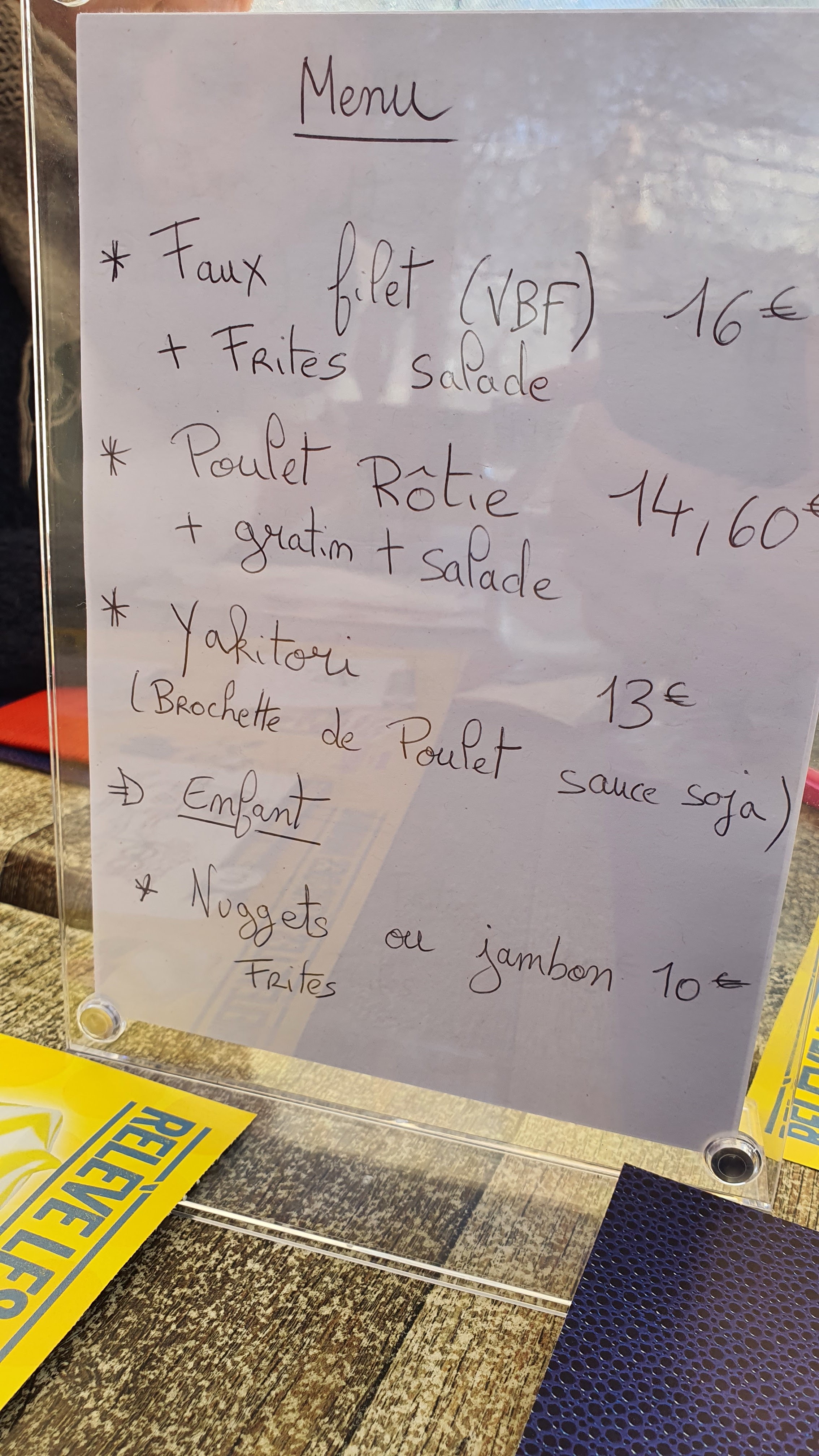 Refuse de faire de l'emporter. 1 couvert ne l'intéresse pas. C'est un accueil chaleureux ça ! Finalement je vais prendre un bon repas juste à la station. Les gens ne veulent plus bosser. Ils veulent des milliards et une bonne retraite, mais ils vous disent Non.