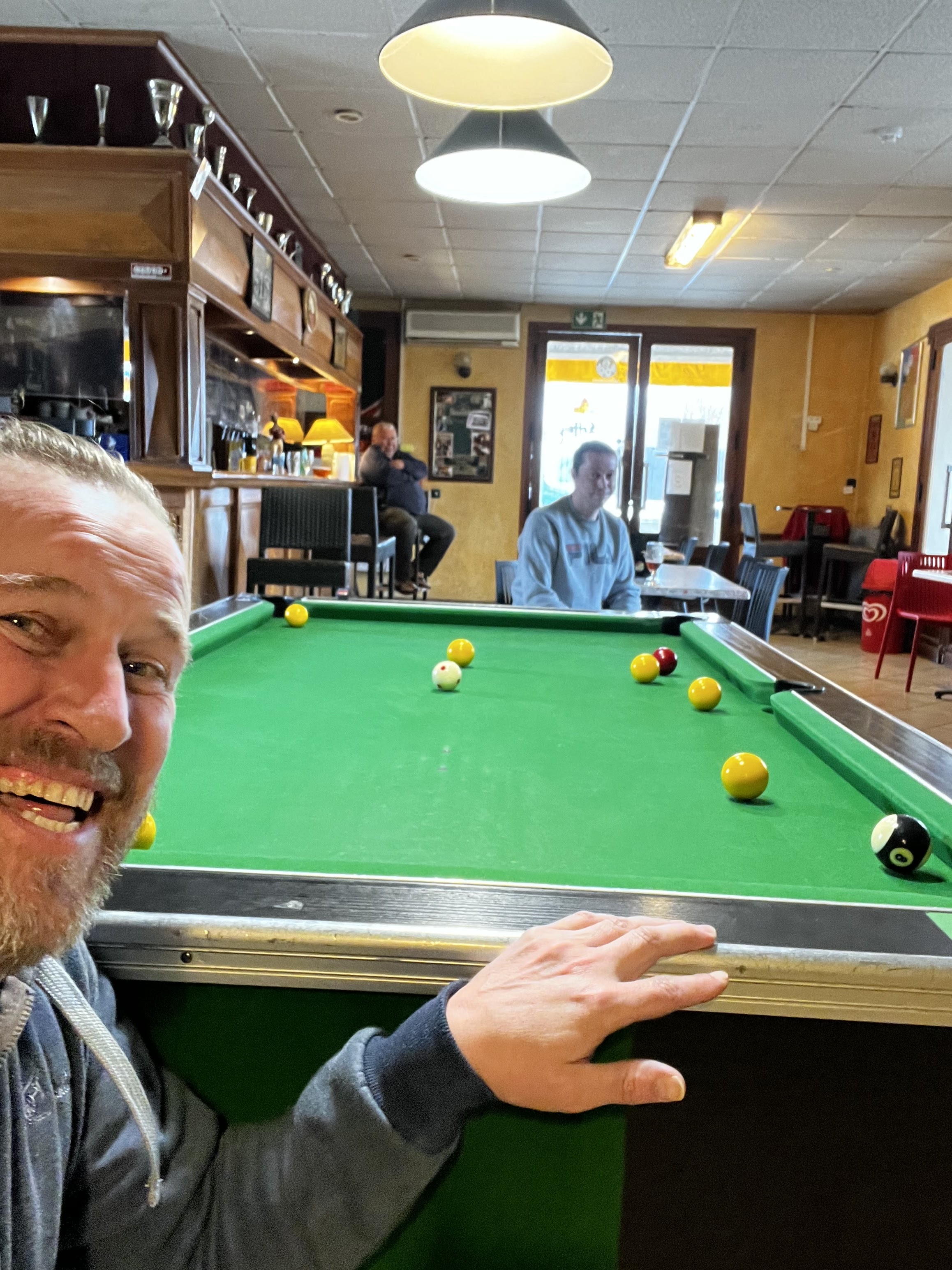 Certainement un bar local avec des tables de billard très conviviales