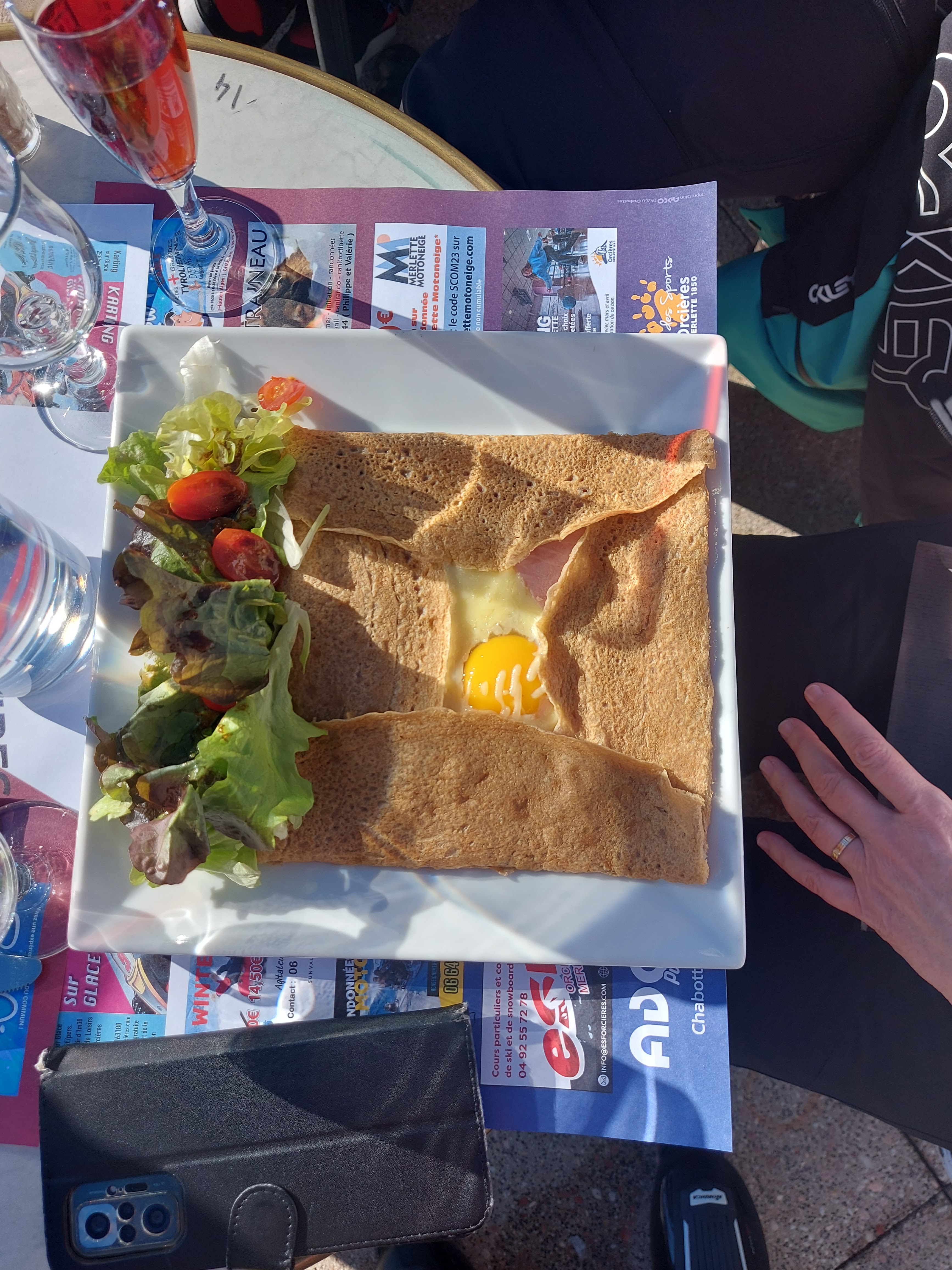 C'est un bar mais ils servent des plats comme des crêpes salées, des croque-monsieurs. Ils font aussi des gaufres et des glaces. J'ai eu la crêpe complète avec jambon, fromage et œuf. C'était correct, assez copieux. Servi avec un peu de salade. Ma femme y est allée chercher une gaufre et il faisait encore froid à l'intérieur (?!). Je suppose qu'ils ne sont pas faits maison... Le service était bon pour le déjeuner. vers 17h00, c'était mauvais, la nourriture était apportée et mangée avant l'arrivée des boissons. Il y a une belle terrasse avec vue sur l'autre côté de la vallée.