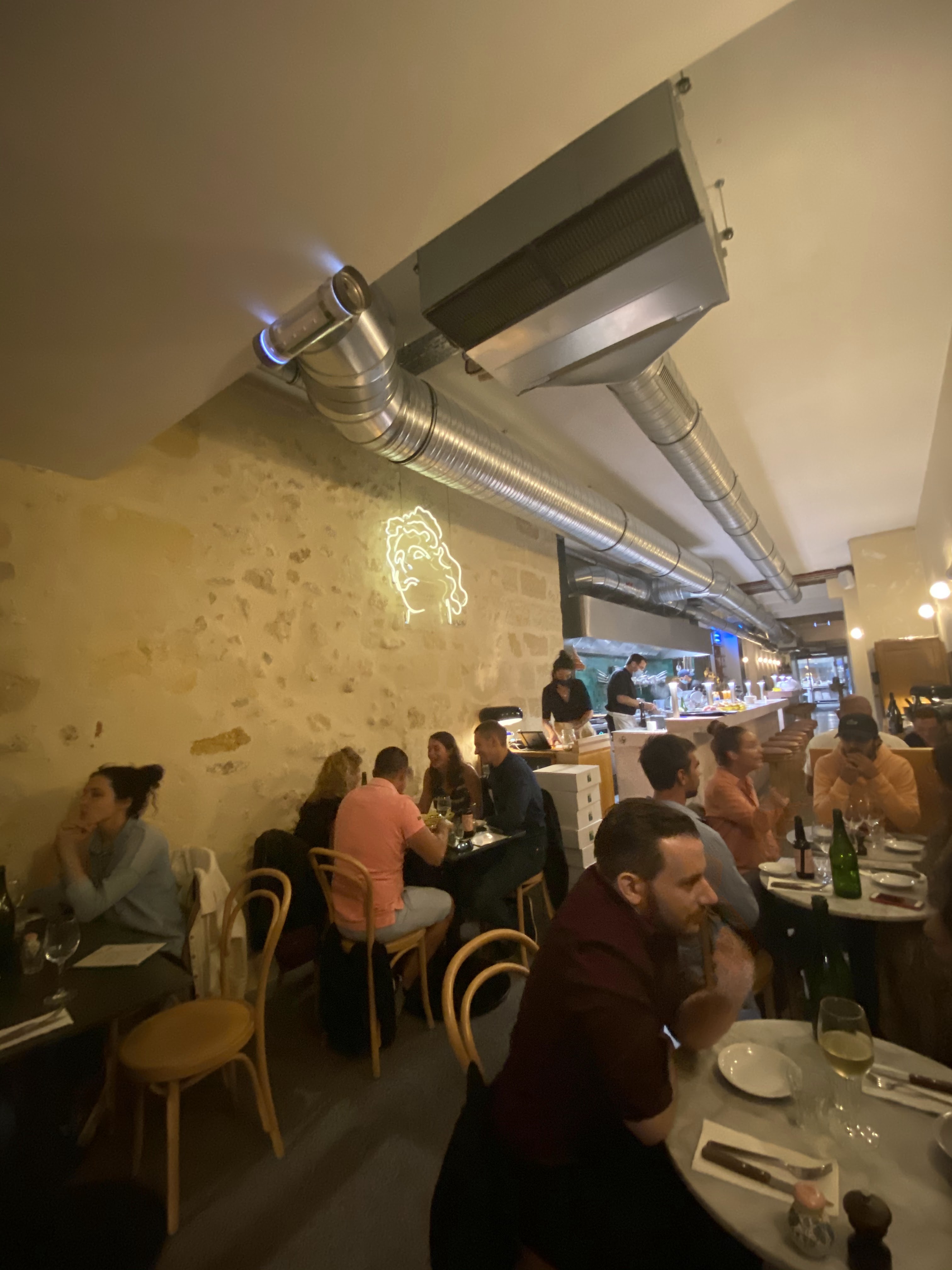 Points positifs : - Super service : la serveuse qui s’est occupée de ma table était absolument adorable et très professionnelle (peut-être pourrait-elle donner des cours aux serveurs parisiens 😬). - J’ai beaucoup aimé la déco (cf. photos). - C’était plutôt bon. Trois points qui me semblent devoir être améliorés : - tout d’abord, j’ai trouvé ce que j’ai pris vraiment cher pour ce que c’était : 10€ (cf. photo) pour deux cœurs d’artichaut, certes très bons mais je m’attendais à une entrée beaucoup plus copieuse (cf. photo) à ce prix-là ; - quand on est végétarien et qu’on n’aime pas l’huile de truffe, ça devient compliqué 😅. Une carte proposant peu de plats est souvent un gage de qualité mais là... on est plus sur des tapas que sur des entrées et plats, à l’exception des 3 plats de pâtes... J’ai cru comprendre que la carte, très resserrée, change souvent, peut-être serait-il donc opportun de penser un peu plus aux non carnivores ds la prochaine version ? - enfin, c’était extrêmement bruyant à l’intérieur le soir où je suis venue. Musique au demeurant très sympa mais quel brouhaha... Peut-être n’est-ce pas le cas tous les soirs, je ne peux parler que de mon expérience...