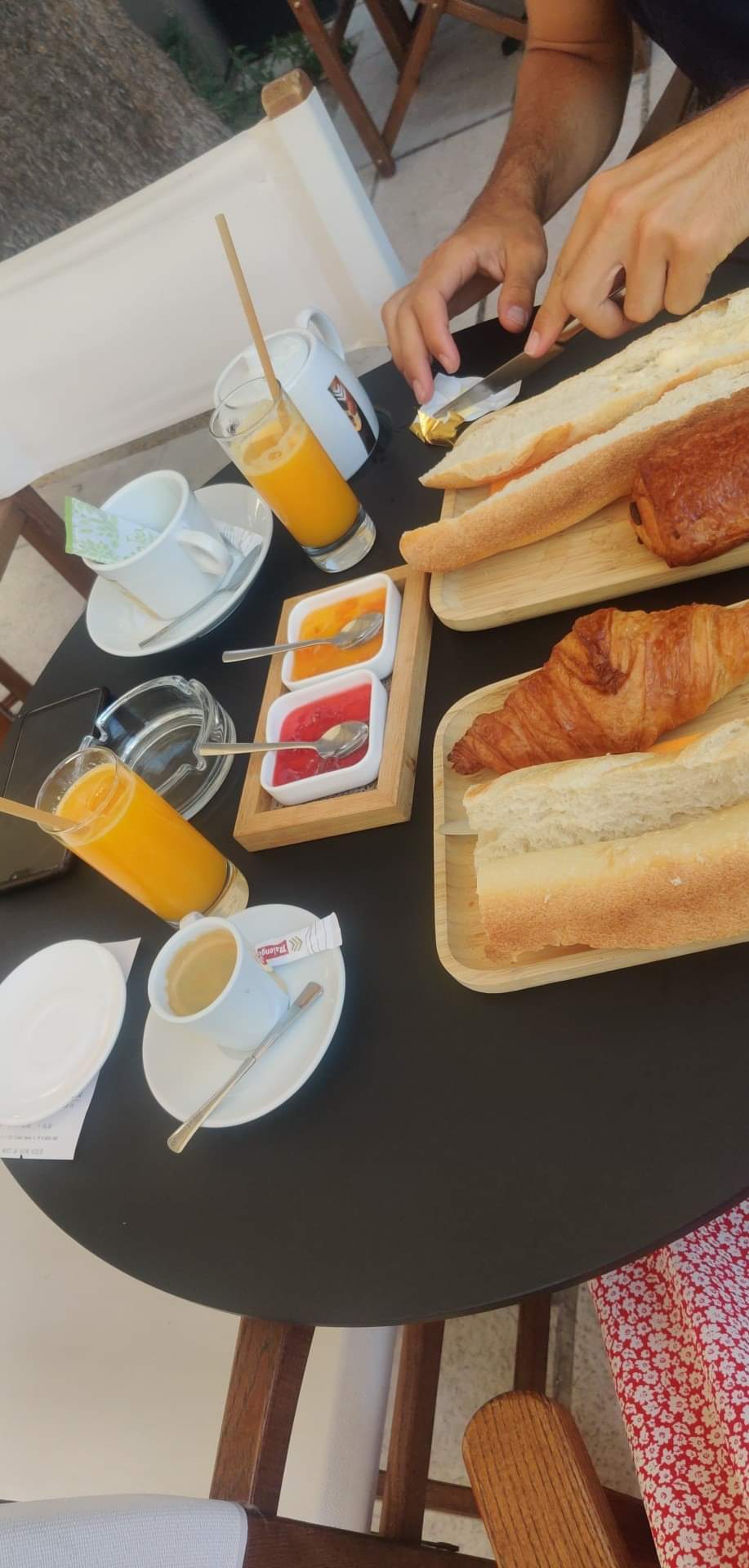 Super petit déjeuner très complet. Croissants, baguette fraîche et croustillante, pain complet et assortiment de confitures et coupelles de fruits...Bref c'était extra. On s'est régalées