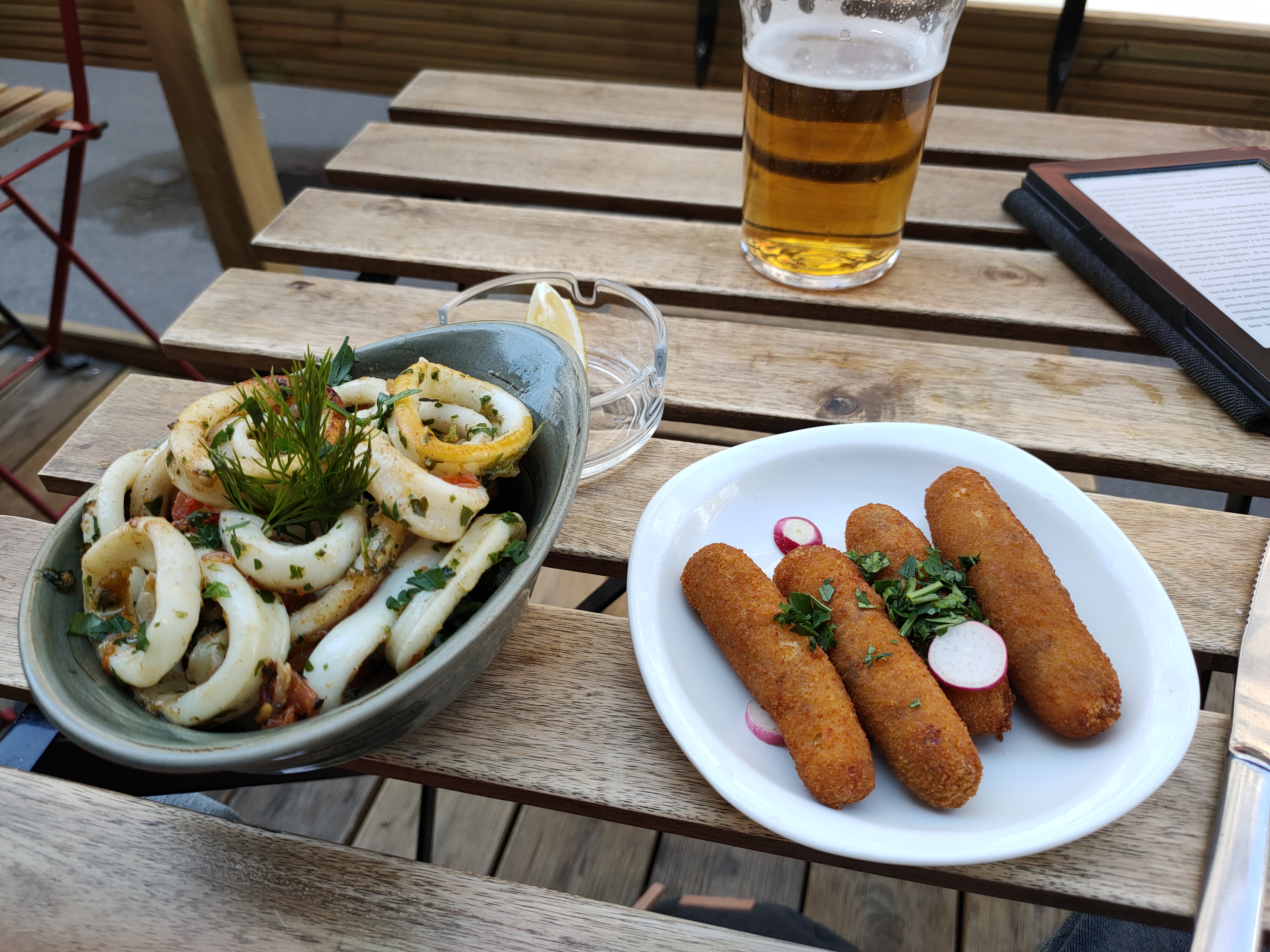 Bel accueil, très bon service. Tout est appétissant sur le menu. Une fois notre choix fait et nos plats sur la table, on avait tout juste la place pour les couverts. J'ai bien aimé les brochettes de thon, les légumes à la plancha, les croquettas, les patatas bravas. En fait tout est trop bon.