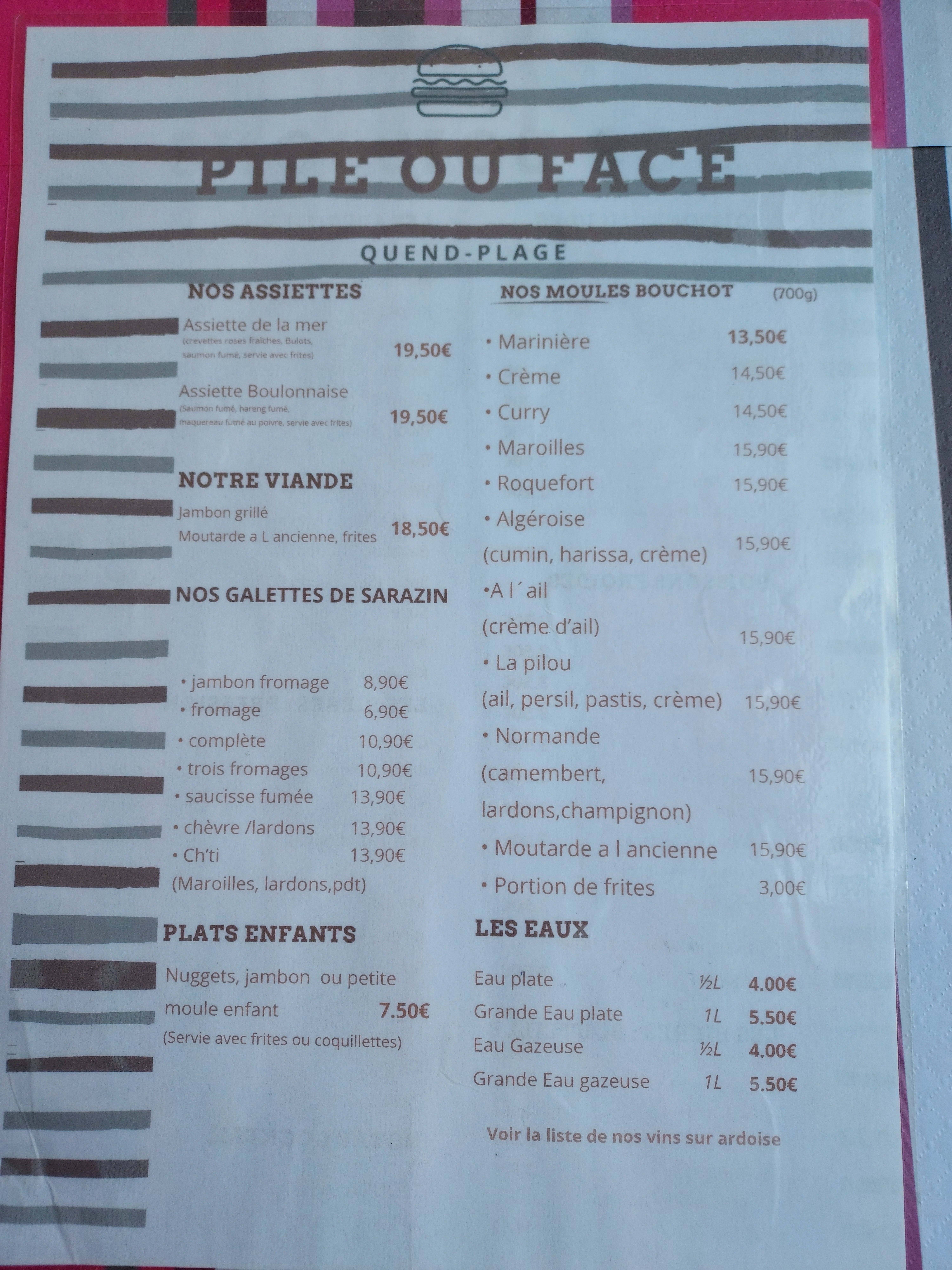 Le Pile ou Face est typiquement un de ces établissements où le (la) patron(ne) ne fait pas ce métier par plaisir des gens ou de la bonne cuisine mais uniquement pour le gain d’argent. Heureusement il n’en existe pas beaucoup. Généralement on ressent au minimum la volonté de bien faire. Ne vous faites pas avoir par la file d’attente, ils sont simplement bien placés. Ce n’est sûrement pas parce que la nourriture y est bonne ni de qualité. Les frites sont trempés dans l’huile chaude avant d’atterrir directement dans l’assiette. Pareil pour les entrecôtes. N’espérez pas une entrecôte grillée. Quand aux burgers, sachez que leurs steaks hachés arrivent de chez leur fournisseur pré-cuits et donc ce sera très sec. Autant manger du Mc do, vous économiserez 13€ par burger. On nous a expliqué que le côté sec passait grâce à la sauce. Quand à la qualité nutritive ca n’a bien sûr ça aucune importance.