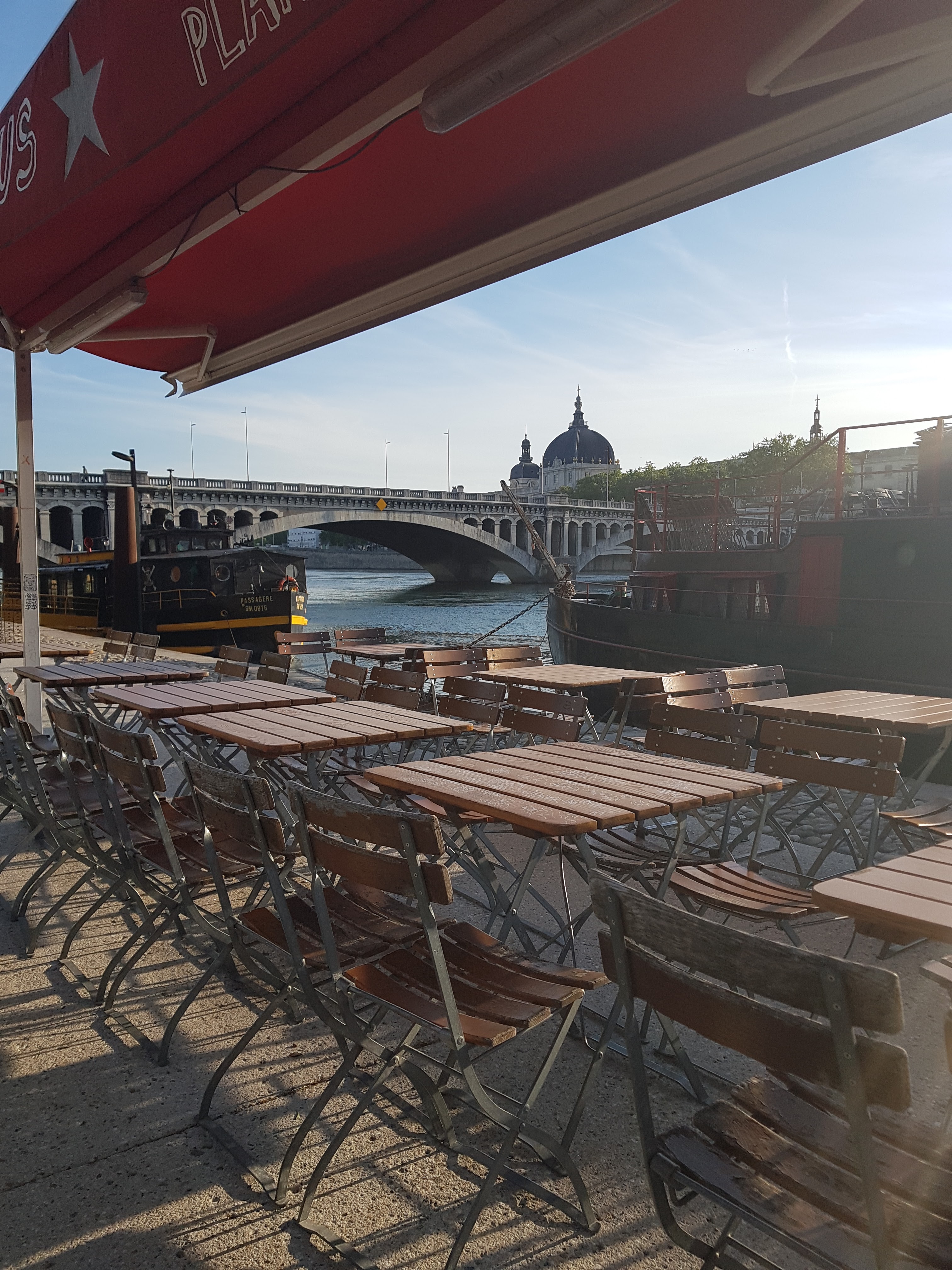 Lieu sympa pour boire l'apéro sur les quais du Rhône. Quelques points à améliorer : Quand j'y suis allé le service était au bar qui est sombre bruyant et peu sympathique. Le prix de la pinte de bière est élevé. Les tables sont sales. Et chose que je déteste on enlève les verres quand ils sont vides ce qui me fait automatiquement partir plutôt que de re consommer. Dommage car le cadre est magnifique.