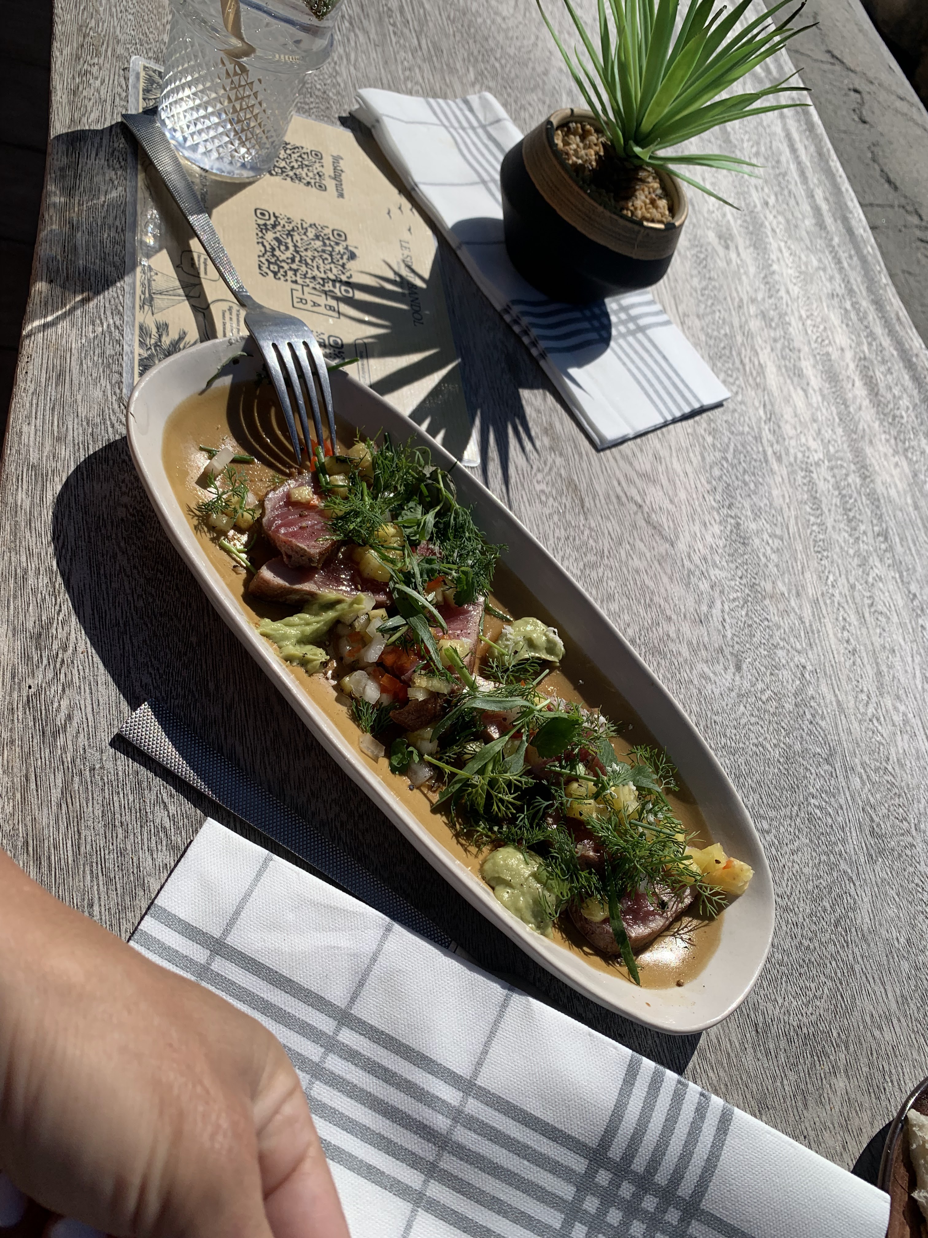 C’est rare mais voilà un havre de paix en plein mois d’Aout à Bandol. Bon ok petite sélection par le tarif mais pour les aficionados du calme c est juste perfect. Le cadre est magnifique , des assisses super confortable et une vue majestueuse face à la mer. Pour le déjeuner , tataki de bœuf et tataki de thon avec une petite frite maison , on s est régalé les papilles . Merci à l équipe super sympa de plus.