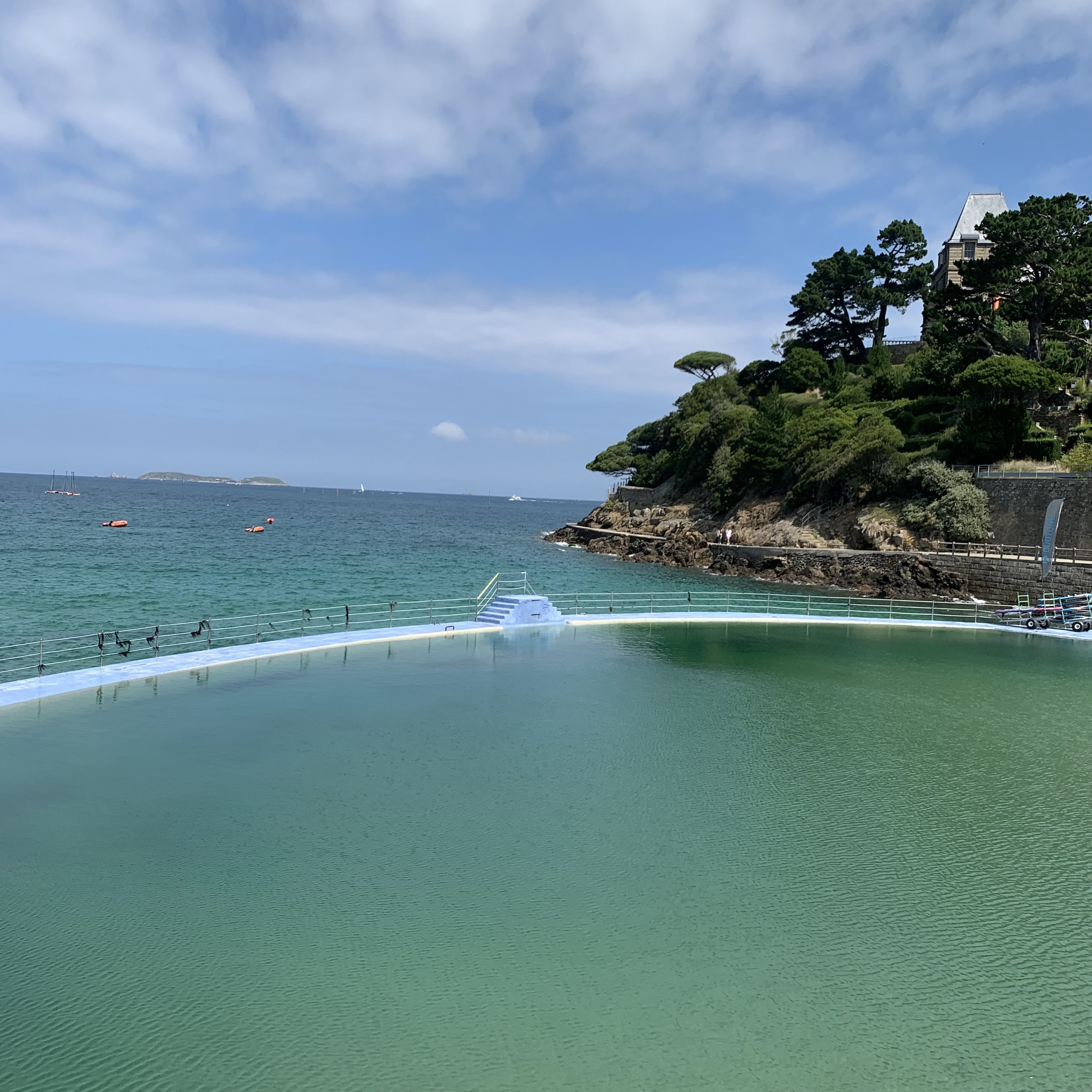 Bar sympa au bord de la piscine à Dinard . Bel endroit pour prendre un verre avec une planche de la mer ou de charcuterie. Avec une belle vue sur la mer et à l abri du vent ...fort agréable