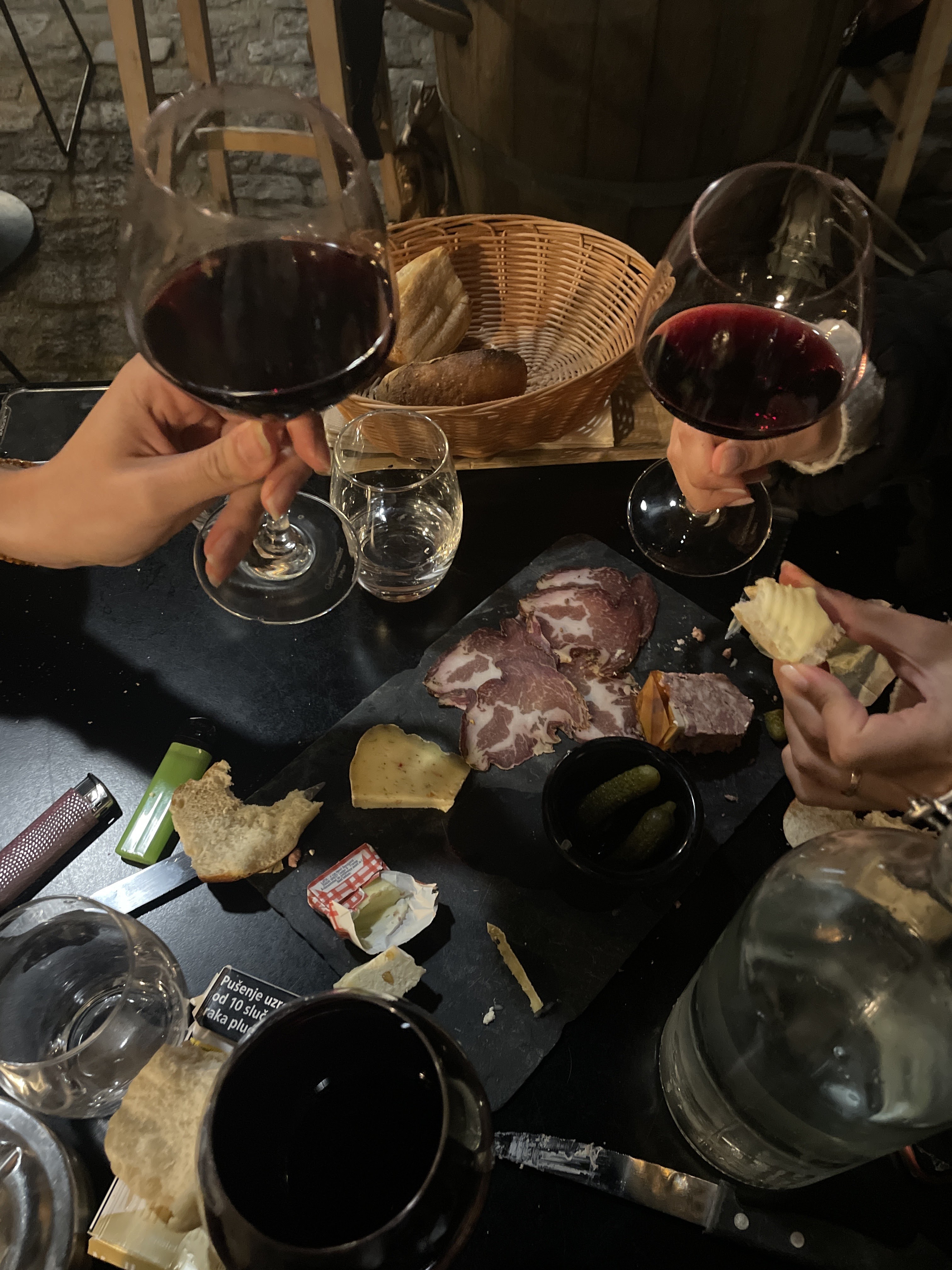 Un petit endroit, avec une charmante cour où sont servis des vins locaux, des fromages et des charcuteries. En tant qu'étrangers, nous comptions sur le gérant pour les vins et un plateau de fromages. Tout était parfait, le vin blanc d'une région que je ne connaissais pas jusqu'à présent était une surprise. Vous pouvez choisir combien de fromages vous souhaitez déguster et nous en avons choisi 4, laissant le soin de créer le mix au gérant. Il a très bien choisi et nous avons été très satisfaits. Prix très honnête dans la zone touristique ! Super recommandé !!!