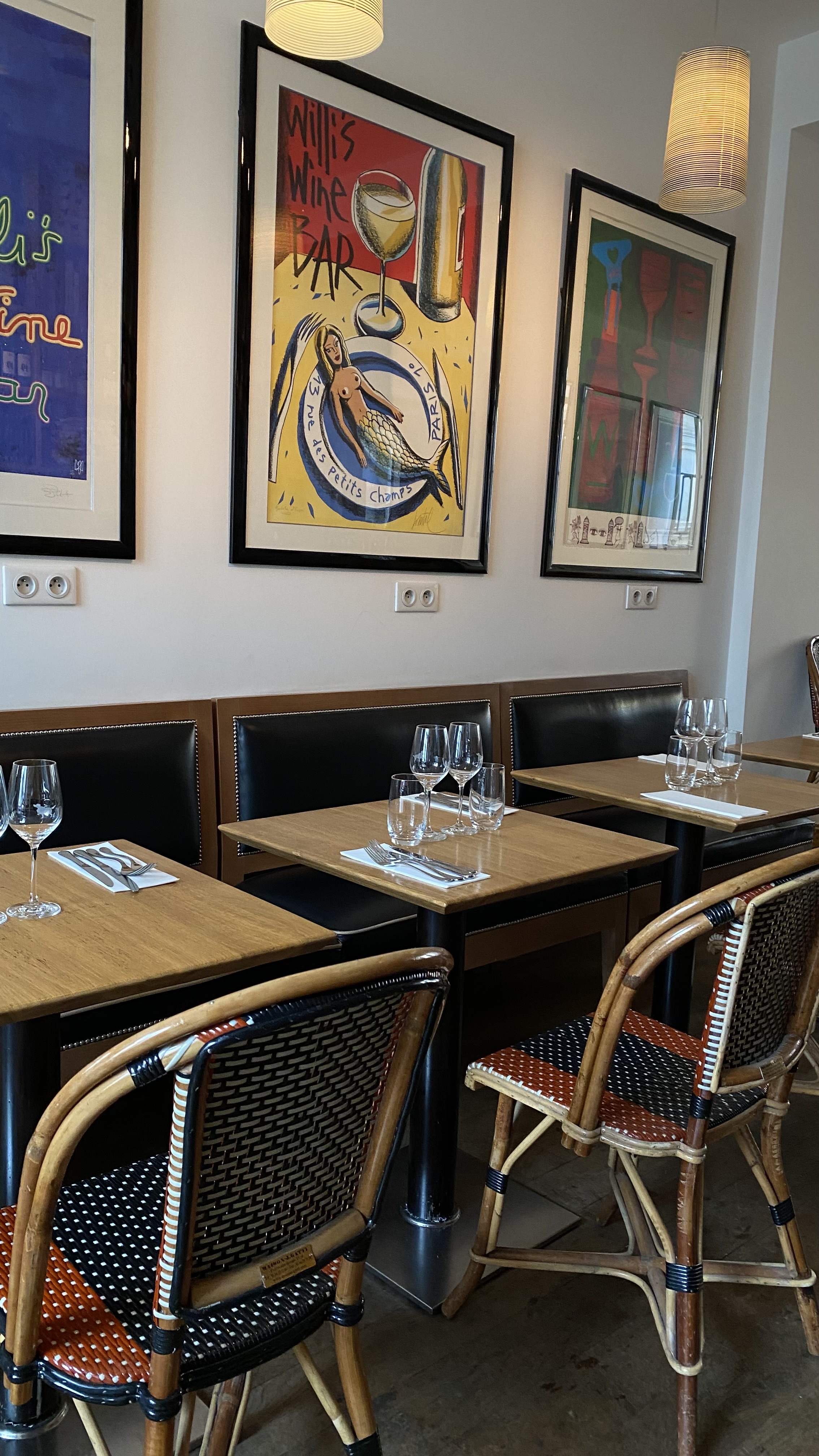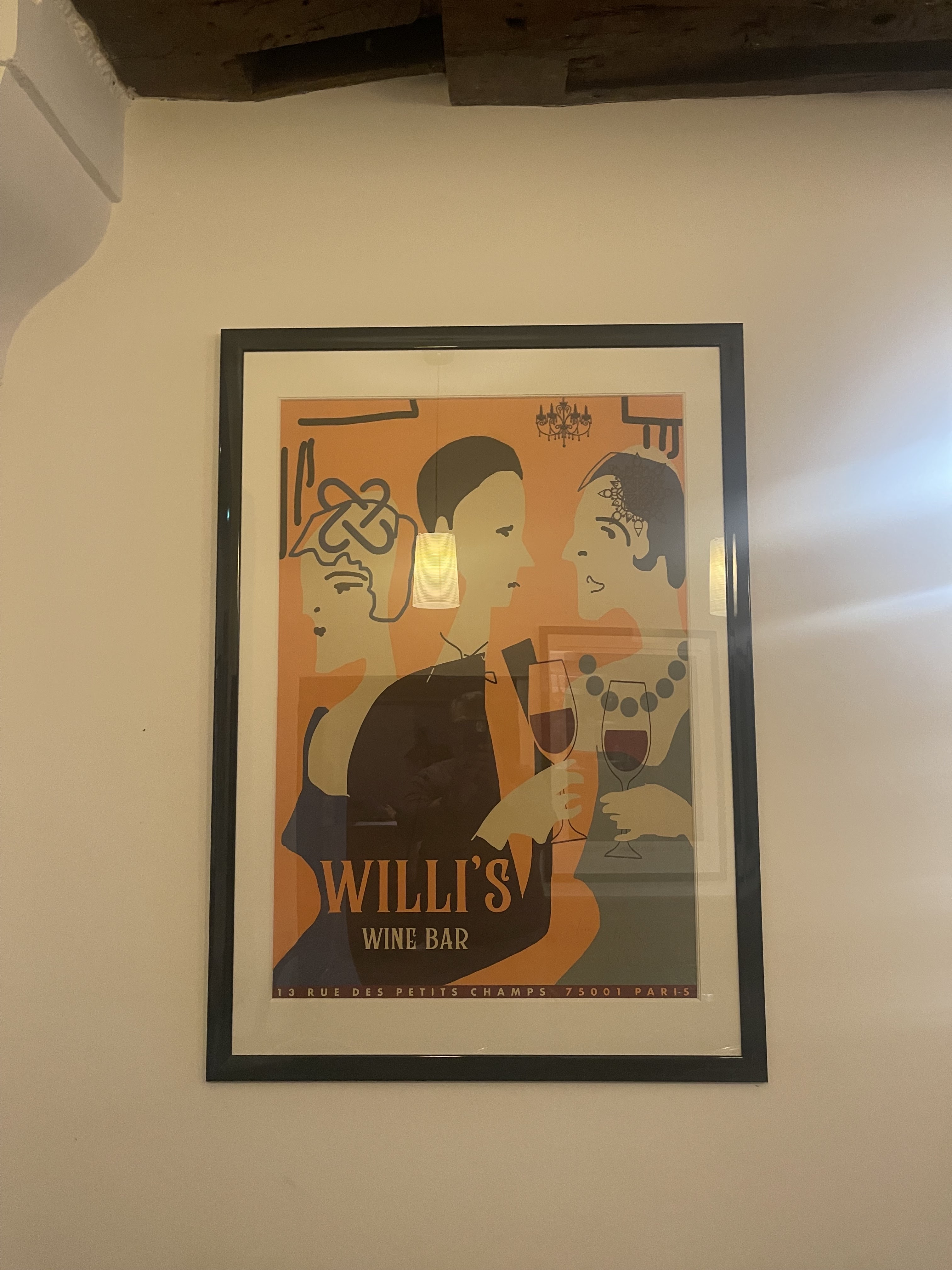 Nous sommes venus lors de notre tout premier voyage à Paris il y a 25 ans pour un verre de vin et une assiette de fromages l'après-midi, et nous l'avons apprécié depuis. Nous avons une collection de leurs affiches que nous apprécions chaque jour. Notre dernière visite chez Willi était la première en 14 ans; il l'a toujours.