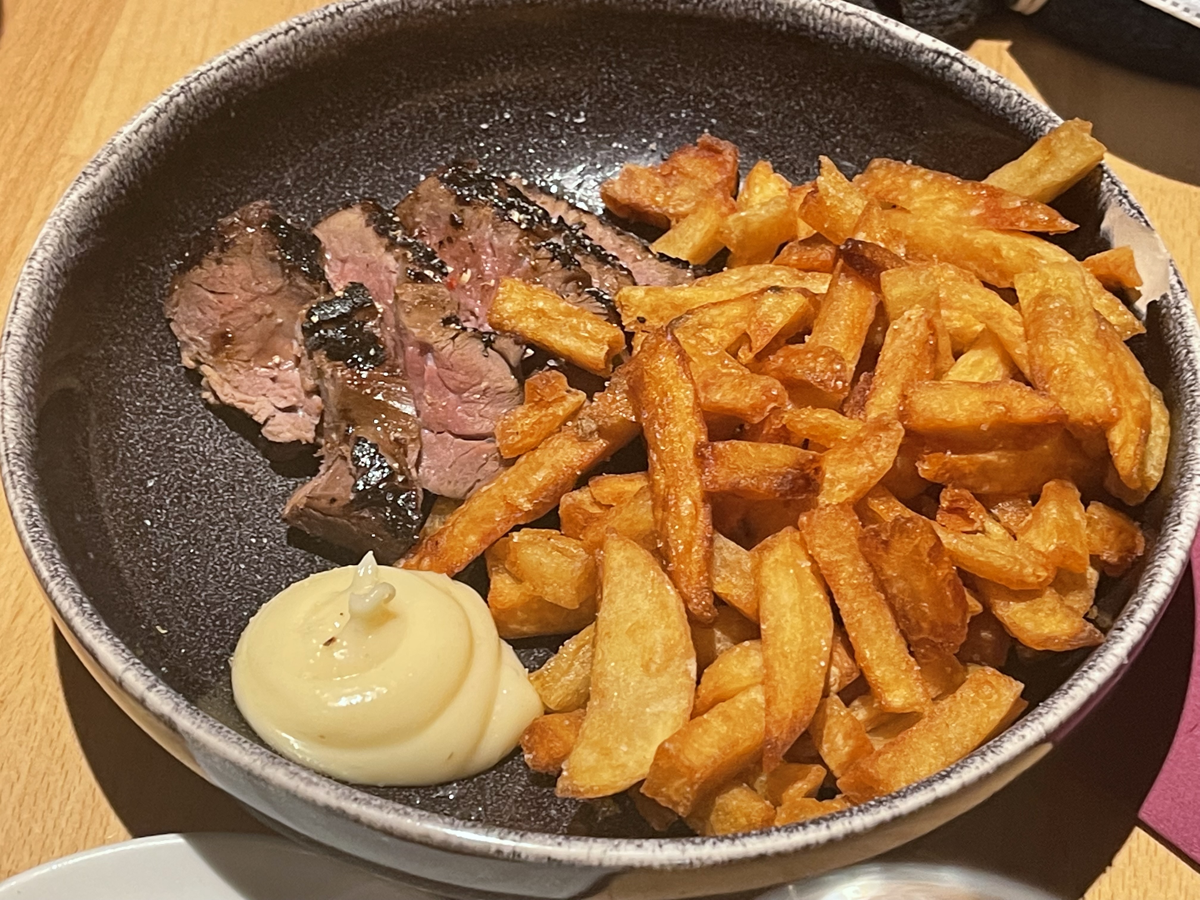 Nous avons eu une belle expérience ici ce soir. Venant d'arriver et n'étant là que quelques jours, nous voulions essayer quelques champagnes. Nous avons fini par avoir deux verres chacun. Chacun était distinctif et agréable. Nous avons beaucoup à apprendre sur le champagne. Nous avons eu le risotto (avec du poulet), qui était correct, mais qui ressemblait davantage à du riz qu'à un risotto crémeux et au steak (rumproast) avec des légumes, ce qui était plutôt bon. Le personnel était super, prêt à travailler avec notre barrière linguistique. Nous recommandons.