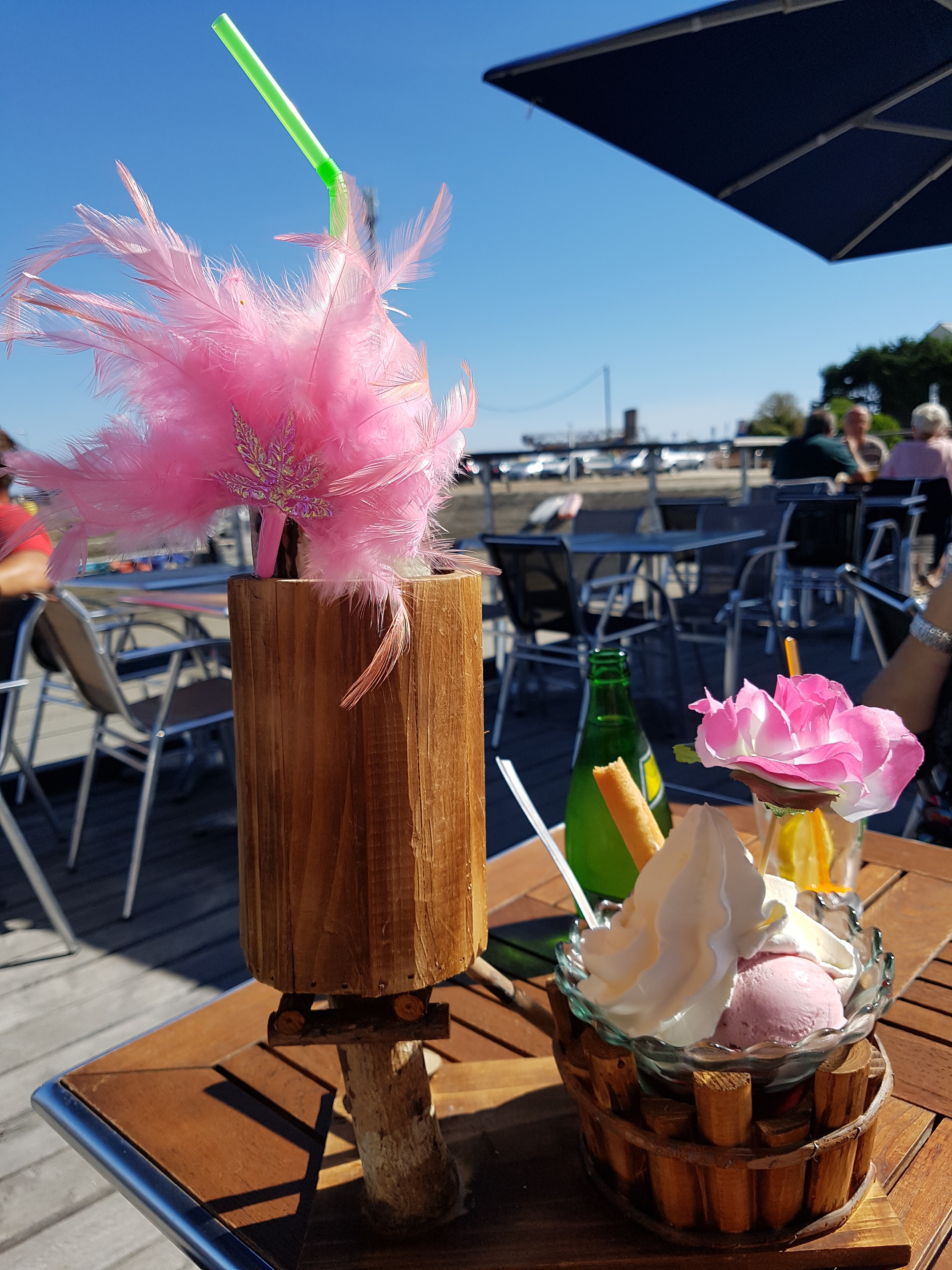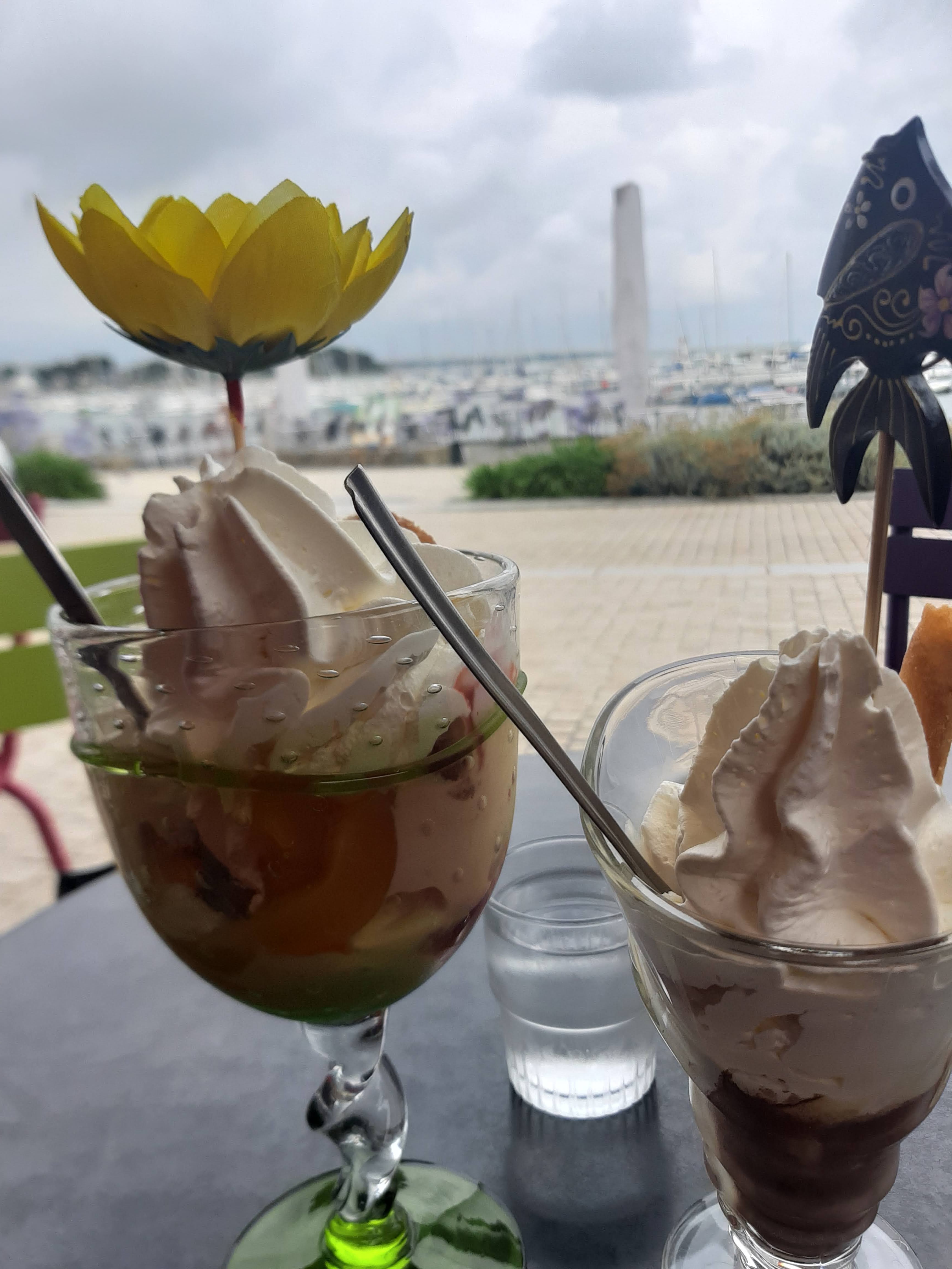 Super escale, en terrasse au soleil avec vue directe sur le port, au milieu d'une balade à vélo. Il y a d'ailleurs à proximité de quoi les garer. Belles coupes de glaces pas chères du tout (autour de 7€). Clin d'œil particulier au jeune serveur que je pensais déguisé en banane pour son bizutage, mais était en réalité habillé en bouteille de vodka !