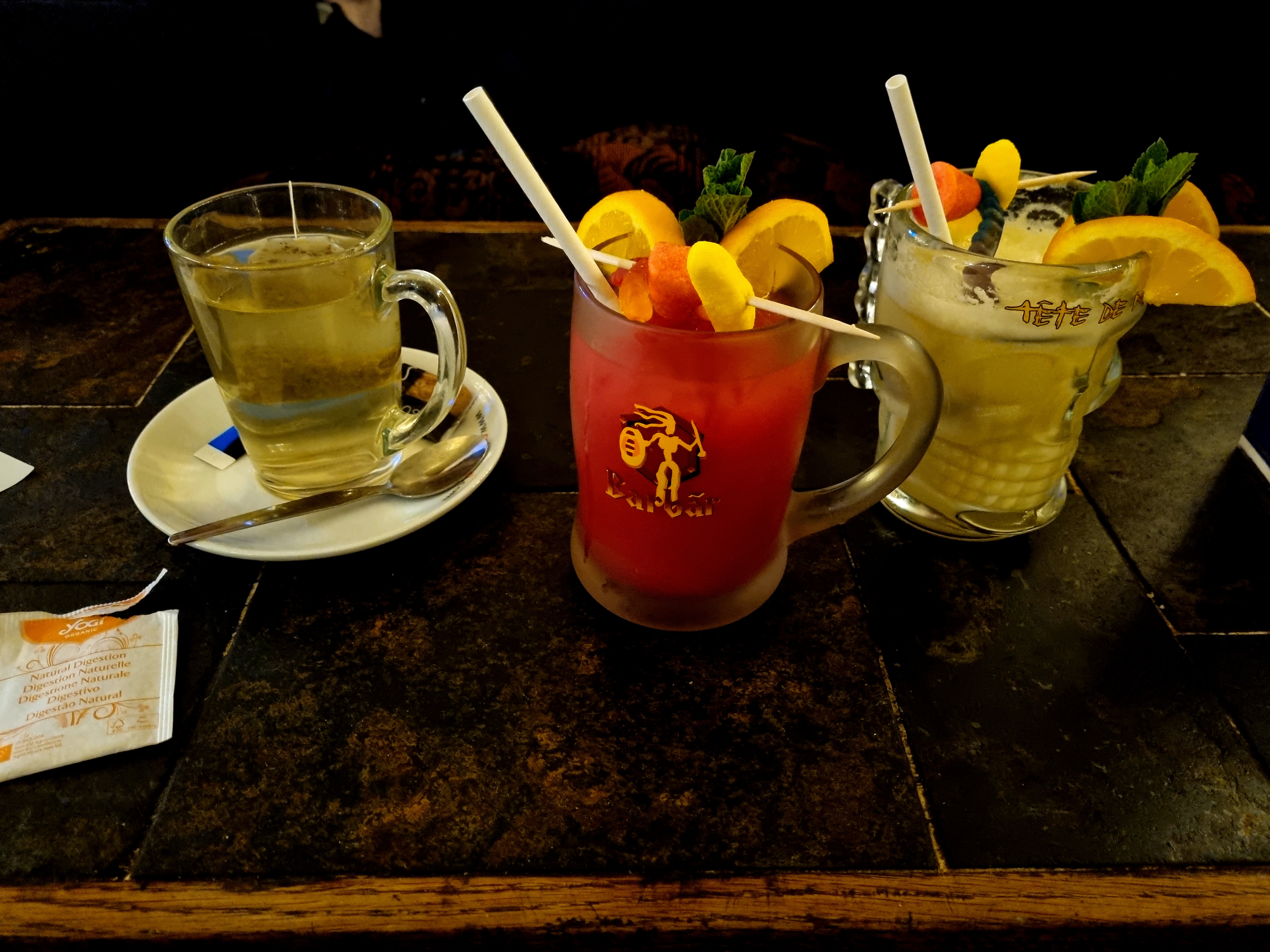 Plus d'une demi heure pour être servis (4 conso en bouteilles, un thé et un thé glacé maison), problème récurrent de de rapidité dans l'établissement. La commande arrive avec à la place du thé glacé commandé par une femme enceinte... un punch. On fait remarquer au serveur que le thé à la pêche paraît étonnement épais, garni de rondelles d'orange et sent très fort l'alcool et n'a pas le goût de pêche. Il nous répond que c'est quasiment sûr et certain qu'il s'agit d'un thé, qu'il connaît les recettes et reconnaît les boissons à leur aspect, mais que dans le doute il va revoir avec le barman. Il revient avec un thé ressemblant enfin à un thé. On lui redonne une chance, et il retorque si si c'était bien la même chose mais en bas ils se sont trompés dans les proportions. Des erreurs ça arrivent, aucun soucis avec ça, mais de là à mentir sciemment aux clients, surtout quand l'erreur est flagrante, de surcroît dans un contexte de contre indication médical, c'est réellement non professionnel et totalement pathétique.
