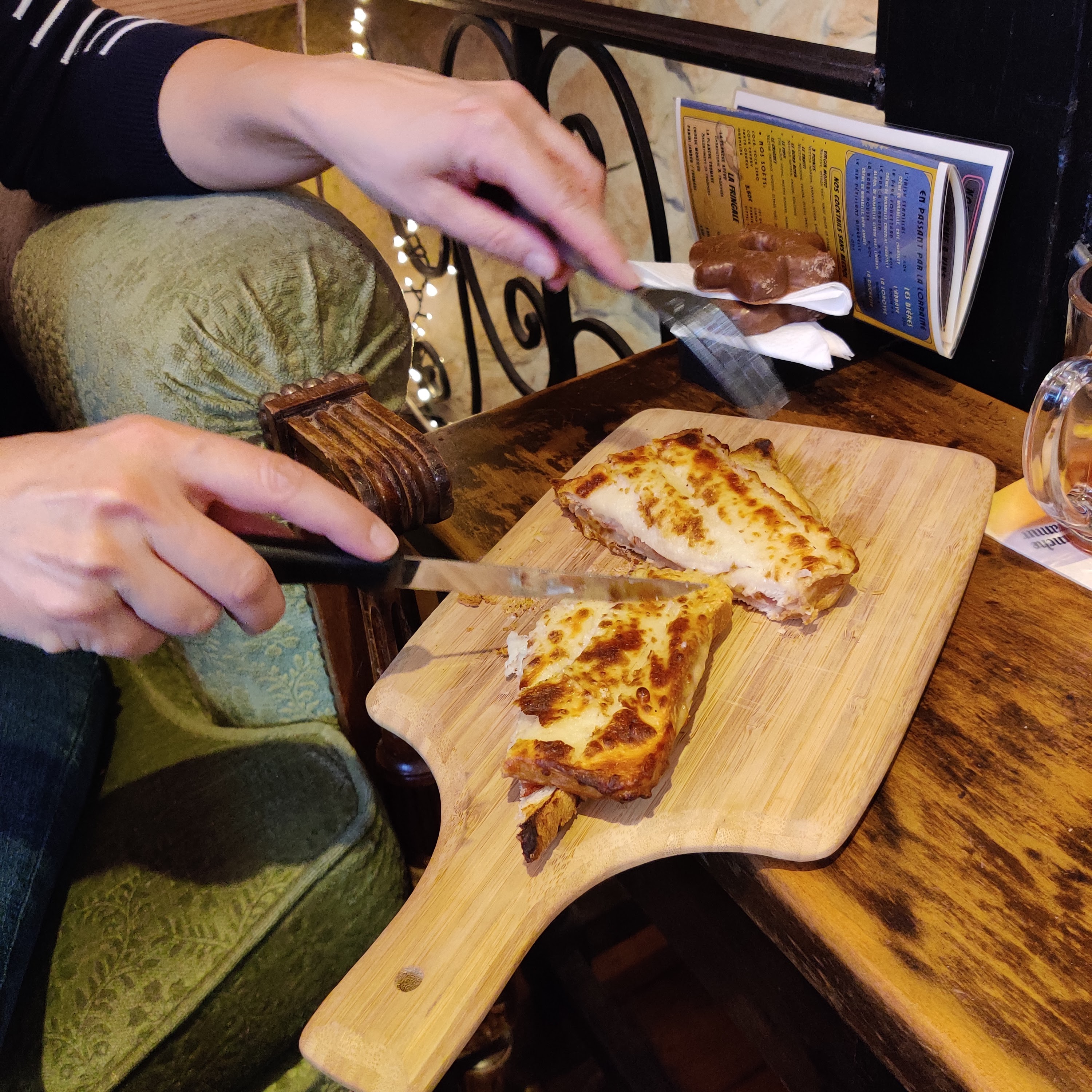 Ce jour là avec mon mari nous avons juste bu moi un chocolat chaud qui était excellent et mon mari une bière et je pense que la prochaine fois on restera pour déjeuner La serveuse était très sympa Je recommande cet établissement