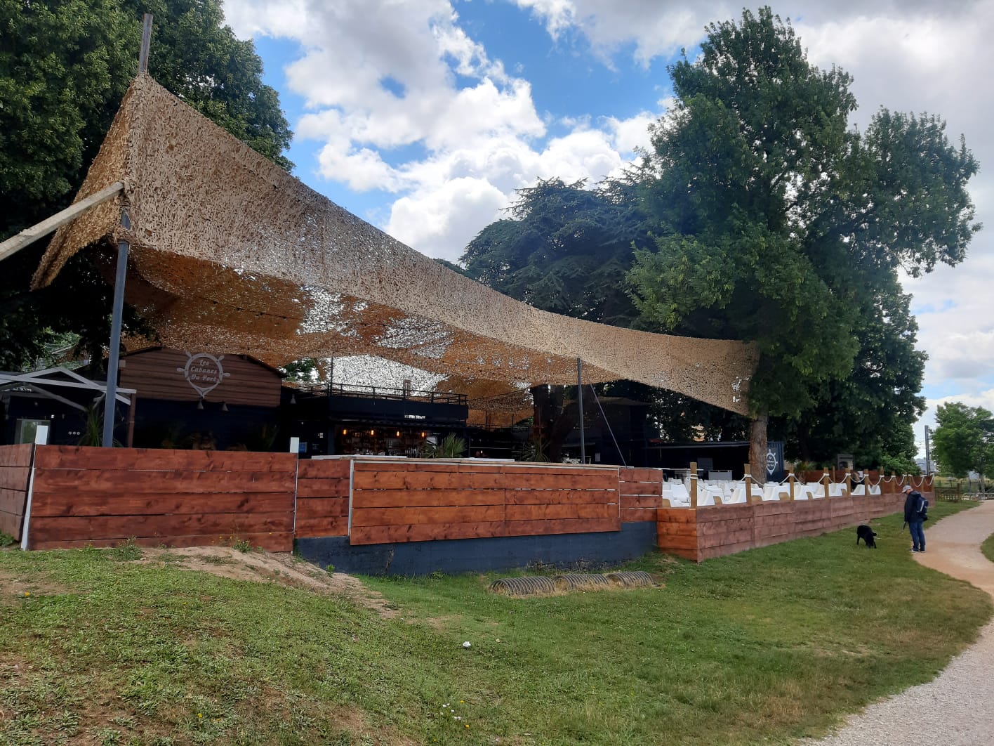 L’ambiance est sympa et le cadre est idyllique… par contre, la restauration est à fuir : je crois n’avoir jamais aussi mal mangé de ma vie : pour 14€, une pizza pas cuite, servie avec retard, avec comme seule garniture une cuillerée de mauvaise sauce tomate, 2 lambeaux d’aubergine et environ 50 olives en conserve jetées pêle-mêle. Les burgers et les tartines, sans atteindre le niveau apocalyptique des pizzas, pourraient aussi figurer sans problème dans le prochain épisode de Cauchemar en cuisine ! Dommage car le public va vite fuir alors que le cadre et le bar sont vraiment super agréables… Dernier point : ne soyez pas surpris si les commentaires Facebook sont tous élogieux : le modérateur m’a confirmé qu’il supprimait tous les commentaires négatifs (ne pas prendre en compte les critiques étant bien sûr le meilleur moyen de s’améliorer, comme chacun sait…)
